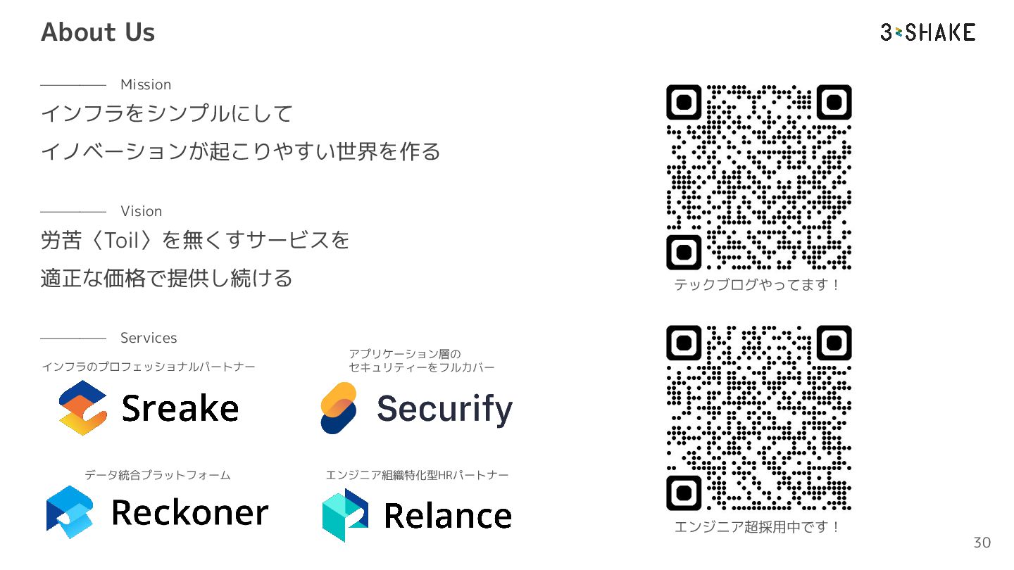 About Us ————— Mission インフラをシンプルにして イノベーションが起こりやすい世界を作る ————— Vision 労苦〈Toil〉を無くすサービスを 適正な価格で提供し続ける ————— Services 30