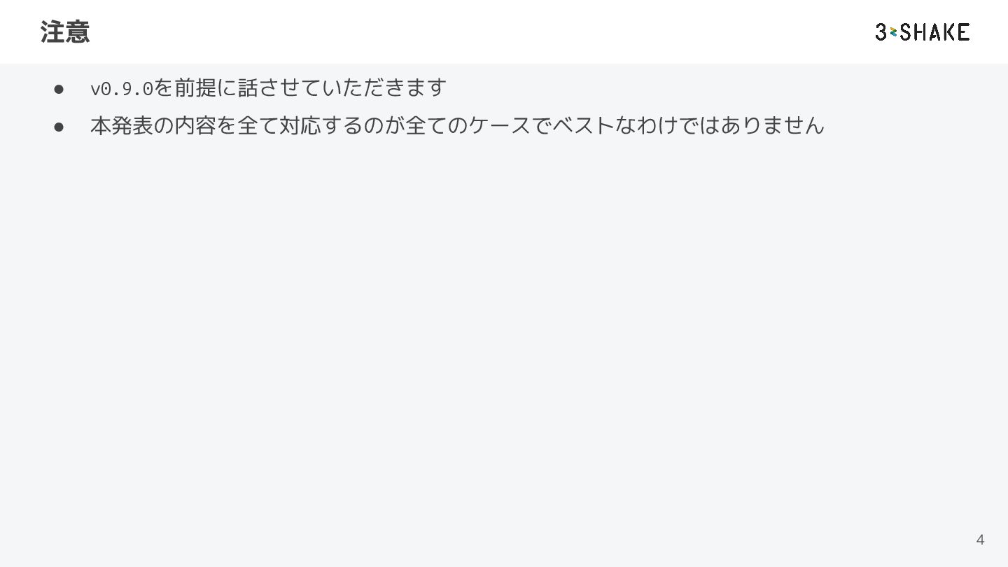 注意 • v0.9.0を前提に話させていただきます • 本発表の内容を全て対応するのが全てのケースでベストなわけではありません 4