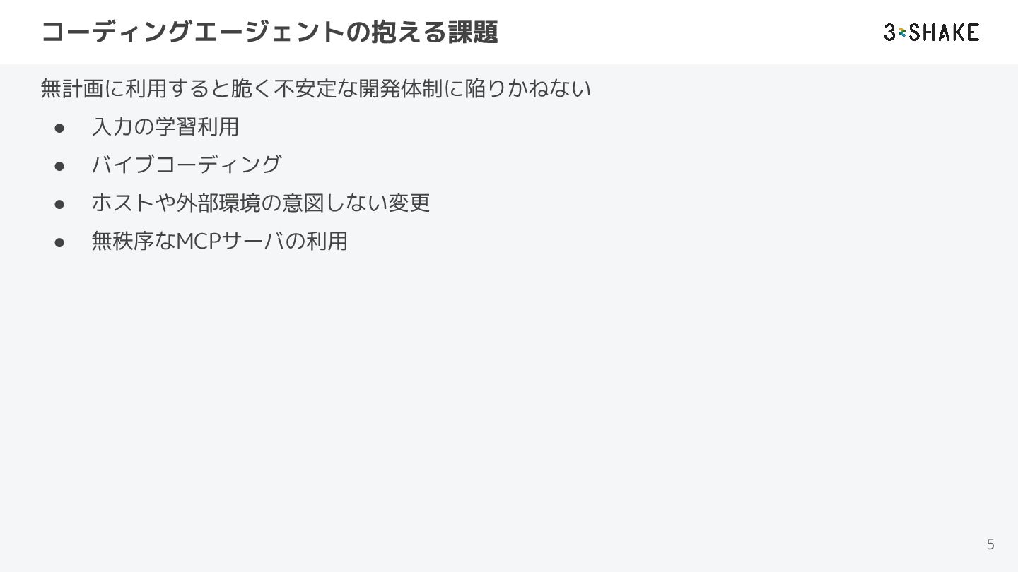 コーディングエージェントの抱える課題 無計画に利用すると脆く不安定な開発体制に陥りかねない • 入力の学習利用 • バイブコーディング • ホストや外部環境の意図しない変更 • 無秩序なMCPサーバの利用