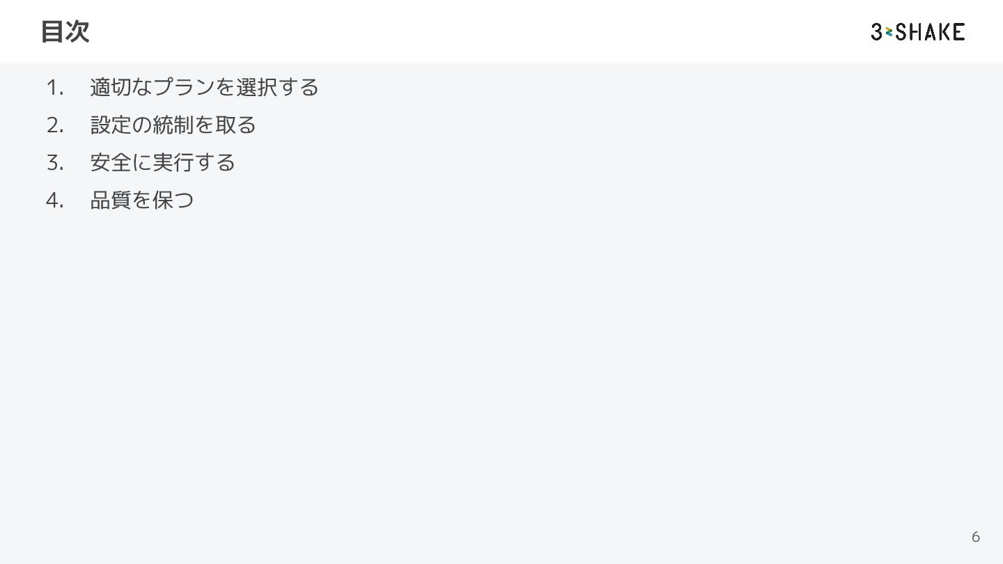 目次 1. 適切なプランを選択する 2. 設定の統制を取る 3. 安全に実行する 4. 品質を保つ 6