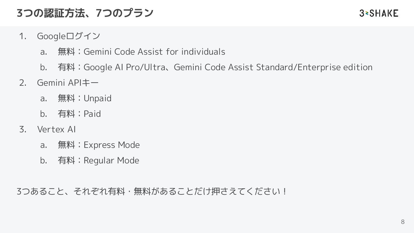 有料:Google AI Pro/Ultra、Gemini Code Assist Standard/Enterprise edition 2. Gemini APIキー a. 無料:Unpaid b. 有料:Paid 3. Vertex AI a. 無料:Express Mode b. 有料:Regular Mode 3つあること、それぞれ有料・無料があることだけ押さえてください! 8
