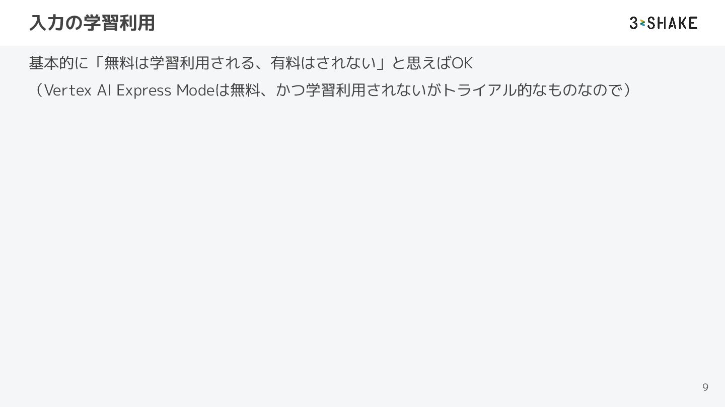 入力の学習利用 基本的に「無料は学習利用される、有料はされない」と思えばOK (Vertex AI Express Modeは無料、かつ学習利用されないがトライアル的なものなので) 9