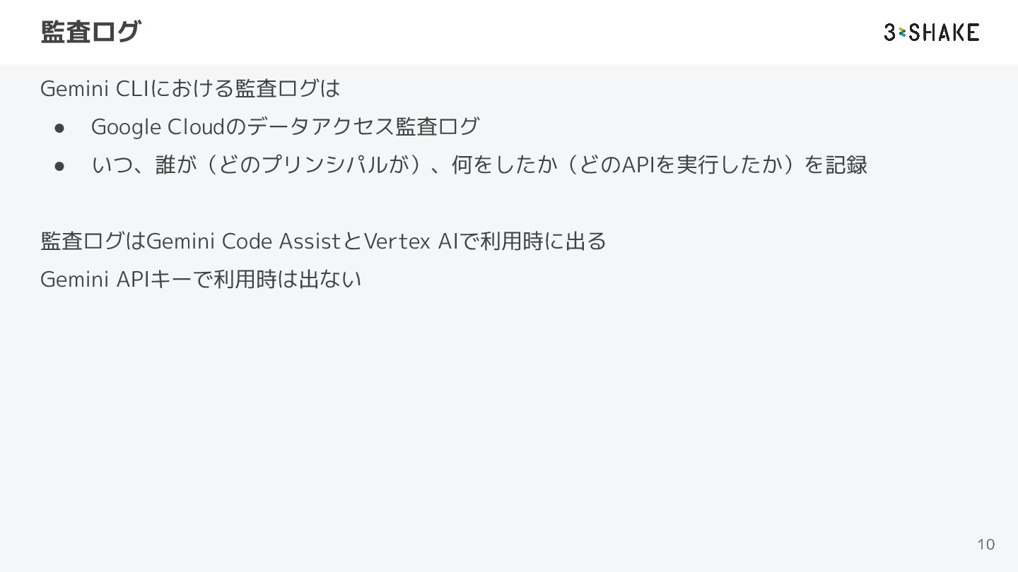 監査ログ Gemini CLIにおける監査ログは • Google Cloudのデータアクセス監査ログ • いつ、誰が(どのプリンシパルが)、何をしたか(どのAPIを実行したか)を記録 監査ログはGemini Code