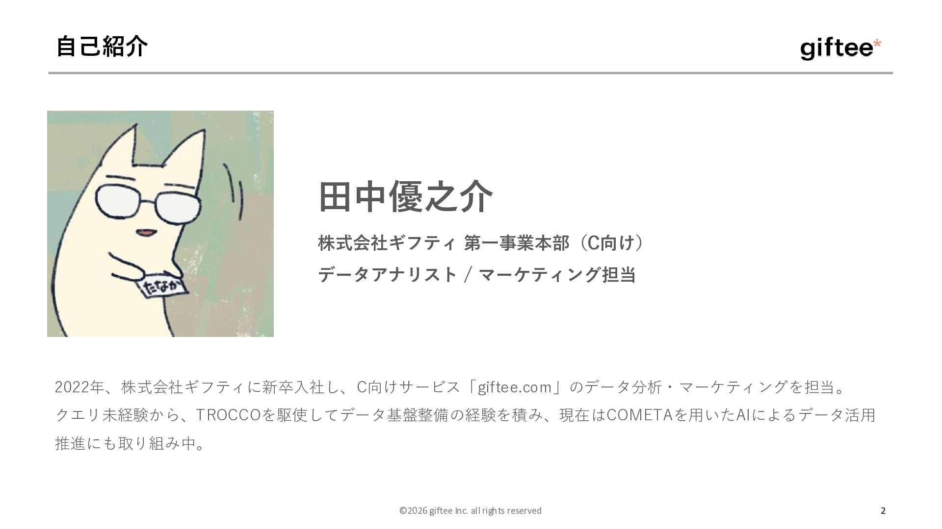 ©2026 giftee Inc. all rights reserved 2 自己紹介 田中優之介 株式会社ギフティ
