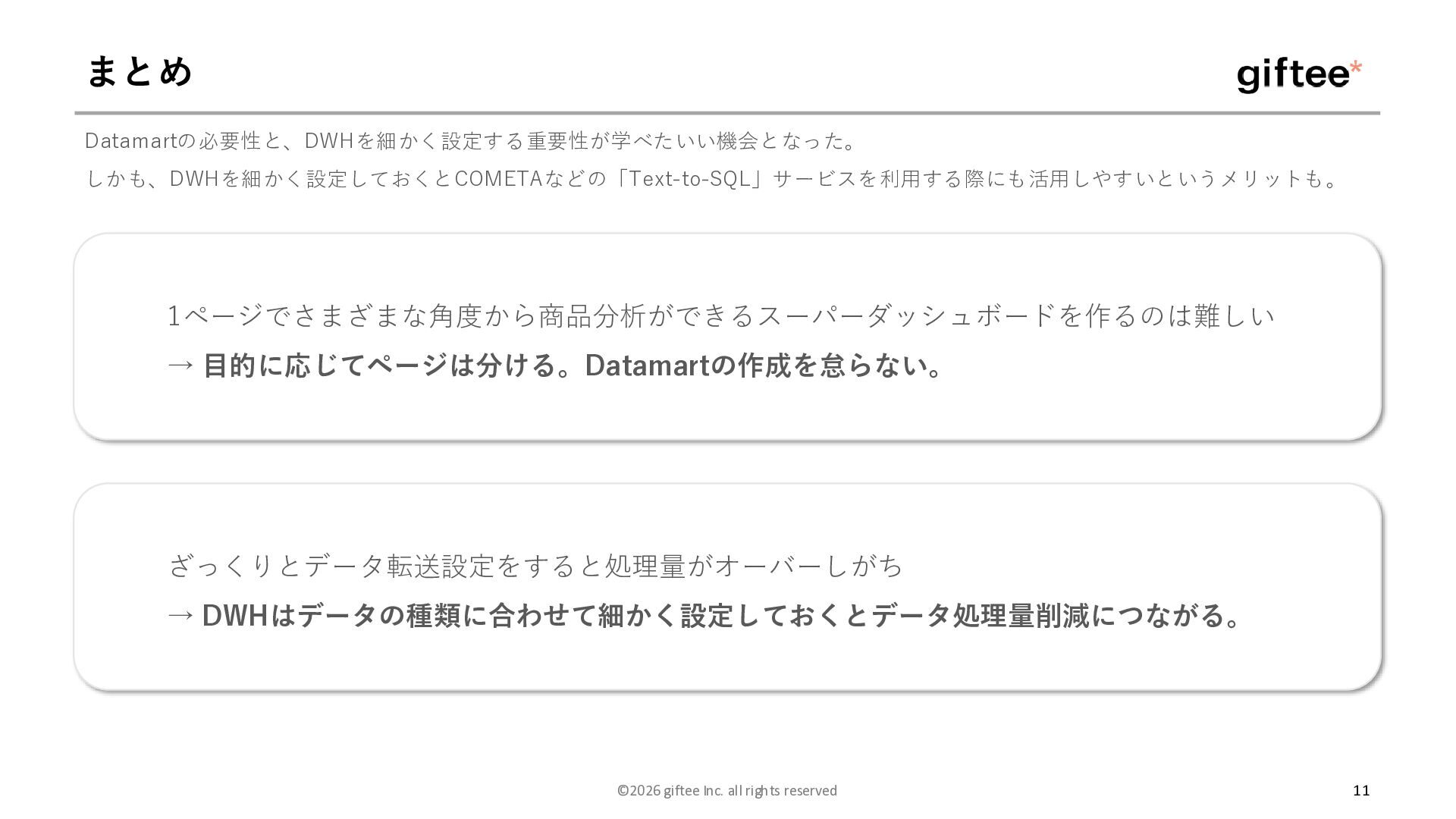 ©2026 giftee Inc. all rights reserved 11 まとめ Datamartの必要性と、DWHを細かく設定する重要性が学べたいい機会となった。 しかも、DWHを細かく設定しておくとCOMETAなどの「Text-to-SQL」サービスを利用する際にも活用しやすいというメリットも。