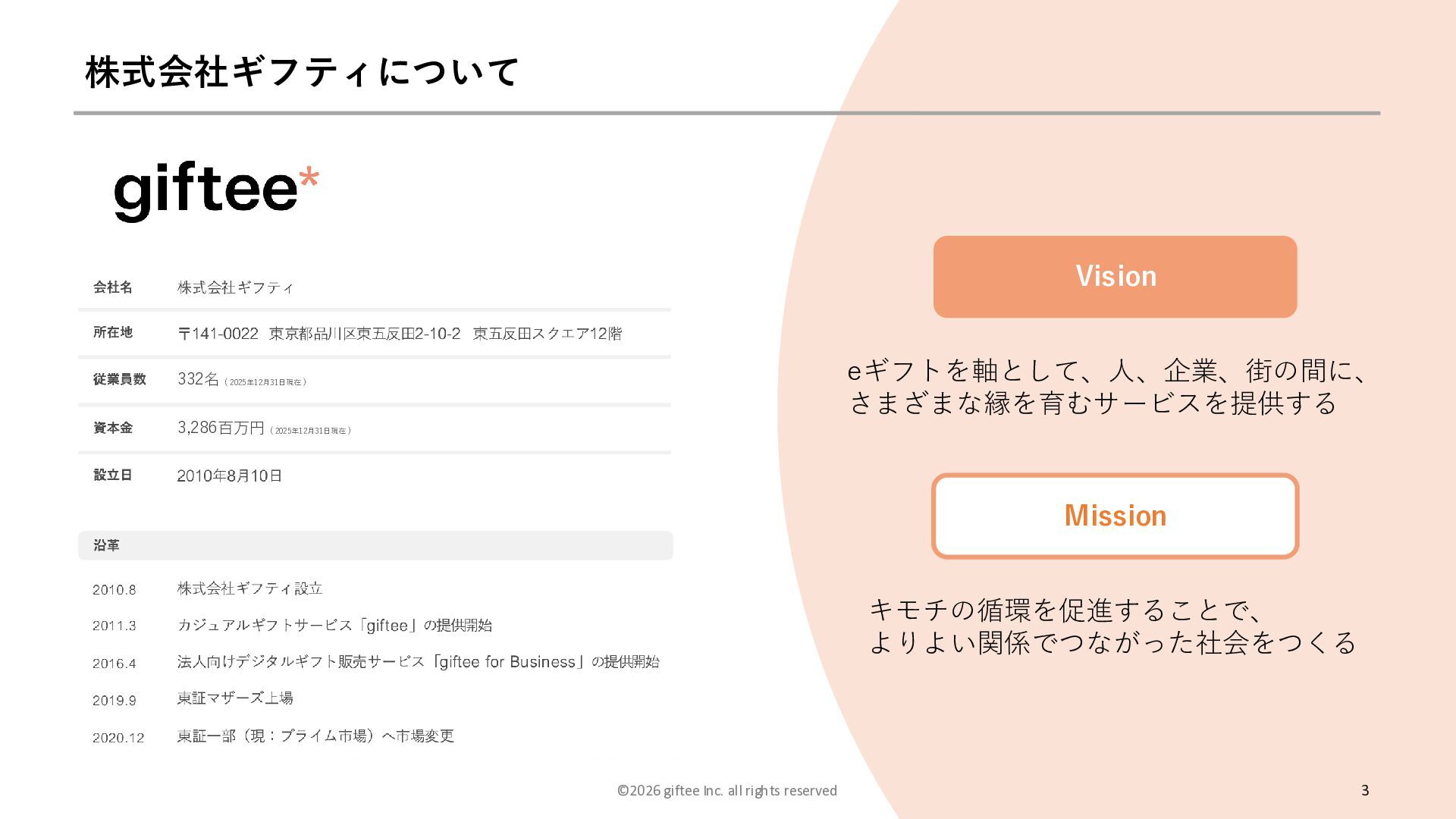 ©2026 giftee Inc. all rights reserved 3 株式会社ギフティについて Vision eギフトを軸として、人、企業、街の間に、