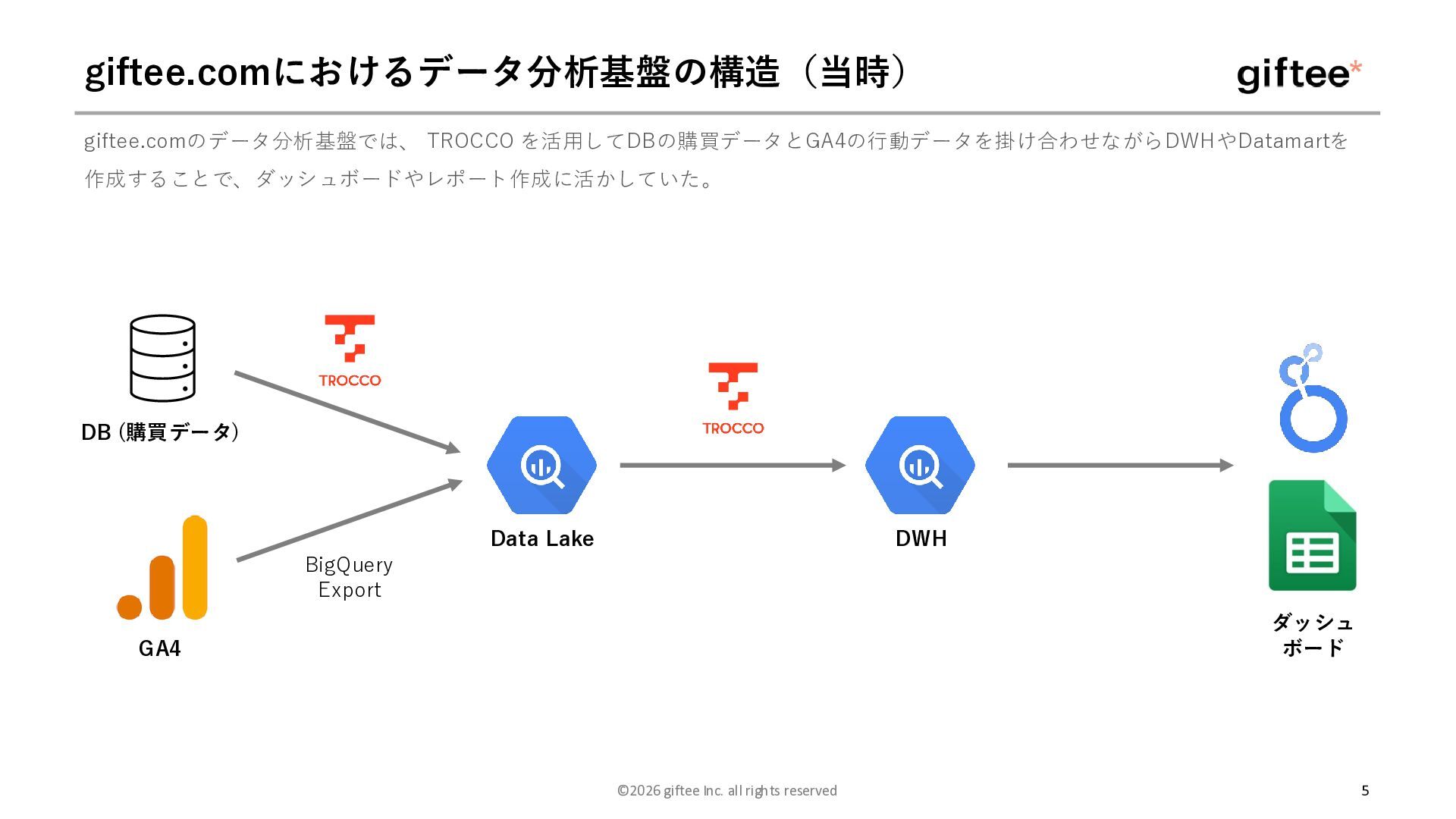 ©2026 giftee Inc. all rights reserved 5 giftee.comにおけるデータ分析基盤の構造(当時) giftee.comのデータ分析基盤では、 TROCCO