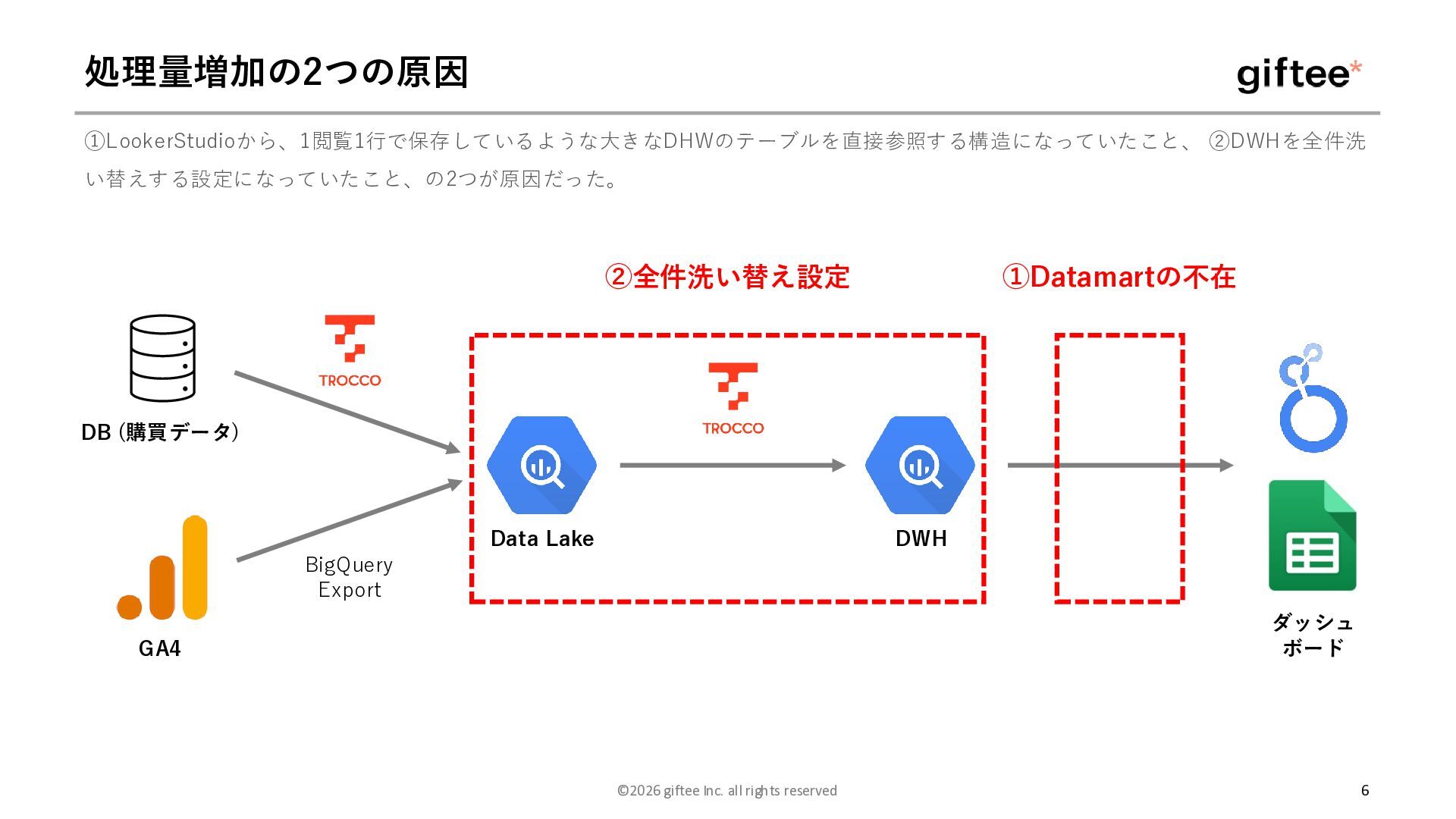 ©2026 giftee Inc. all rights reserved 6 処理量増加の2つの原因 ①LookerStudioから、1閲覧1行で保存しているような大きなDHWのテーブルを直接参照する構造になっていたこと、 ②DWHを全件洗