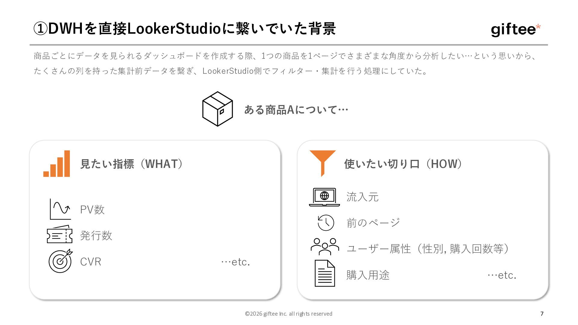 ©2026 giftee Inc. all rights reserved 7 ①DWHを直接LookerStudioに繋いでいた背景 商品ごとにデータを見られるダッシュボードを作成する際、1つの商品を1ページでさまざまな角度から分析したい…という思いから、 たくさんの列を持った集計前データを繋ぎ、LookerStudio側でフィルター・集計を行う処理にしていた。