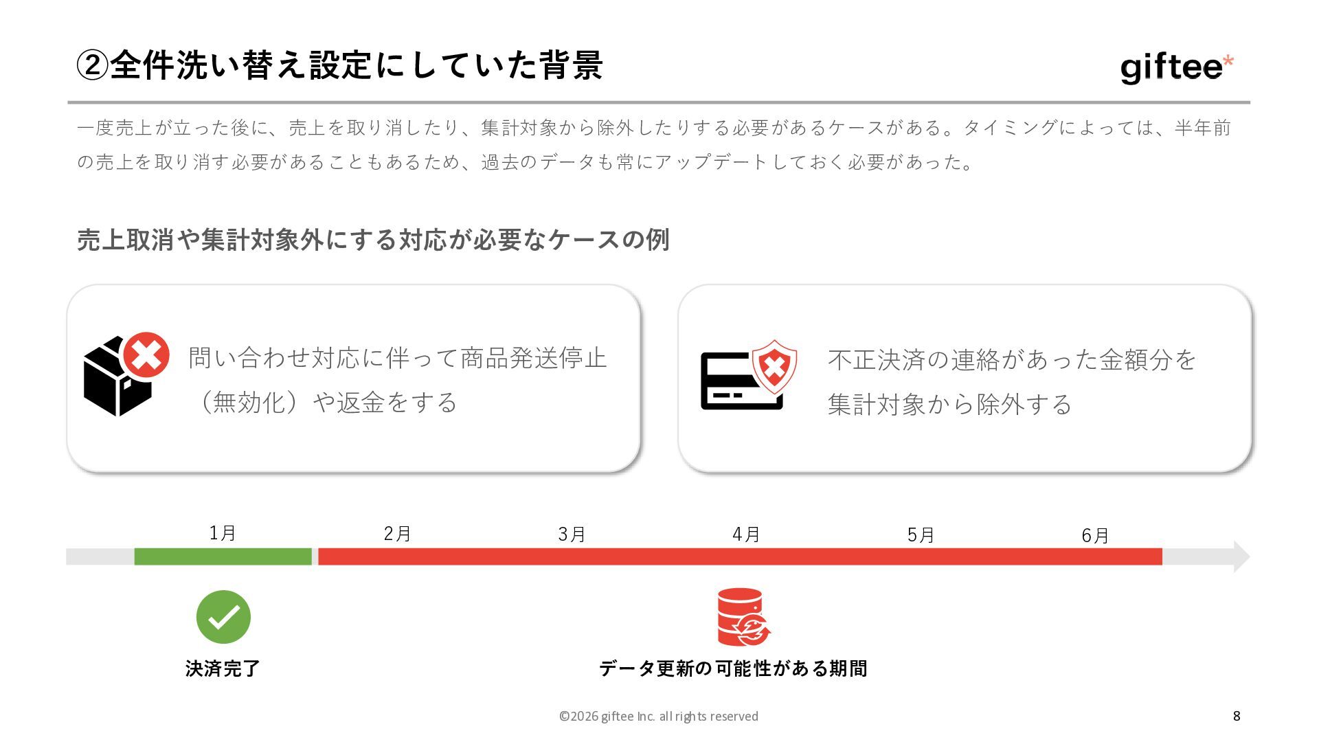©2026 giftee Inc. all rights reserved 8 ②全件洗い替え設定にしていた背景 一度売上が立った後に、売上を取り消したり、集計対象から除外したりする必要があるケースがある。タイミングによっては、半年前 の売上を取り消す必要があることもあるため、過去のデータも常にアップデートしておく必要があった。
