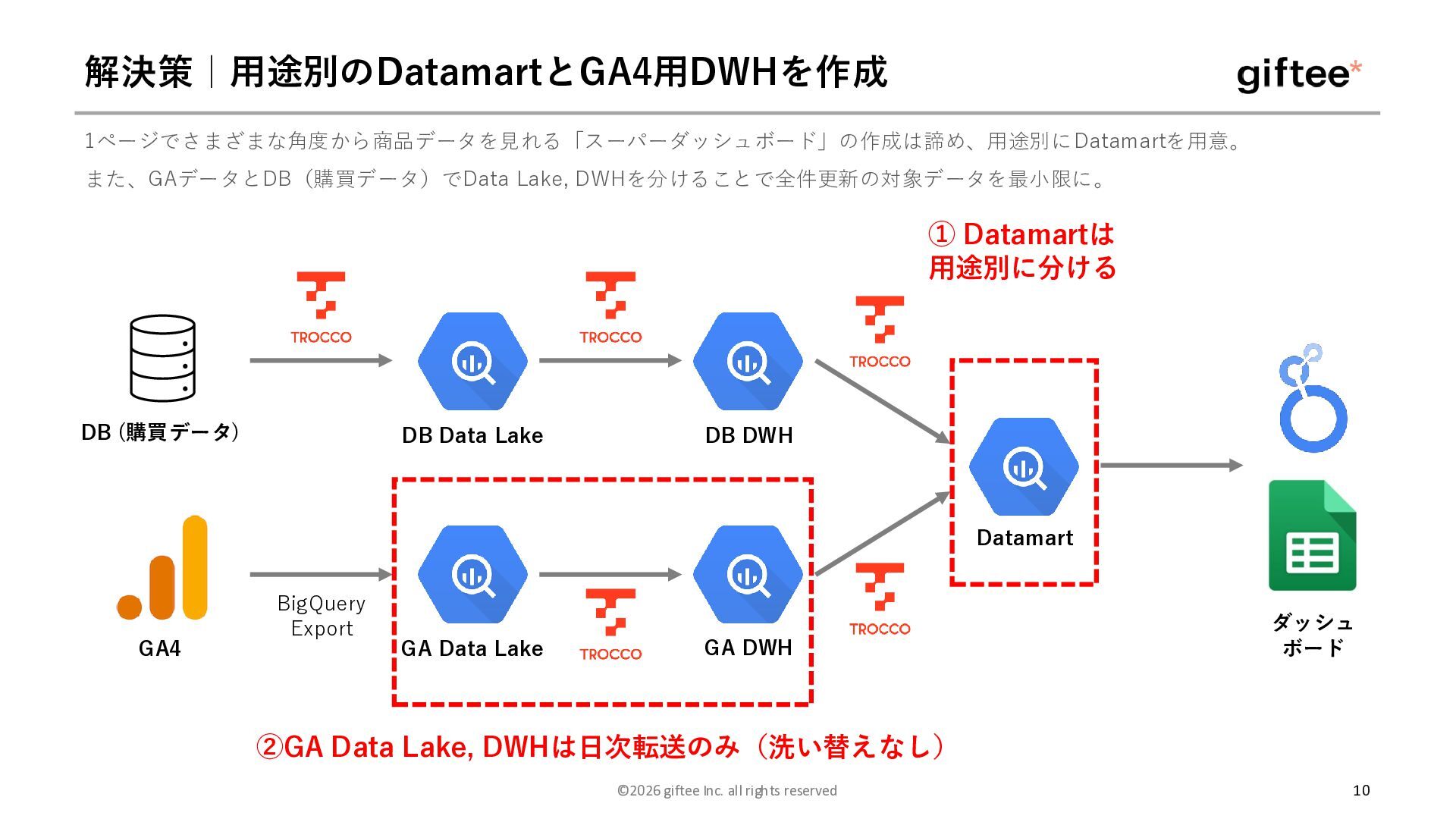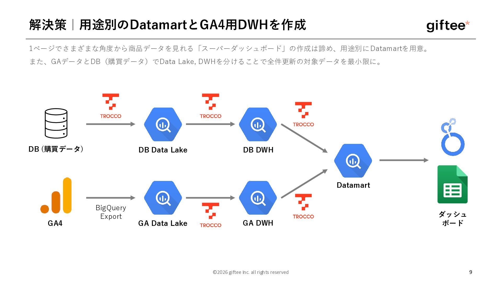 ©2026 giftee Inc. all rights reserved 9 解決策|用途別のDatamartとGA4用DWHを作成 1ページでさまざまな角度から商品データを見れる「スーパーダッシュボード」の作成は諦め、用途別にDatamartを用意。 また、GAデータとDB(購買データ)でData