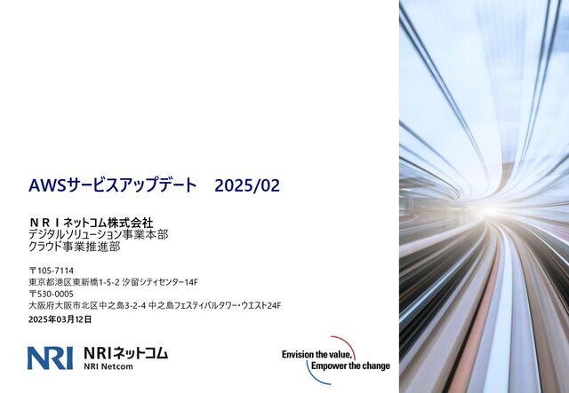 Amazon CloudWatch が Aurora PostgreSQL のロック競合の診断機能を提供開始 https://aws.amazon.com/jp/about-aws/whats-new/2025/02/amazon-cloudwatch-lock-contention- diagnostics-aurora-postgresql/ ◼ Amazon Elastic Block Store (EBS) がコンソールと API に完全なスナップショットのサイズ情報を追加 https://aws.amazon.com/jp/about-aws/whats-new/2025/02/amazon-ebs-full-snapshot-size- information-console-api/ ◼ AWS Network Load Balancer がアベイラビリティゾーンの削除をサポートするようになりました https://aws.amazon.com/jp/about-aws/whats-new/2025/02/aws-network-load-balancer-removing- availability-zones/ ◼ VPC エンドポイントの AWS CloudTrail ネットワークアクティビティイベントが一般提供開始 https://aws.amazon.com/jp/about-aws/whats-new/2025/02/aws-cloudtrail-network-activity-events- vpc-endpoints-generally-available/ ◼ Amazon Aurora PostgreSQL と Amazon Redshift のゼロ ETL 統合が 18 の追加リージョンで利用可能に https://aws.amazon.com/jp/about-aws/whats-new/2025/02/amazon-aurora-postgresql-zero-etl- integration-redshift/ AWSサービスアップデート