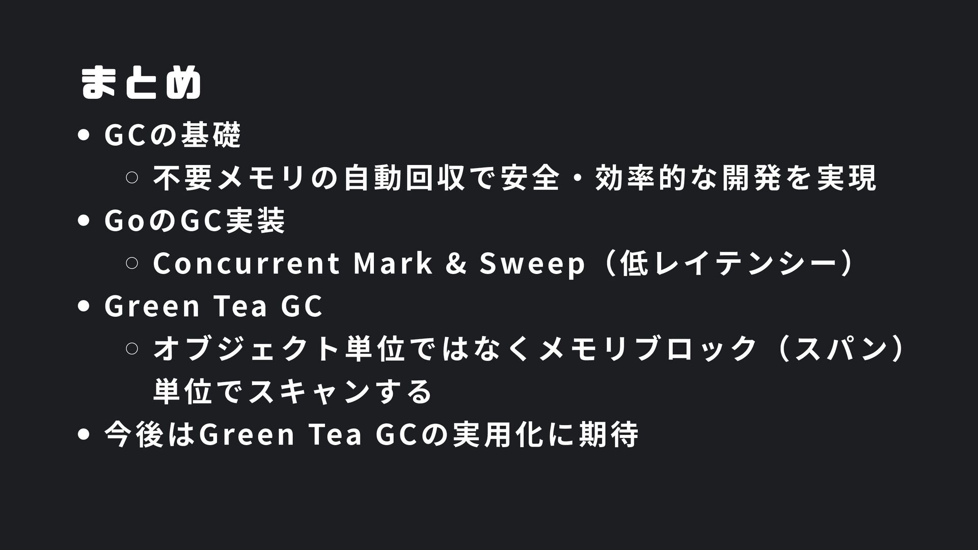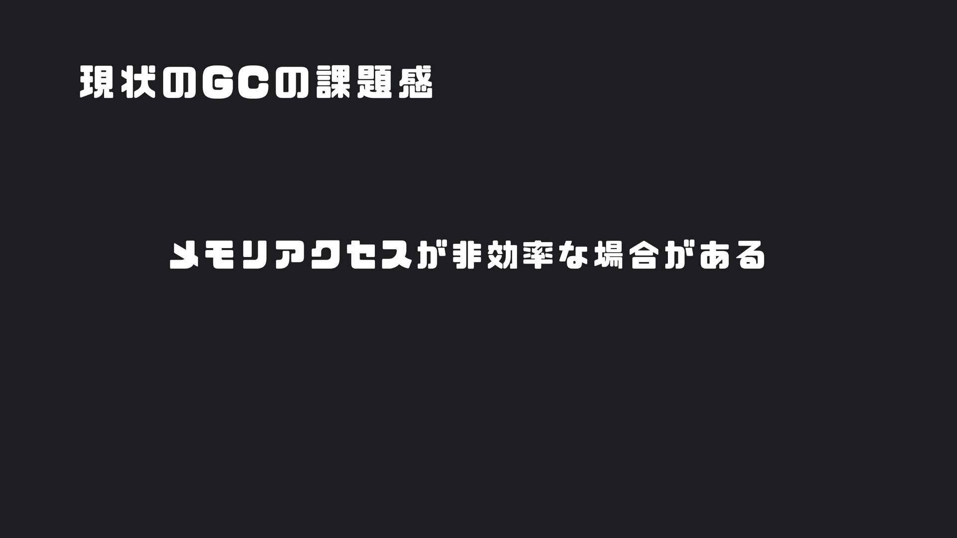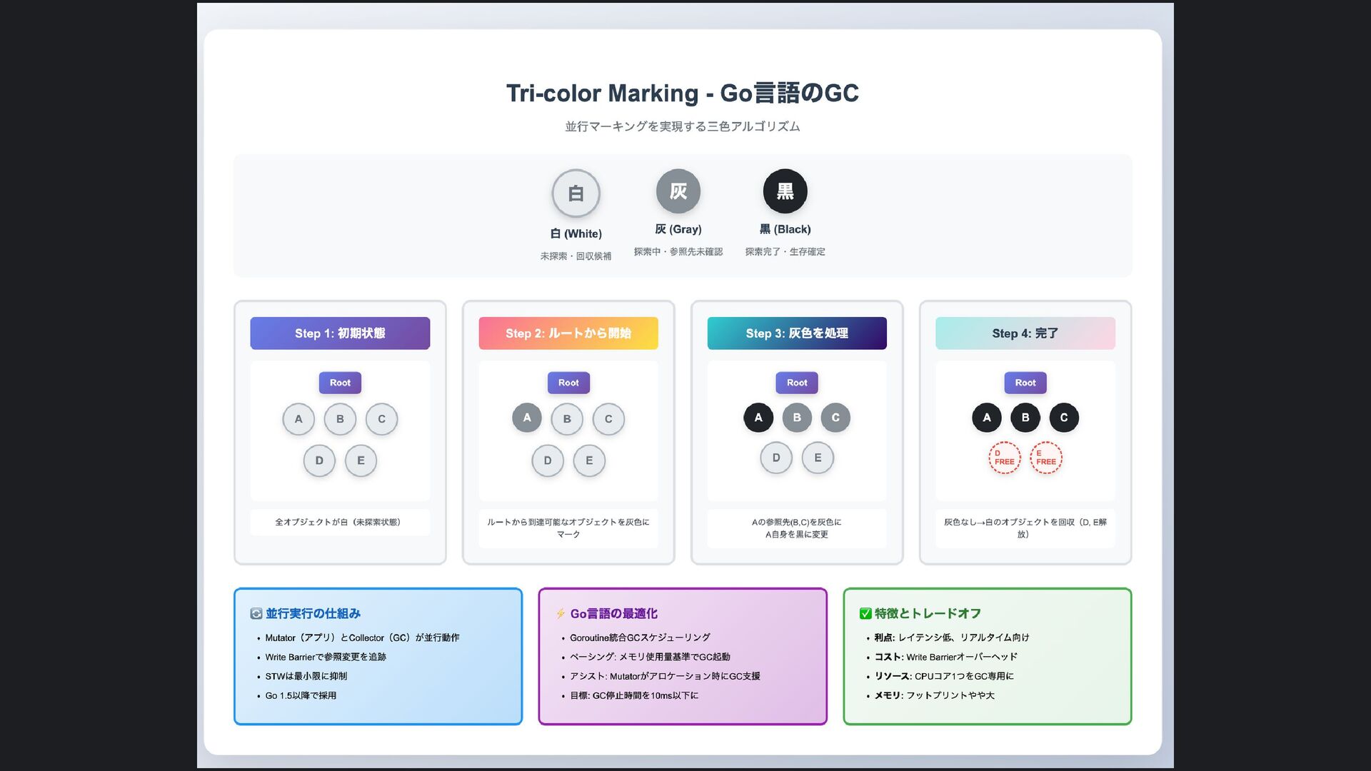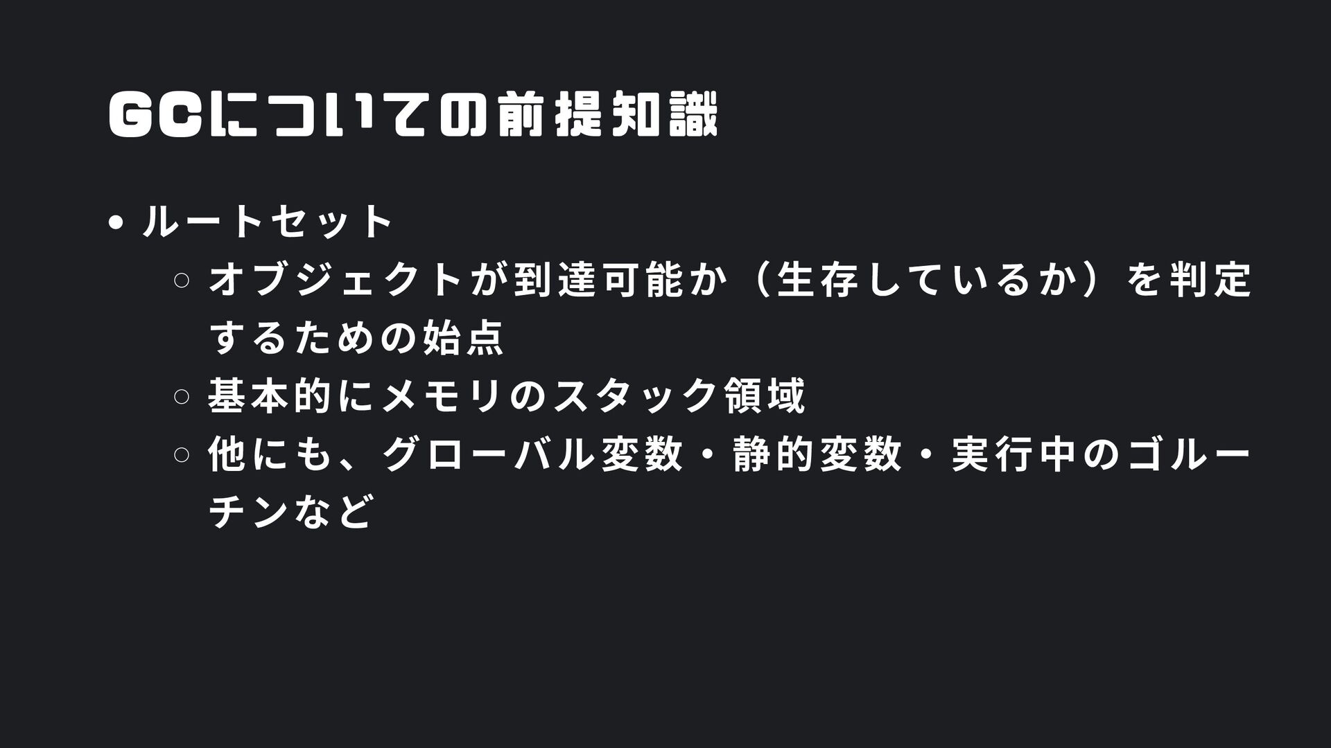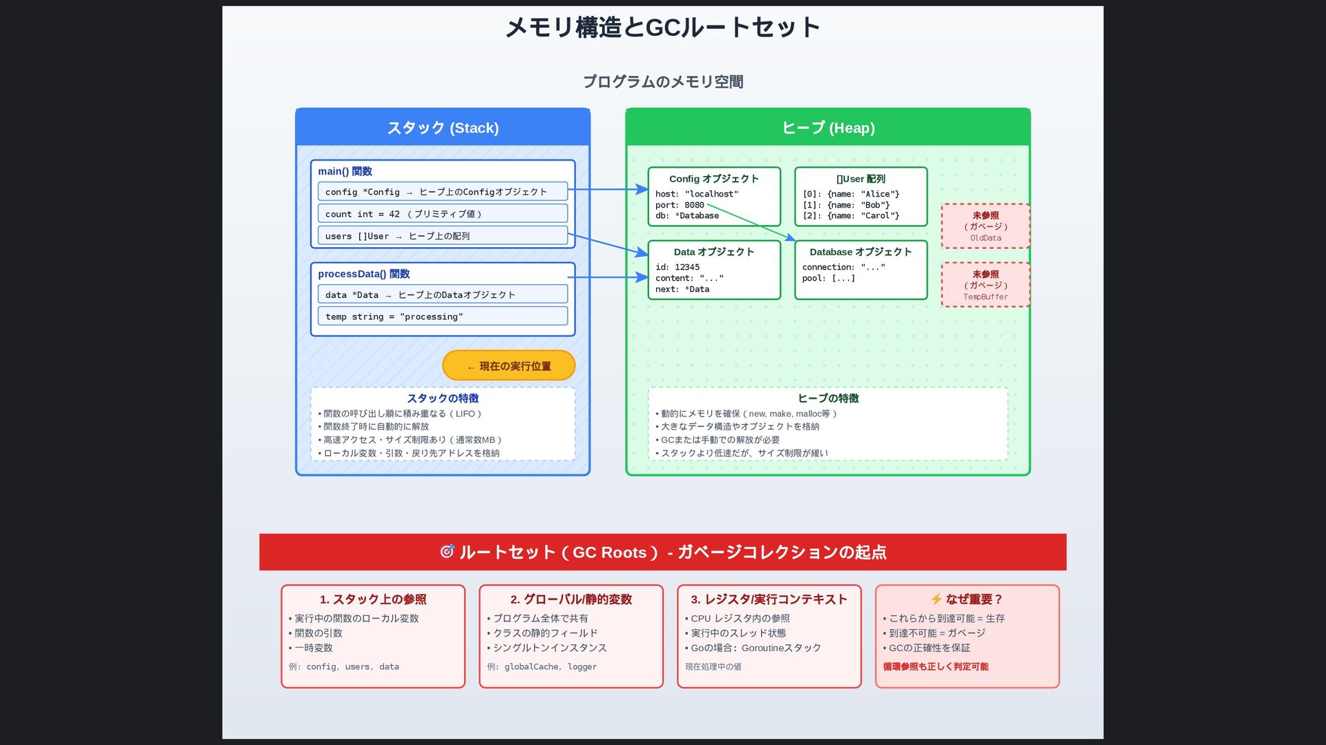 ヒープ上のConfigオブジェクト count int = 42 (プリミティブ値) users []User → ヒープ上の配列 processData() 関数 data *Data → ヒープ上のDataオブジェクト temp string = "processing" ← 現在の実行位置 スタックの特徴 • 関数の呼び出し順に積み重なる(LIFO) • 関数終了時に自動的に解放 • 高速アクセス・サイズ制限あり(通常数MB) • ローカル変数・引数・戻り先アドレスを格納 ヒープ (Heap) Config オブジェクト host: "localhost" port: 8080 db: *Database []User 配列 [0]: {name: "Alice"} [1]: {name: "Bob"} [2]: {name: "Carol"} Data オブジェクト id: 12345 content: "..." next: *Data Database オブジェクト connection: "..." pool: [...] 未参照 (ガベージ) OldData 未参照 (ガベージ) TempBuffer ヒープの特徴 • 動的にメモリを確保(new, make, malloc等) • 大きなデータ構造やオブジェクトを格納 • GCまたは手動での解放が必要 • スタックより低速だが、サイズ制限が緩い 🎯 ルートセット(GC Roots ) - ガベージコレクションの起点 1. スタック上の参照 • 実行中の関数のローカル変数 • 関数の引数 • 一時変数 例: config, users, data 2. グローバル/ 静的変数 • プログラム全体で共有 • クラスの静的フィールド • シングルトンインスタンス 例: globalCache, logger 3. レジスタ/ 実行コンテキスト • CPU レジスタ内の参照 • 実行中のスレッド状態 • Goの場合:Goroutineスタック 現在処理中の値 ⚡ なぜ重要? • これらから到達可能 = 生存 • 到達不可能 = ガベージ • GCの正確性を保証 循環参照も正しく判定可能