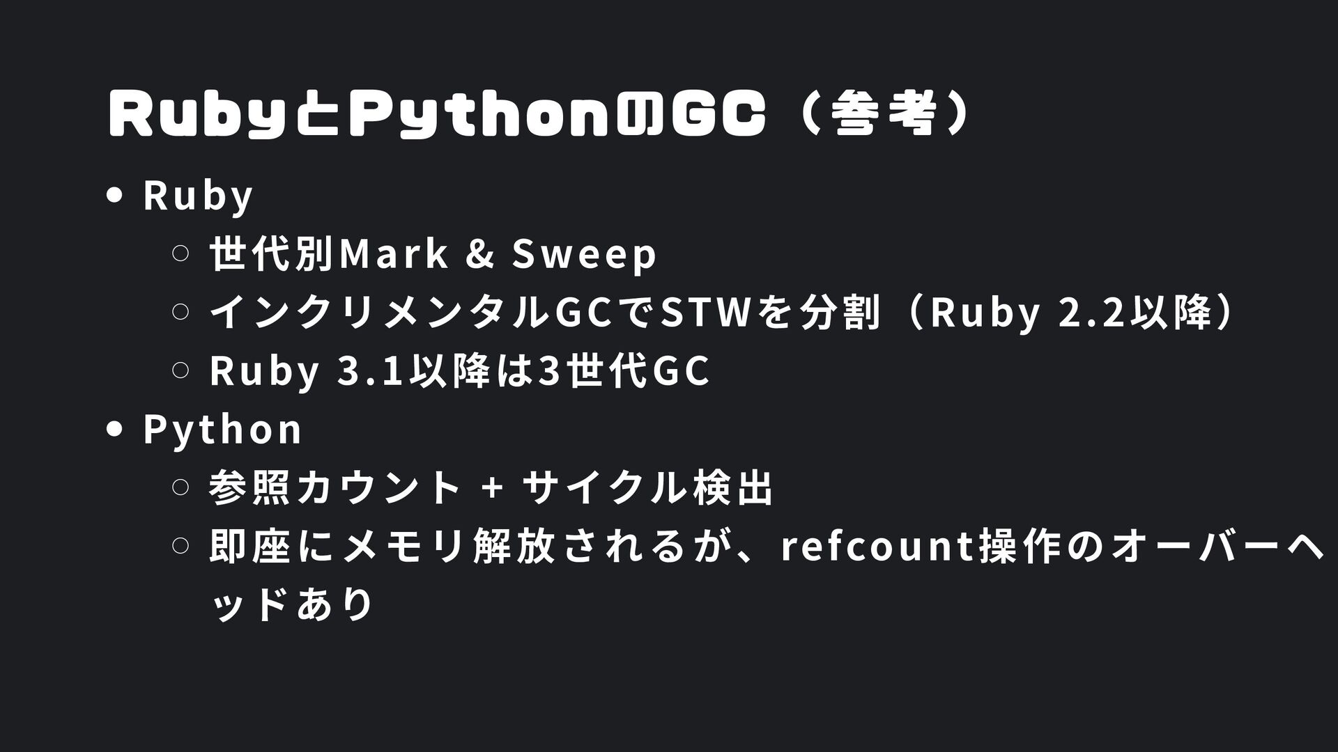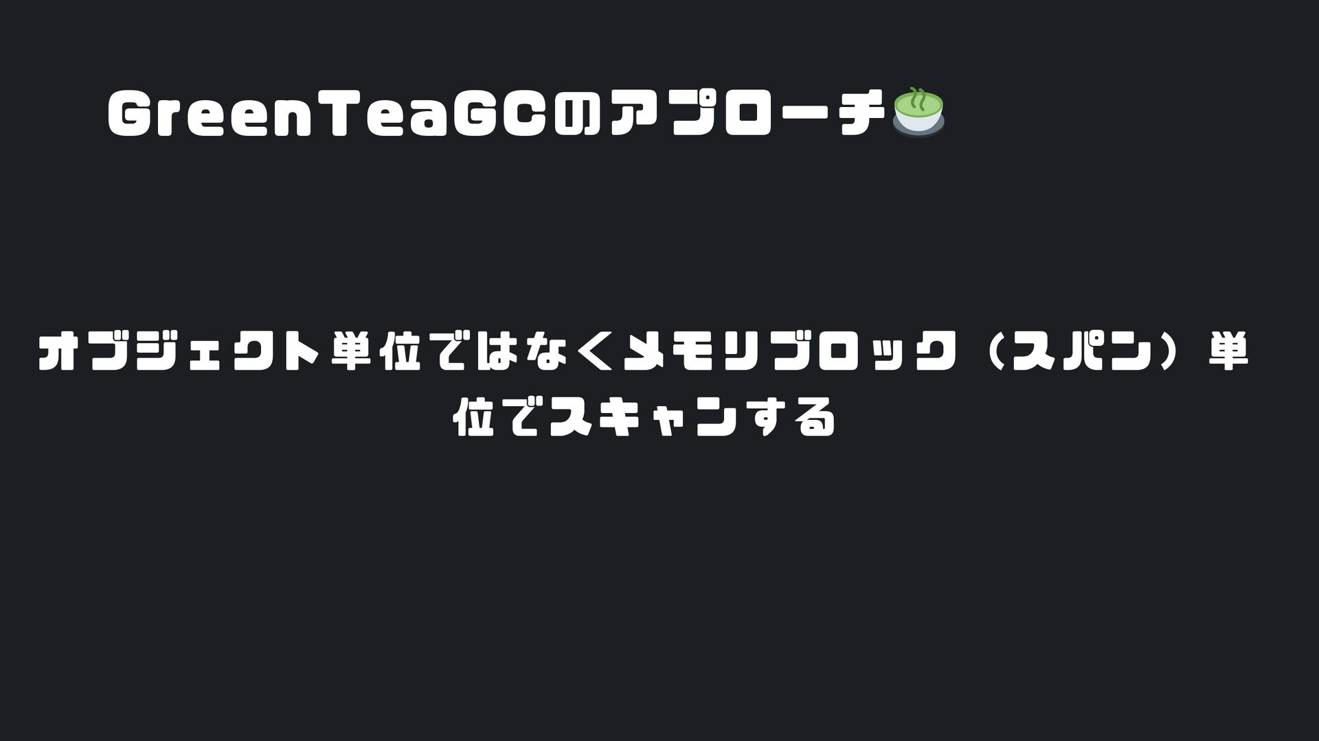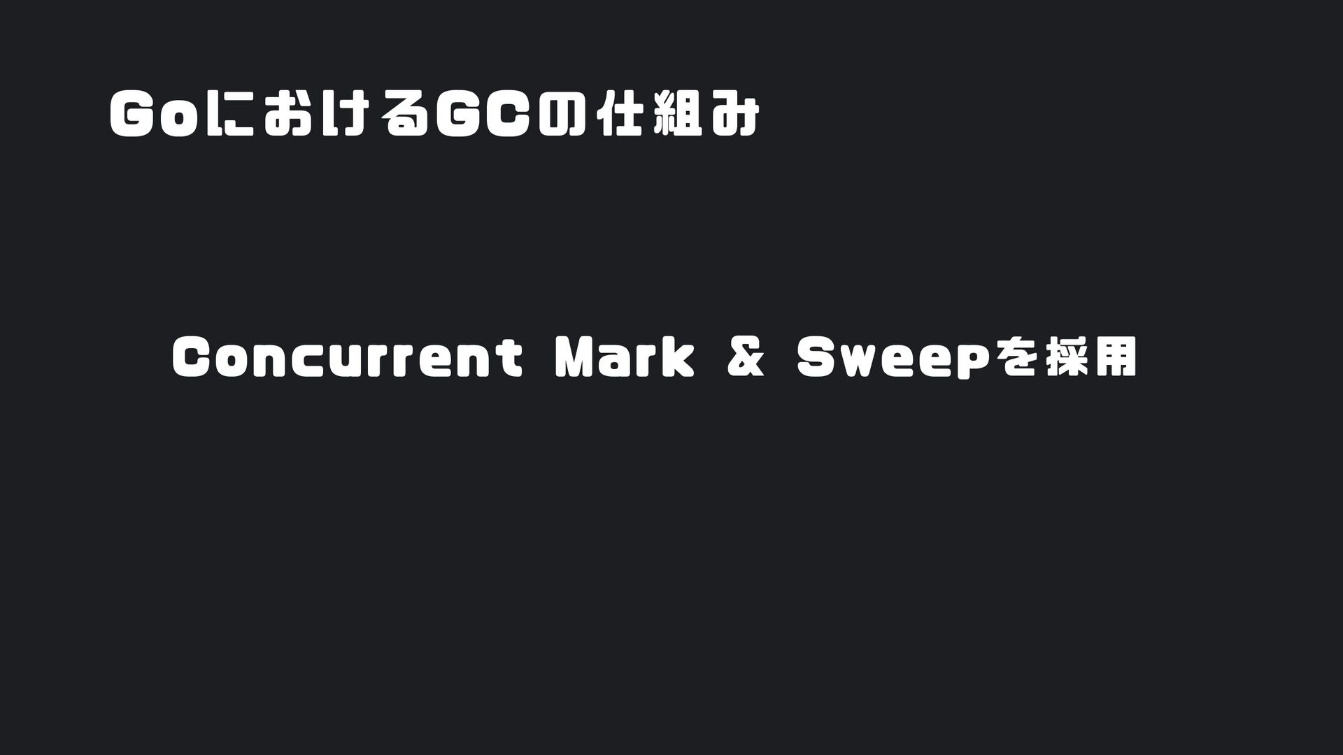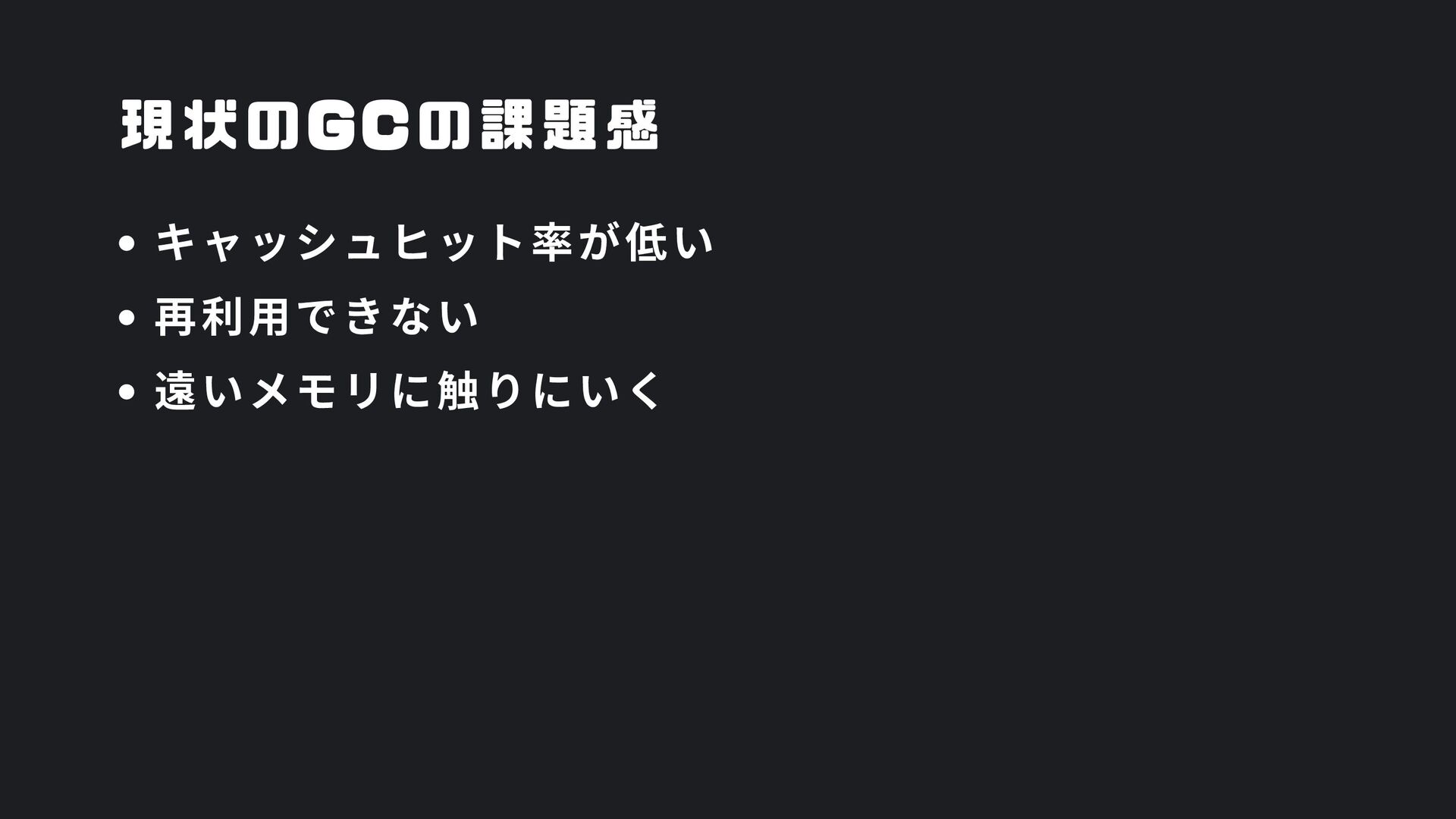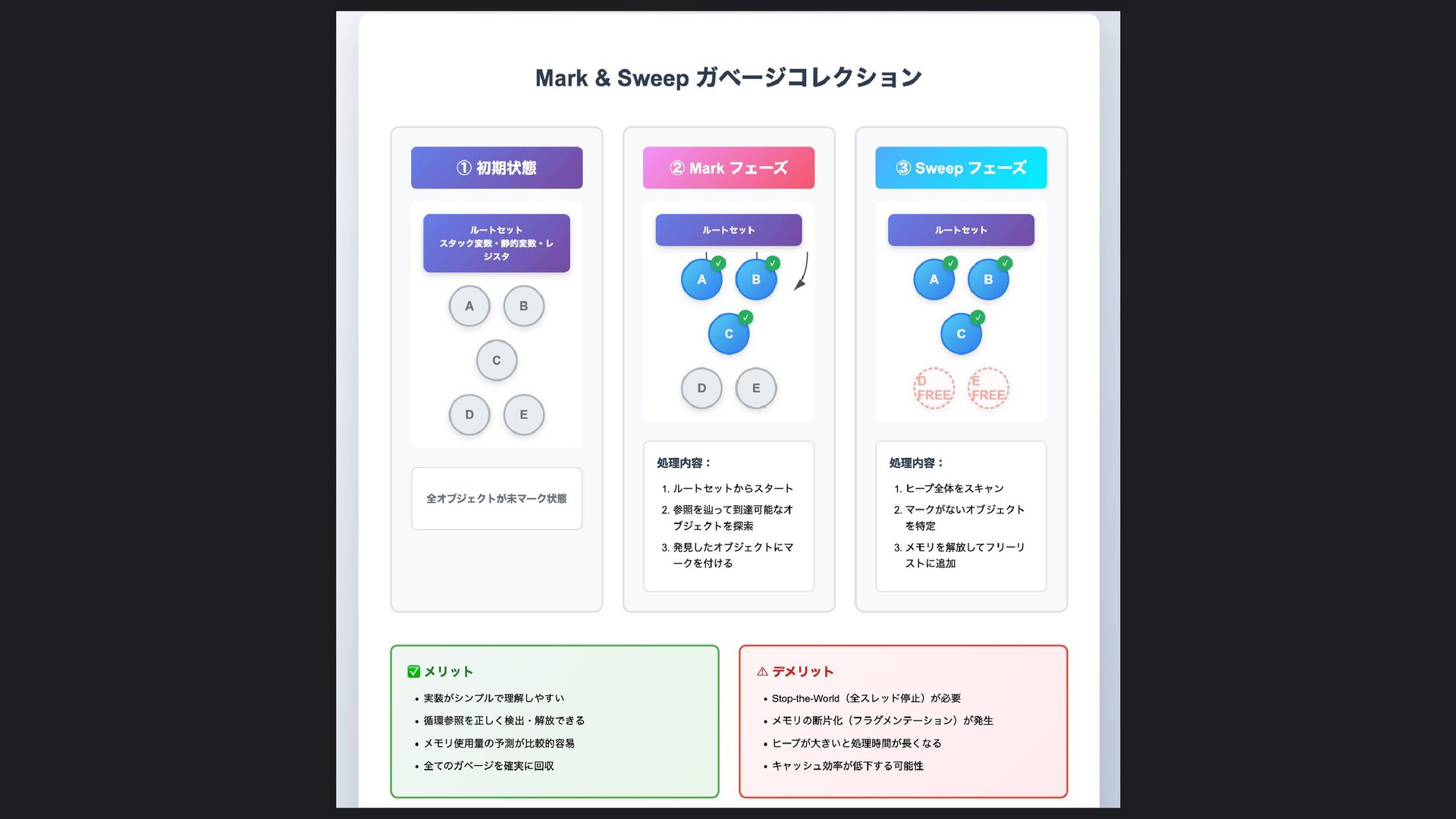 ヒープ上のConfigオブジェクト count int = 42 (プリミティブ値) users []User → ヒープ上の配列 processData() 関数 data *Data → ヒープ上のDataオブジェクト temp string = "processing" ← 現在の実行位置 スタックの特徴 • 関数の呼び出し順に積み重なる(LIFO) • 関数終了時に自動的に解放 • 高速アクセス・サイズ制限あり(通常数MB) • ローカル変数・引数・戻り先アドレスを格納 ヒープ (Heap) Config オブジェクト host: "localhost" port: 8080 db: *Database []User 配列 [0]: {name: "Alice"} [1]: {name: "Bob"} [2]: {name: "Carol"} Data オブジェクト id: 12345 content: "..." next: *Data Database オブジェクト connection: "..." pool: [...] 未参照 (ガベージ) OldData 未参照 (ガベージ) TempBuffer ヒープの特徴 • 動的にメモリを確保(new, make, malloc等) • 大きなデータ構造やオブジェクトを格納 • GCまたは手動での解放が必要 • スタックより低速だが、サイズ制限が緩い 🎯 ルートセット(GC Roots ) - ガベージコレクションの起点 1. スタック上の参照 • 実行中の関数のローカル変数 • 関数の引数 • 一時変数 例: config, users, data 2. グローバル/ 静的変数 • プログラム全体で共有 • クラスの静的フィールド • シングルトンインスタンス 例: globalCache, logger 3. レジスタ/ 実行コンテキスト • CPU レジスタ内の参照 • 実行中のスレッド状態 • Goの場合:Goroutineスタック 現在処理中の値 ⚡ なぜ重要? • これらから到達可能 = 生存 • 到達不可能 = ガベージ • GCの正確性を保証 循環参照も正しく判定可能