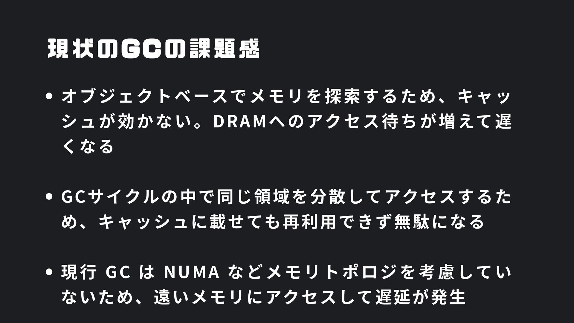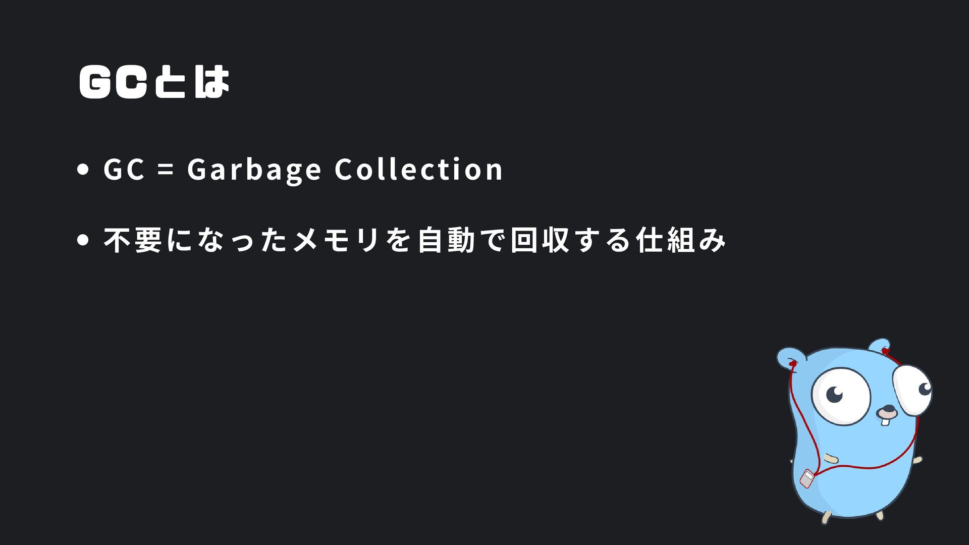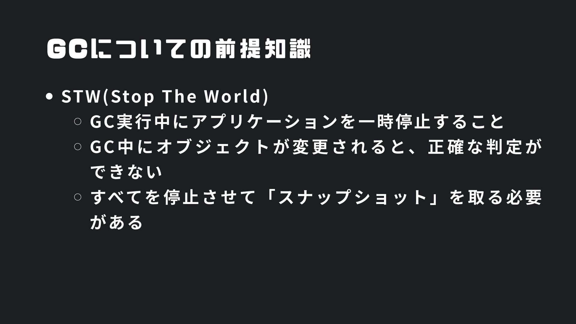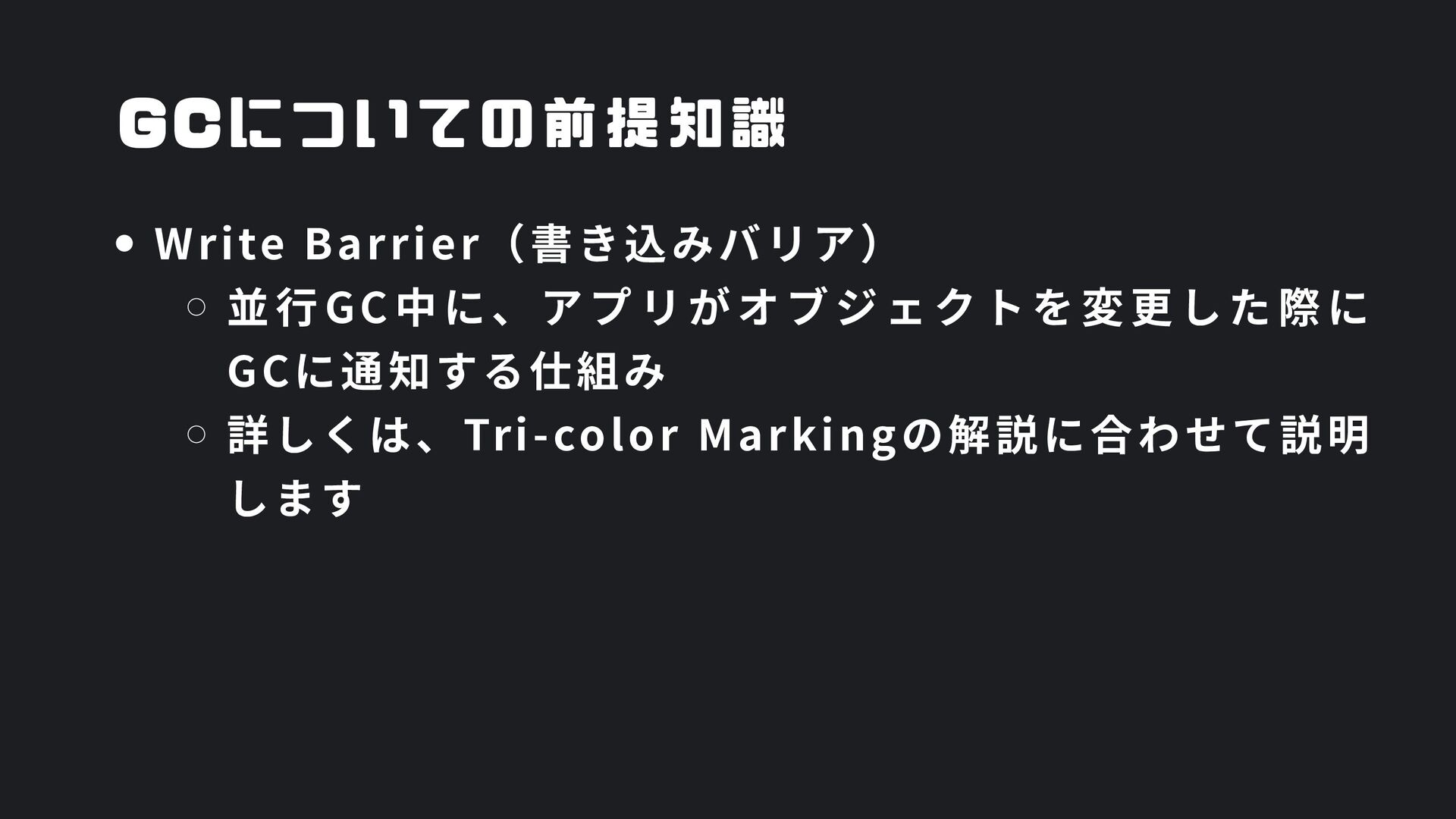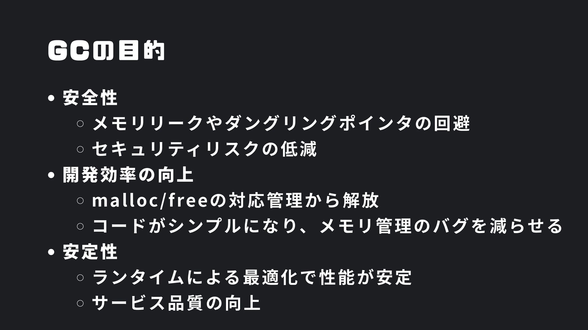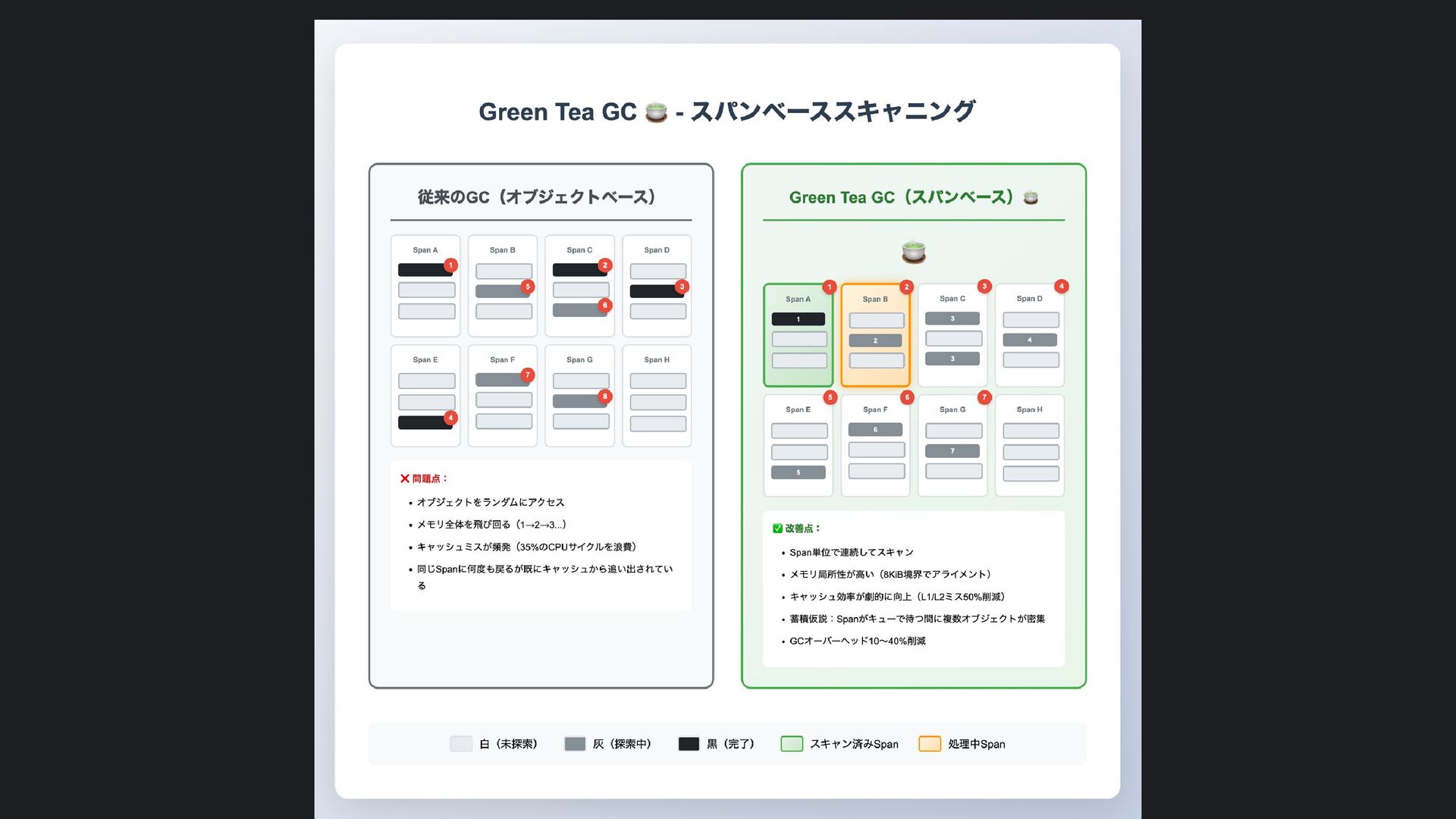 ヒープ上のConfigオブジェクト count int = 42 (プリミティブ値) users []User → ヒープ上の配列 processData() 関数 data *Data → ヒープ上のDataオブジェクト temp string = "processing" ← 現在の実行位置 スタックの特徴 • 関数の呼び出し順に積み重なる(LIFO) • 関数終了時に自動的に解放 • 高速アクセス・サイズ制限あり(通常数MB) • ローカル変数・引数・戻り先アドレスを格納 ヒープ (Heap) Config オブジェクト host: "localhost" port: 8080 db: *Database []User 配列 [0]: {name: "Alice"} [1]: {name: "Bob"} [2]: {name: "Carol"} Data オブジェクト id: 12345 content: "..." next: *Data Database オブジェクト connection: "..." pool: [...] 未参照 (ガベージ) OldData 未参照 (ガベージ) TempBuffer ヒープの特徴 • 動的にメモリを確保(new, make, malloc等) • 大きなデータ構造やオブジェクトを格納 • GCまたは手動での解放が必要 • スタックより低速だが、サイズ制限が緩い 🎯 ルートセット(GC Roots ) - ガベージコレクションの起点 1. スタック上の参照 • 実行中の関数のローカル変数 • 関数の引数 • 一時変数 例: config, users, data 2. グローバル/ 静的変数 • プログラム全体で共有 • クラスの静的フィールド • シングルトンインスタンス 例: globalCache, logger 3. レジスタ/ 実行コンテキスト • CPU レジスタ内の参照 • 実行中のスレッド状態 • Goの場合:Goroutineスタック 現在処理中の値 ⚡ なぜ重要? • これらから到達可能 = 生存 • 到達不可能 = ガベージ • GCの正確性を保証 循環参照も正しく判定可能