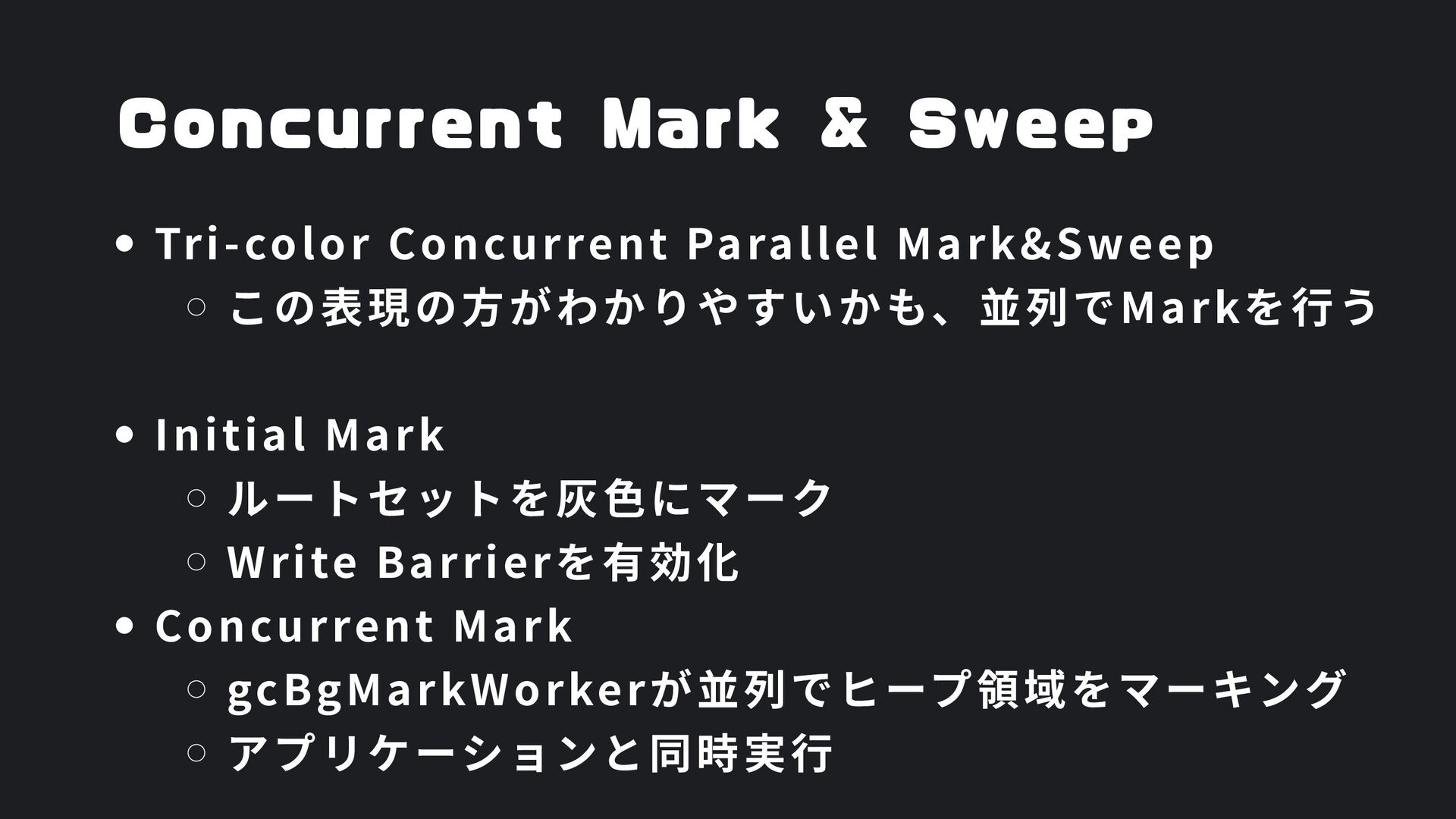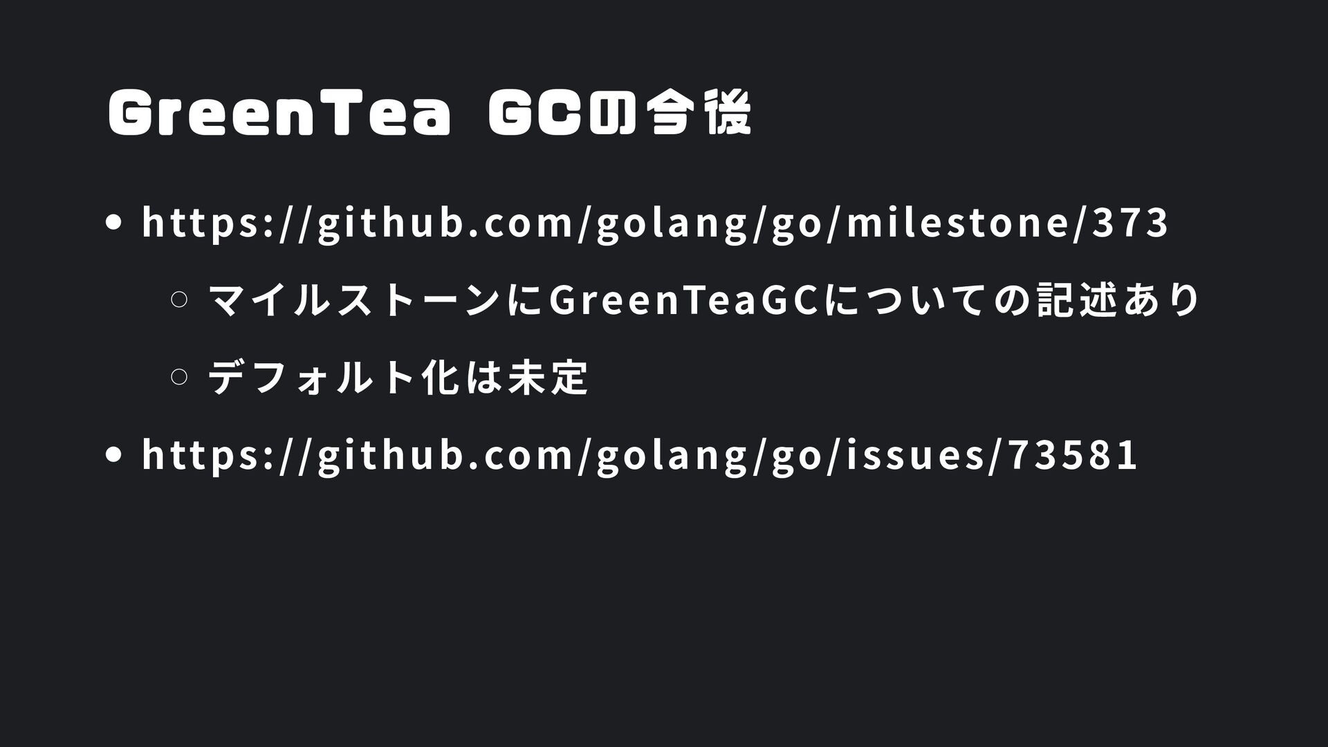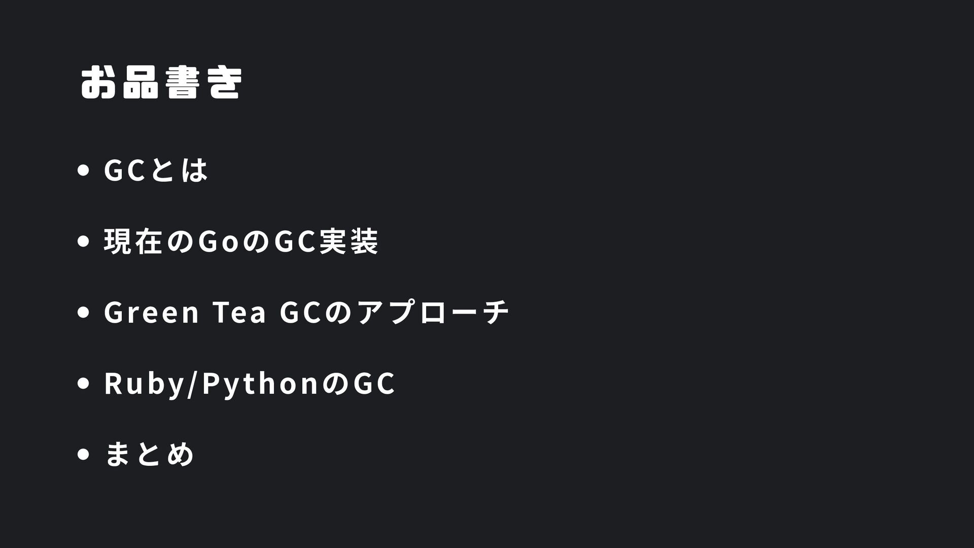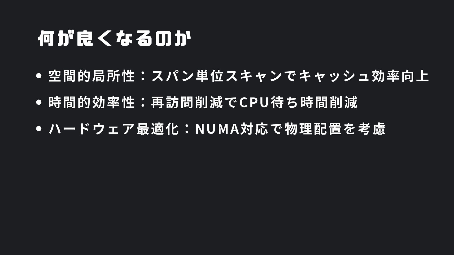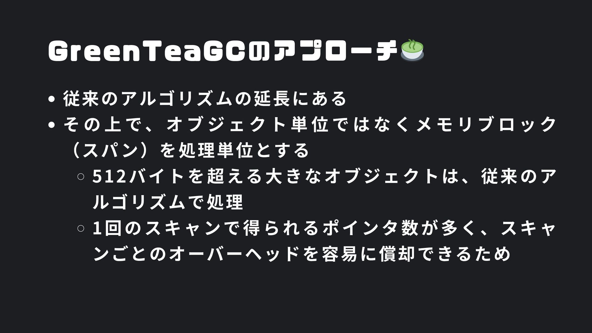 ヒープ上のConfigオブジェクト count int = 42 (プリミティブ値) users []User → ヒープ上の配列 processData() 関数 data *Data → ヒープ上のDataオブジェクト temp string = "processing" ← 現在の実行位置 スタックの特徴 • 関数の呼び出し順に積み重なる(LIFO) • 関数終了時に自動的に解放 • 高速アクセス・サイズ制限あり(通常数MB) • ローカル変数・引数・戻り先アドレスを格納 ヒープ (Heap) Config オブジェクト host: "localhost" port: 8080 db: *Database []User 配列 [0]: {name: "Alice"} [1]: {name: "Bob"} [2]: {name: "Carol"} Data オブジェクト id: 12345 content: "..." next: *Data Database オブジェクト connection: "..." pool: [...] 未参照 (ガベージ) OldData 未参照 (ガベージ) TempBuffer ヒープの特徴 • 動的にメモリを確保(new, make, malloc等) • 大きなデータ構造やオブジェクトを格納 • GCまたは手動での解放が必要 • スタックより低速だが、サイズ制限が緩い 🎯 ルートセット(GC Roots ) - ガベージコレクションの起点 1. スタック上の参照 • 実行中の関数のローカル変数 • 関数の引数 • 一時変数 例: config, users, data 2. グローバル/ 静的変数 • プログラム全体で共有 • クラスの静的フィールド • シングルトンインスタンス 例: globalCache, logger 3. レジスタ/ 実行コンテキスト • CPU レジスタ内の参照 • 実行中のスレッド状態 • Goの場合:Goroutineスタック 現在処理中の値 ⚡ なぜ重要? • これらから到達可能 = 生存 • 到達不可能 = ガベージ • GCの正確性を保証 循環参照も正しく判定可能
