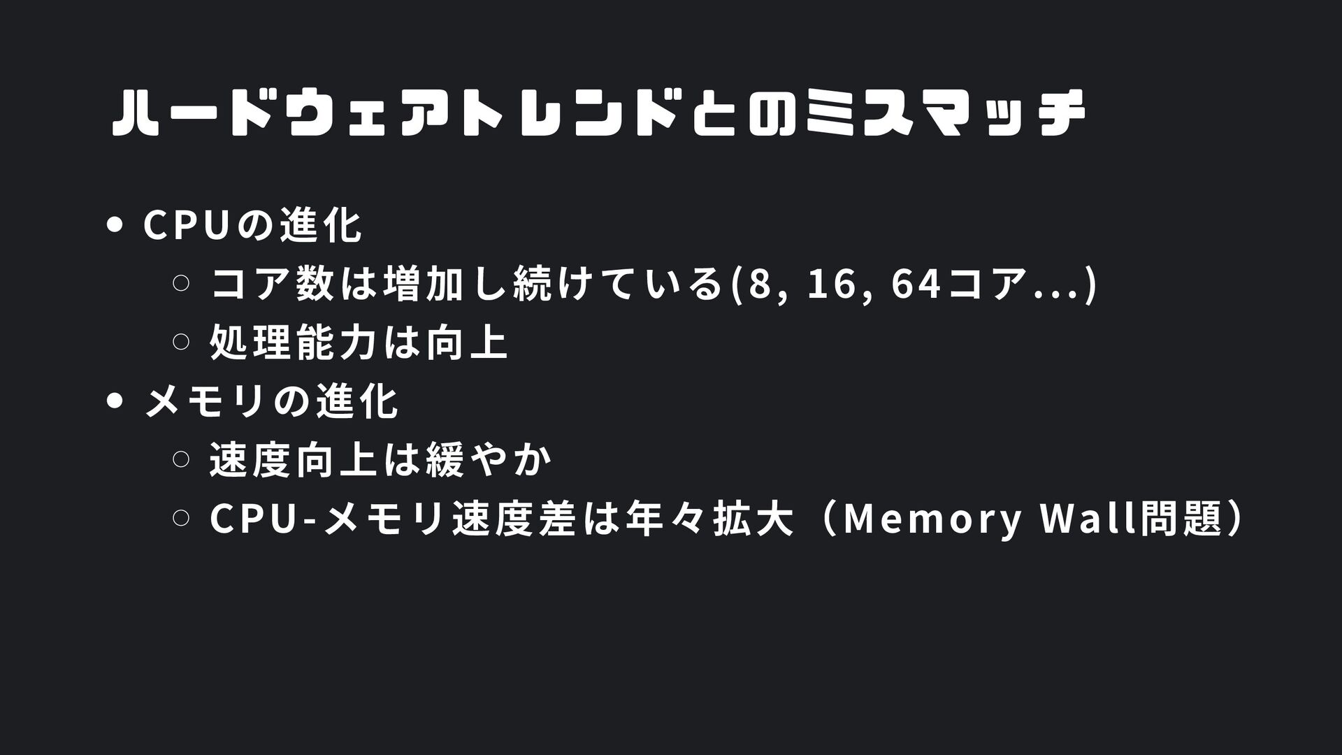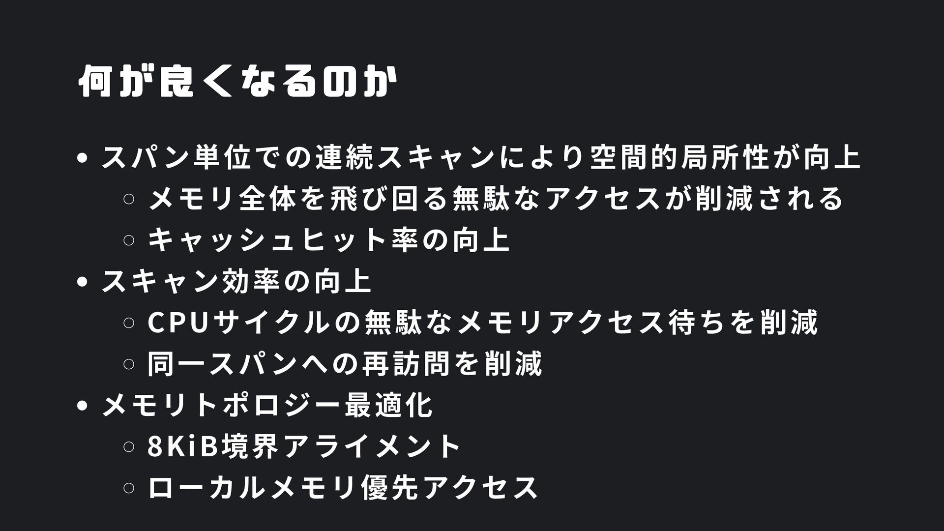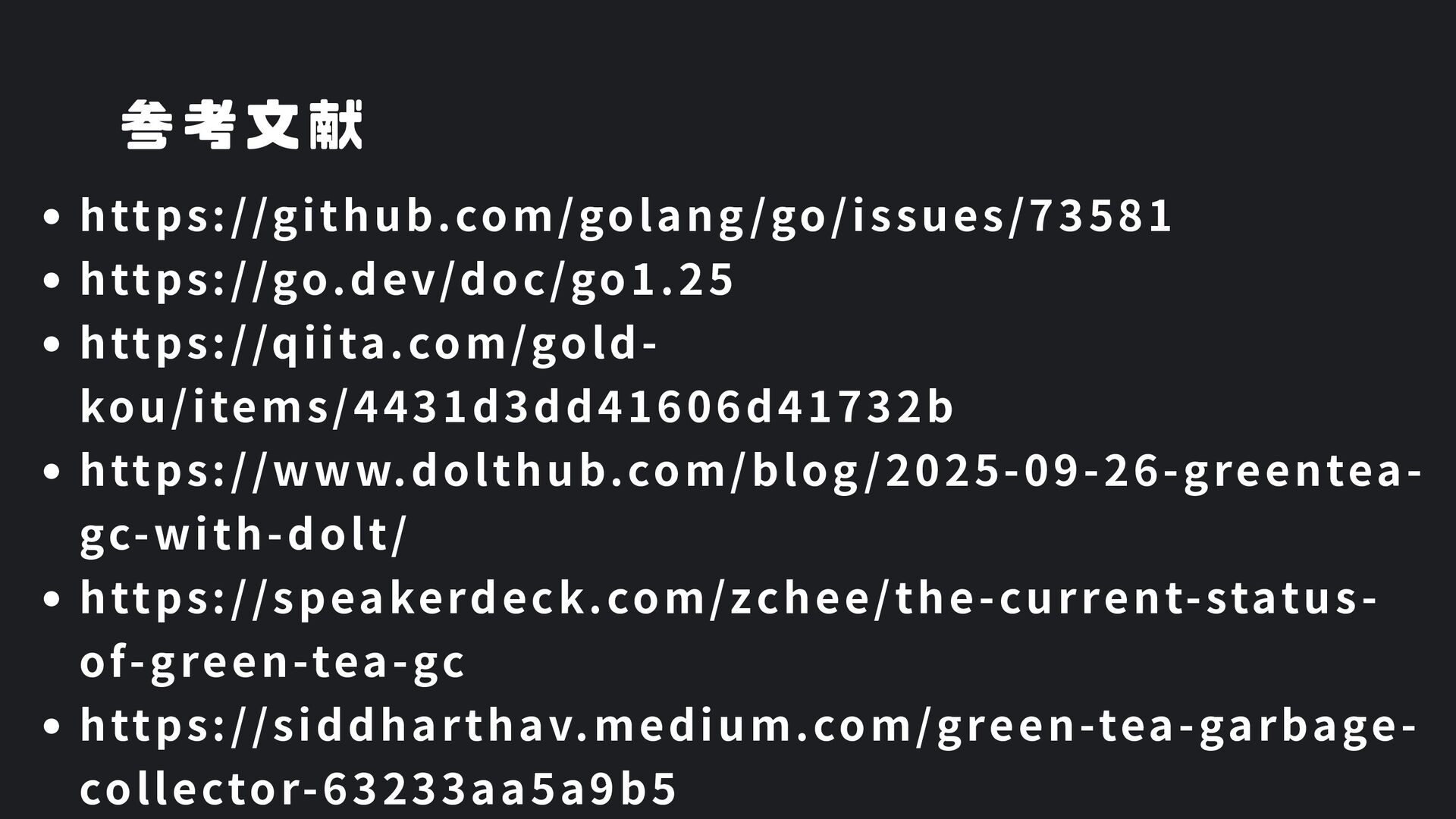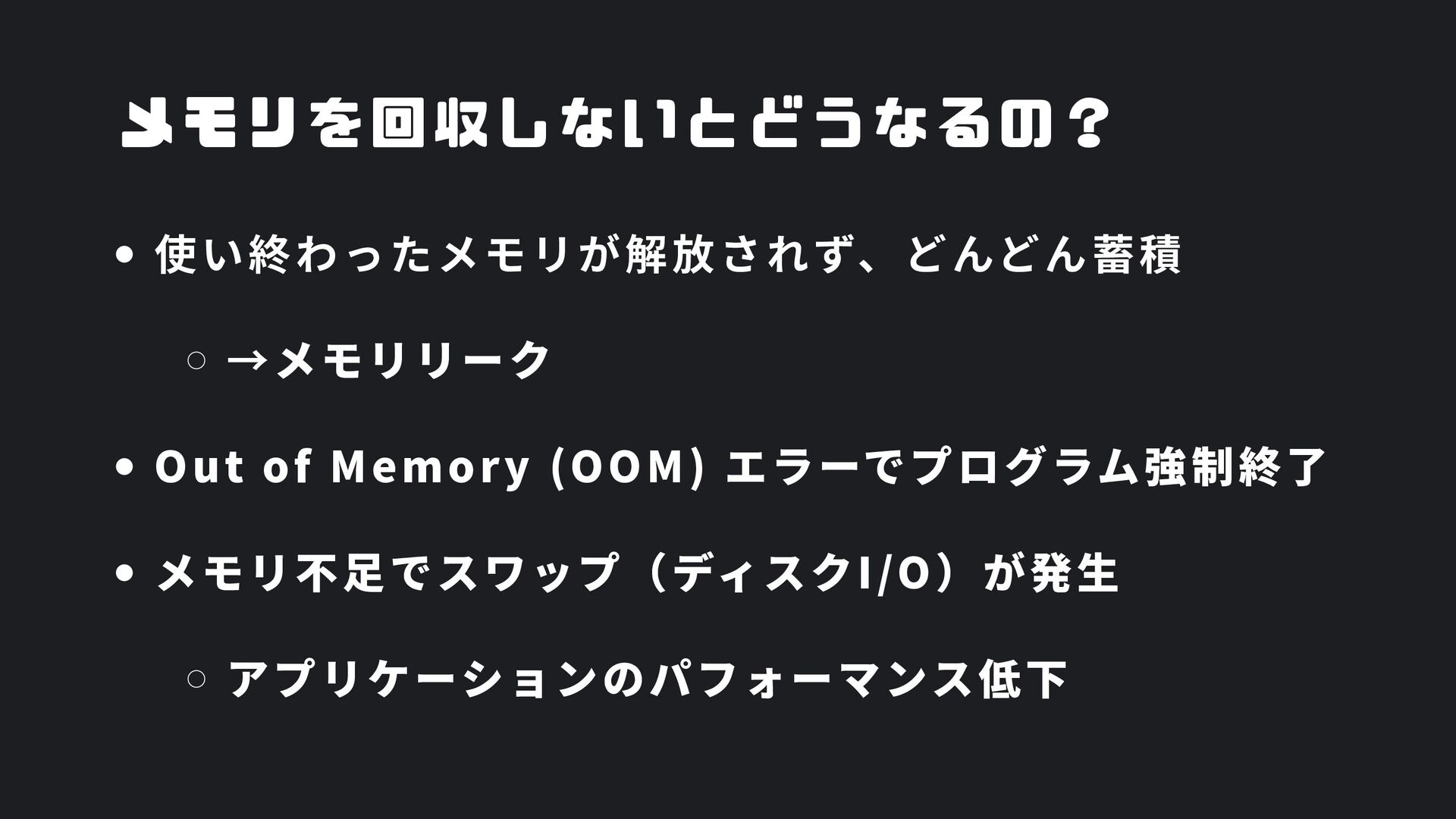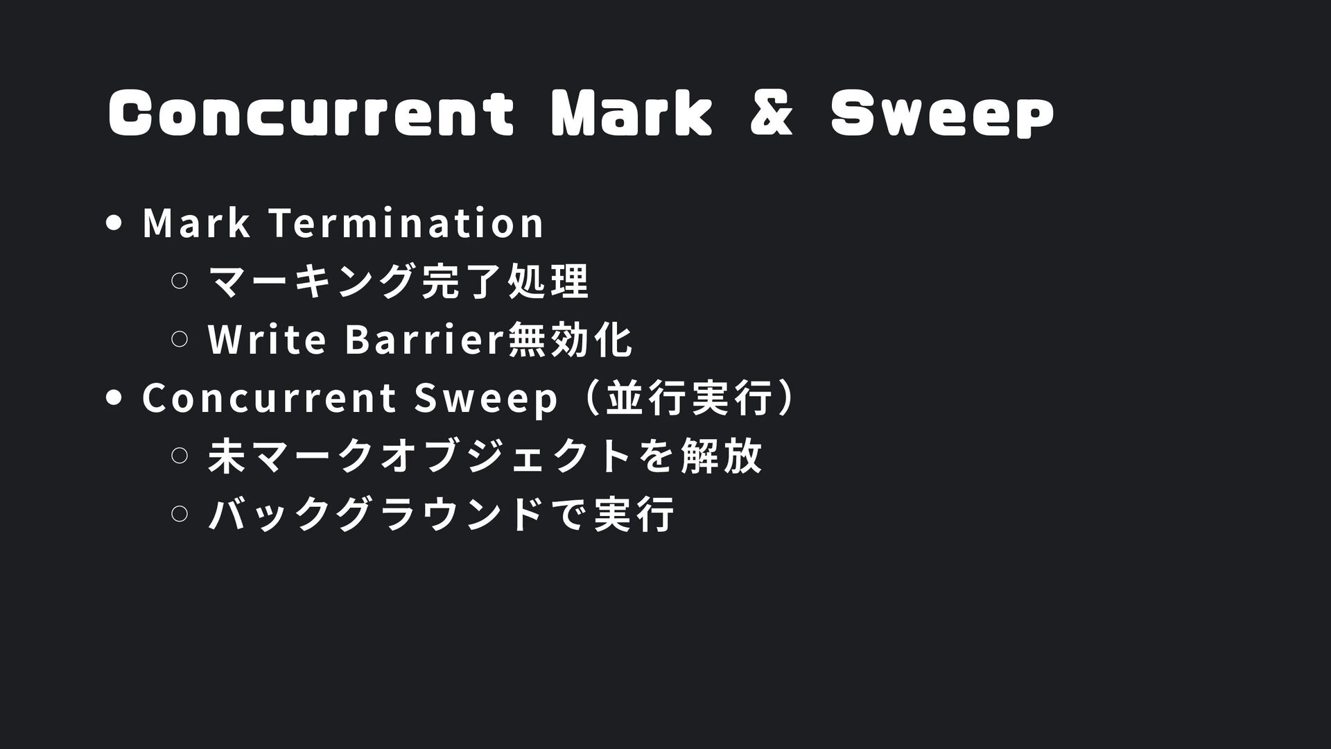 ヒープ上のConfigオブジェクト count int = 42 (プリミティブ値) users []User → ヒープ上の配列 processData() 関数 data *Data → ヒープ上のDataオブジェクト temp string = "processing" ← 現在の実行位置 スタックの特徴 • 関数の呼び出し順に積み重なる(LIFO) • 関数終了時に自動的に解放 • 高速アクセス・サイズ制限あり(通常数MB) • ローカル変数・引数・戻り先アドレスを格納 ヒープ (Heap) Config オブジェクト host: "localhost" port: 8080 db: *Database []User 配列 [0]: {name: "Alice"} [1]: {name: "Bob"} [2]: {name: "Carol"} Data オブジェクト id: 12345 content: "..." next: *Data Database オブジェクト connection: "..." pool: [...] 未参照 (ガベージ) OldData 未参照 (ガベージ) TempBuffer ヒープの特徴 • 動的にメモリを確保(new, make, malloc等) • 大きなデータ構造やオブジェクトを格納 • GCまたは手動での解放が必要 • スタックより低速だが、サイズ制限が緩い 🎯 ルートセット(GC Roots ) - ガベージコレクションの起点 1. スタック上の参照 • 実行中の関数のローカル変数 • 関数の引数 • 一時変数 例: config, users, data 2. グローバル/ 静的変数 • プログラム全体で共有 • クラスの静的フィールド • シングルトンインスタンス 例: globalCache, logger 3. レジスタ/ 実行コンテキスト • CPU レジスタ内の参照 • 実行中のスレッド状態 • Goの場合:Goroutineスタック 現在処理中の値 ⚡ なぜ重要? • これらから到達可能 = 生存 • 到達不可能 = ガベージ • GCの正確性を保証 循環参照も正しく判定可能