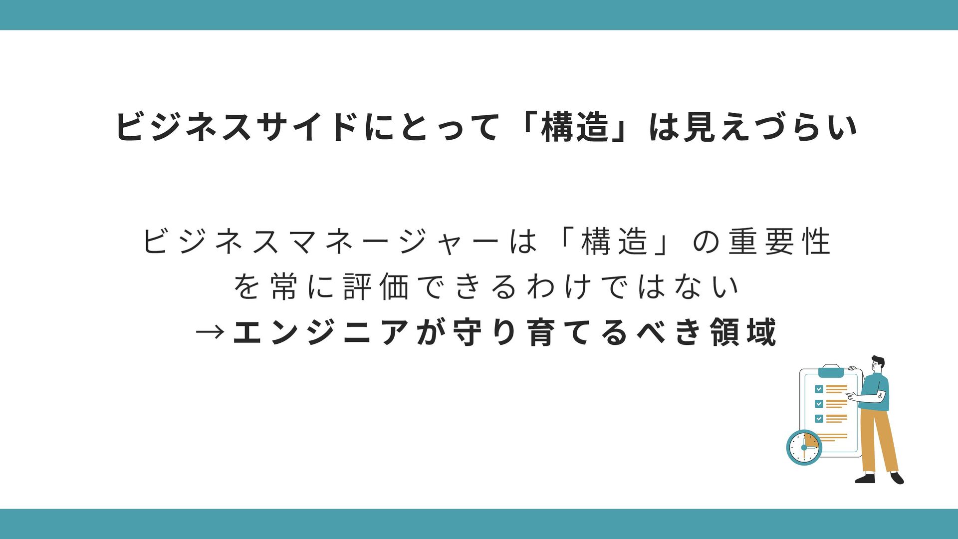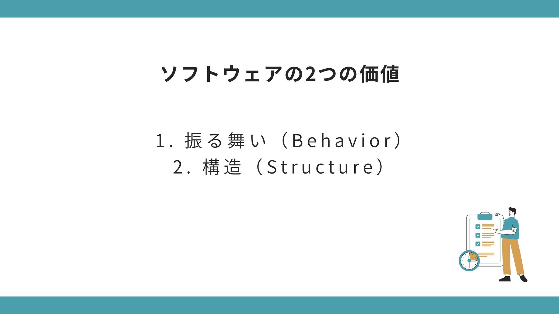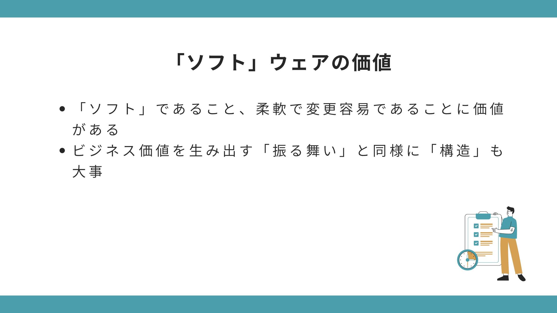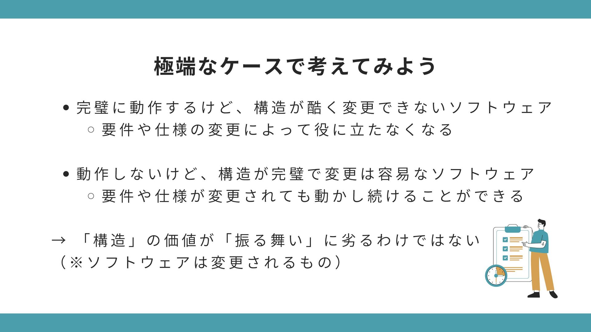 構 造 が 酷 く 変 更 で き な い ソ フ ト ウ ェ ア 要 件 や 仕 様 の 変 更 に よ っ て 役 に 立 た な く な る 動 作 し な い け ど 、 構 造 が 完 璧 で 変 更 は 容 易 な ソ フ ト ウ ェ ア 要 件 や 仕 様 が 変 更 さ れ て も 動 か し 続 け る こ と が で き る → 「 構 造 」 の 価 値 が 「 振 る 舞 い 」 に 劣 る わ け で は な い ( ※ ソ フ ト ウ ェ ア は 変 更 さ れ る も の ) 極端なケースで考えてみよう