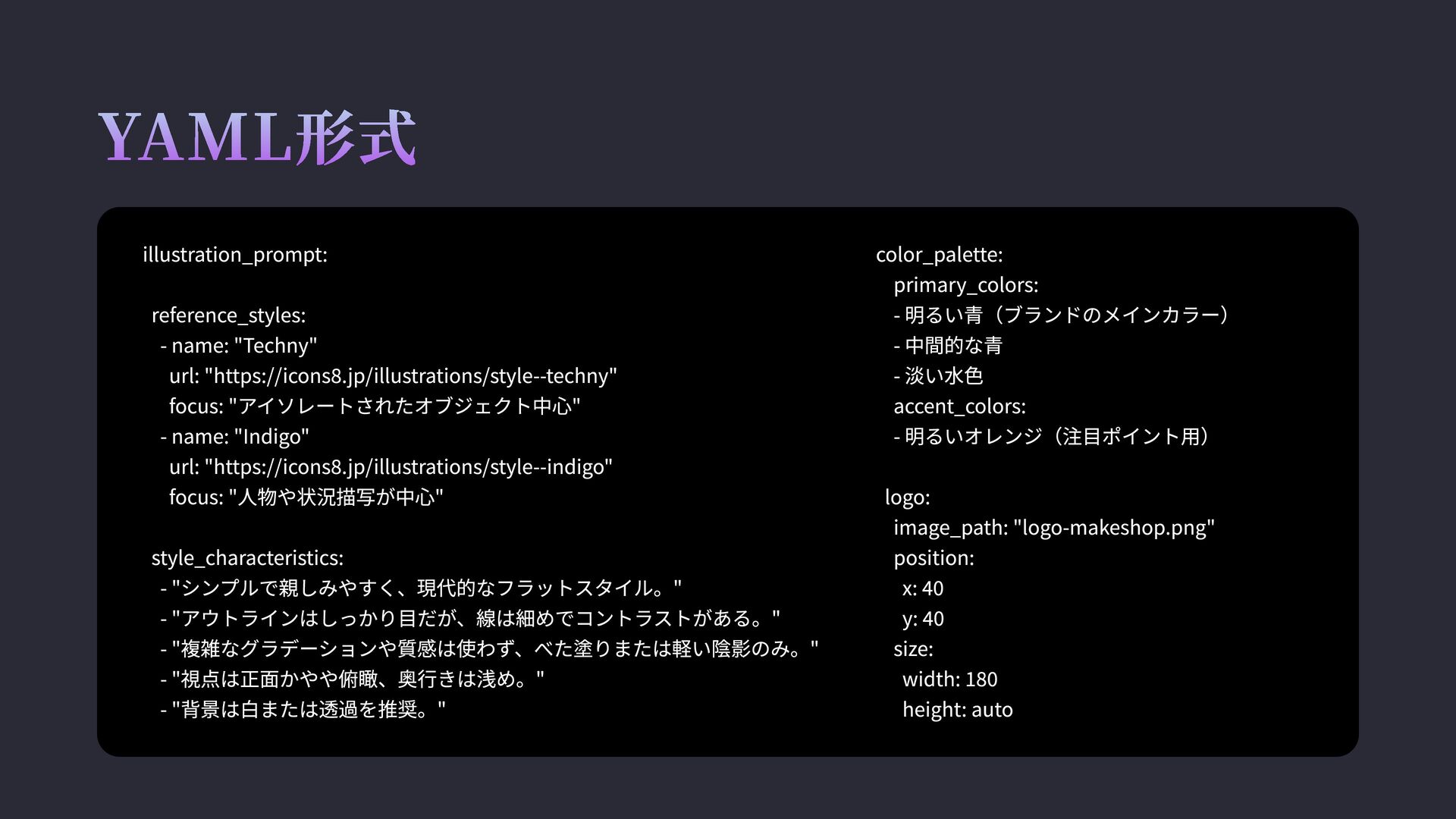 1. YAML形式 illustration_prompt: reference_styles: - name: "Techny" url: "https://icons8.jp/illustrations/style--techny" focus: "アイソレートされたオブジェクト中心"