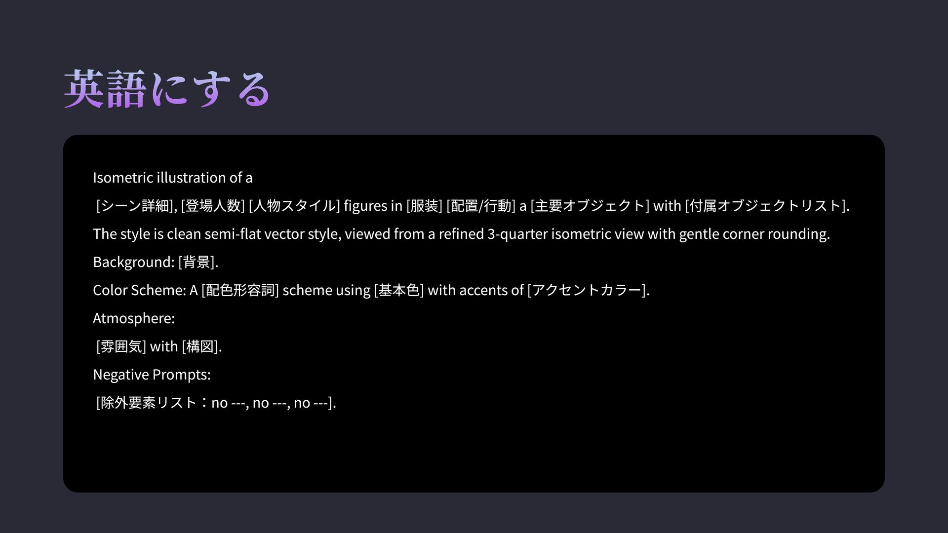 2. 英語にする Isometric illustration of a [シーン詳細], [登場人数] [人物スタイル] figures in