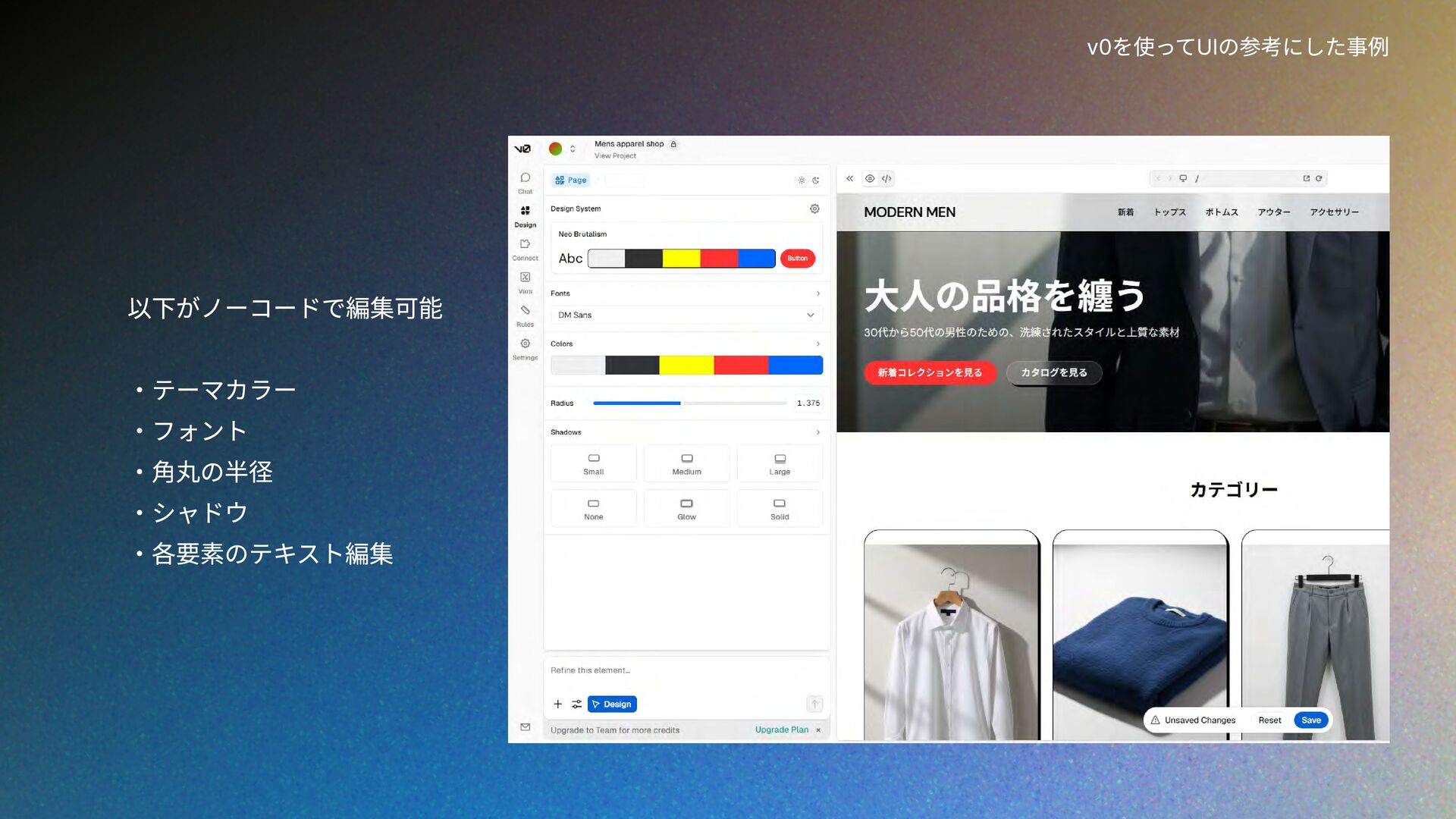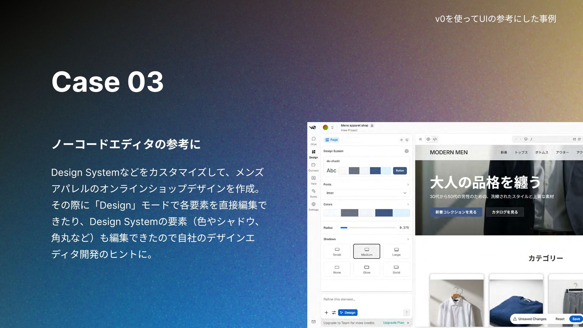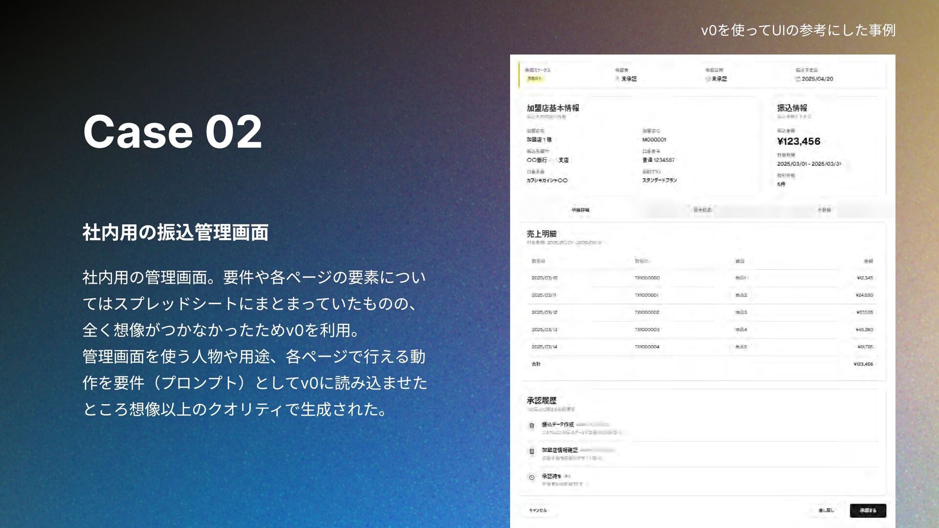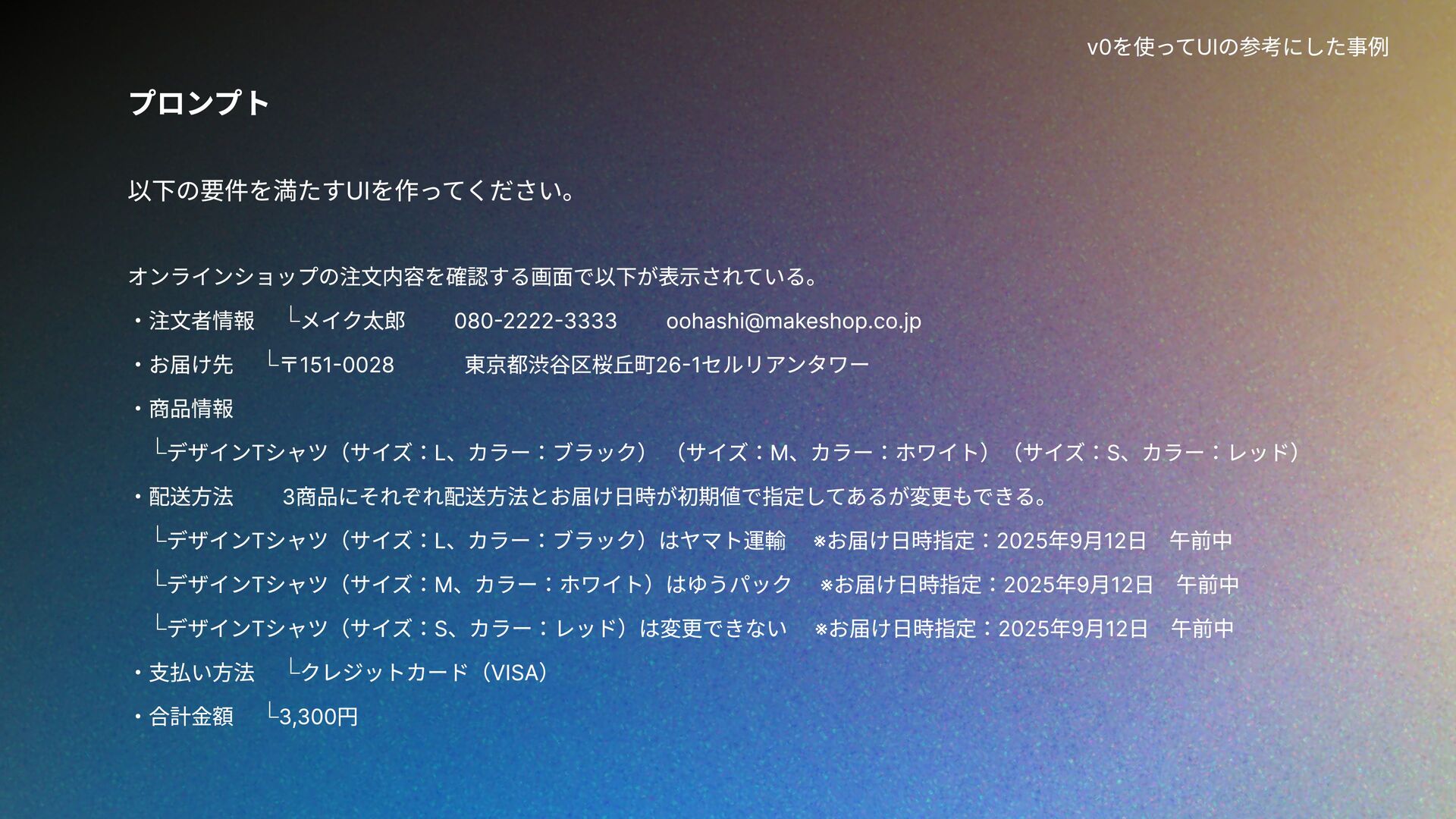 [email protected] ・お届け先   └〒151-0028       東京都渋谷区桜丘町26-1セルリアンタワー ・商品情報   └デザインTシャツ(サイズ:L、カラー:ブラック) (サイズ:M、カラー:ホワイト)(サイズ:S、カラー:レッド) ・配送方法     3商品にそれぞれ配送方法とお届け日時が初期値で指定してあるが変更もできる。   └デザインTシャツ(サイズ:L、カラー:ブラック)はヤマト運輸   ※お届け日時指定:2025年9月12日  午前中   └デザインTシャツ(サイズ:M、カラー:ホワイト)はゆうパック   ※お届け日時指定:2025年9月12日  午前中   └デザインTシャツ(サイズ:S、カラー:レッド)は変更できない   ※お届け日時指定:2025年9月12日  午前中 ・支払い方法   └クレジットカード(VISA) ・合計金額   └3,300円 v0を使ってUIの参考にした事例