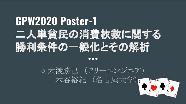 GPW2020 Poster-1 二人単貧民の消費枚数に関する 勝利条件の一般化とその解析 ◦ 大渡勝己 (フリーエンジニア) 木谷裕紀 (名古屋大学)