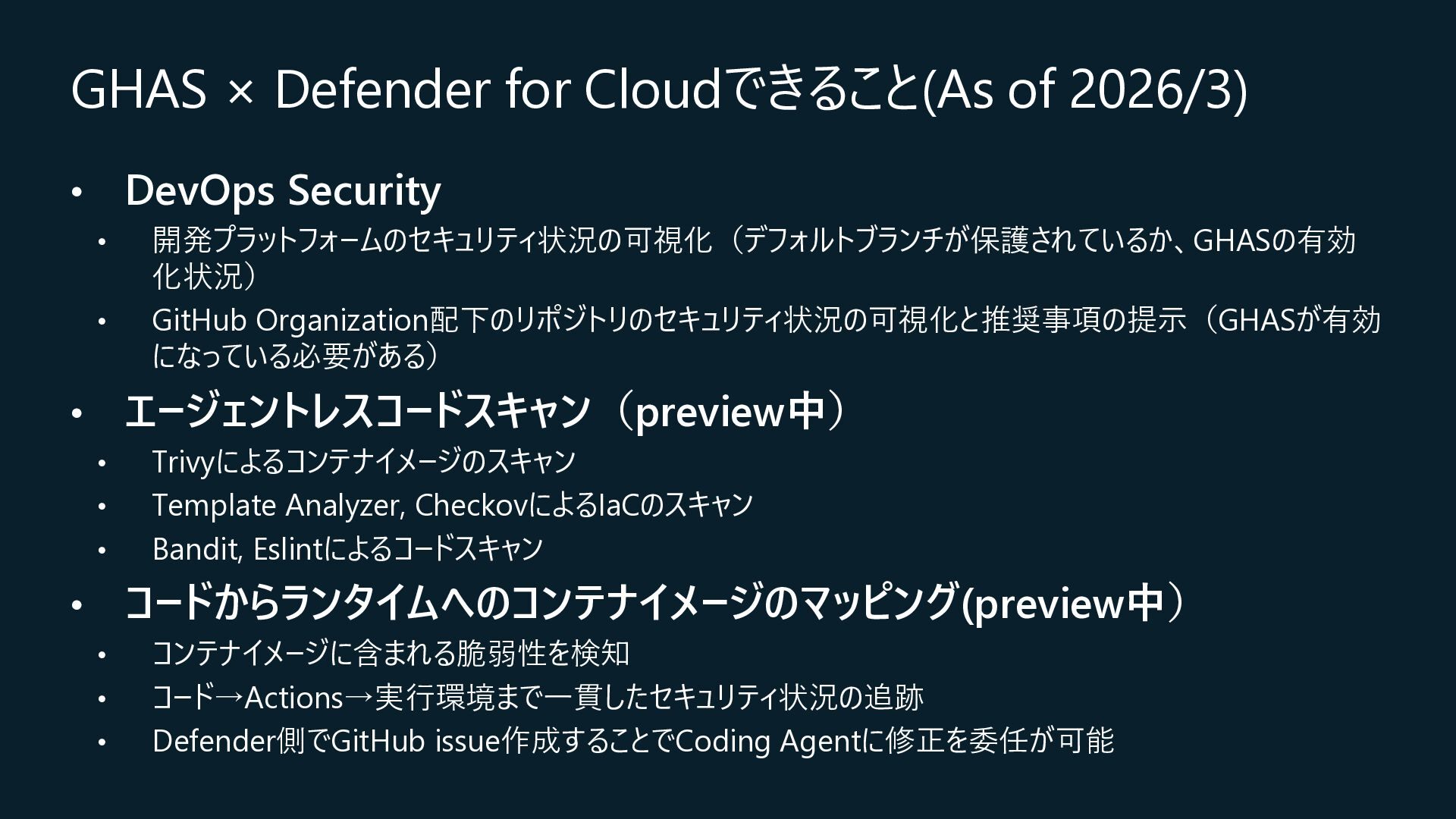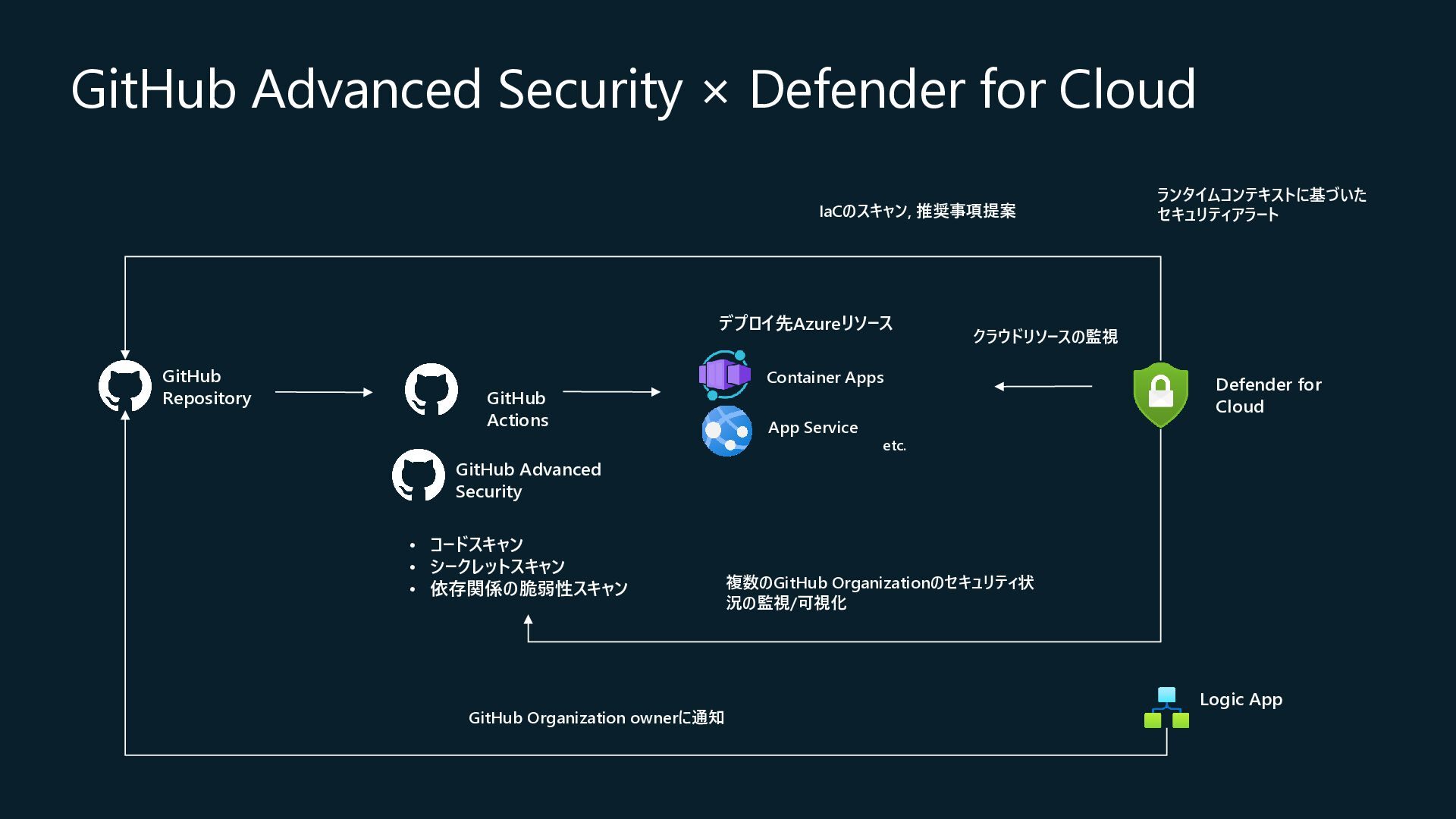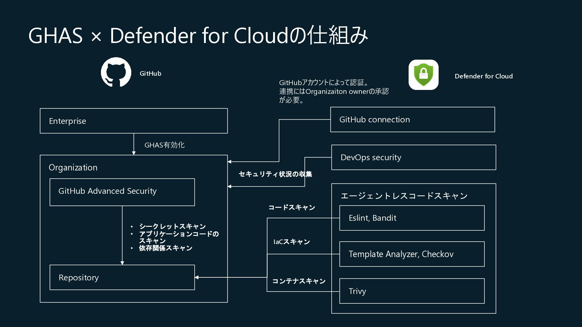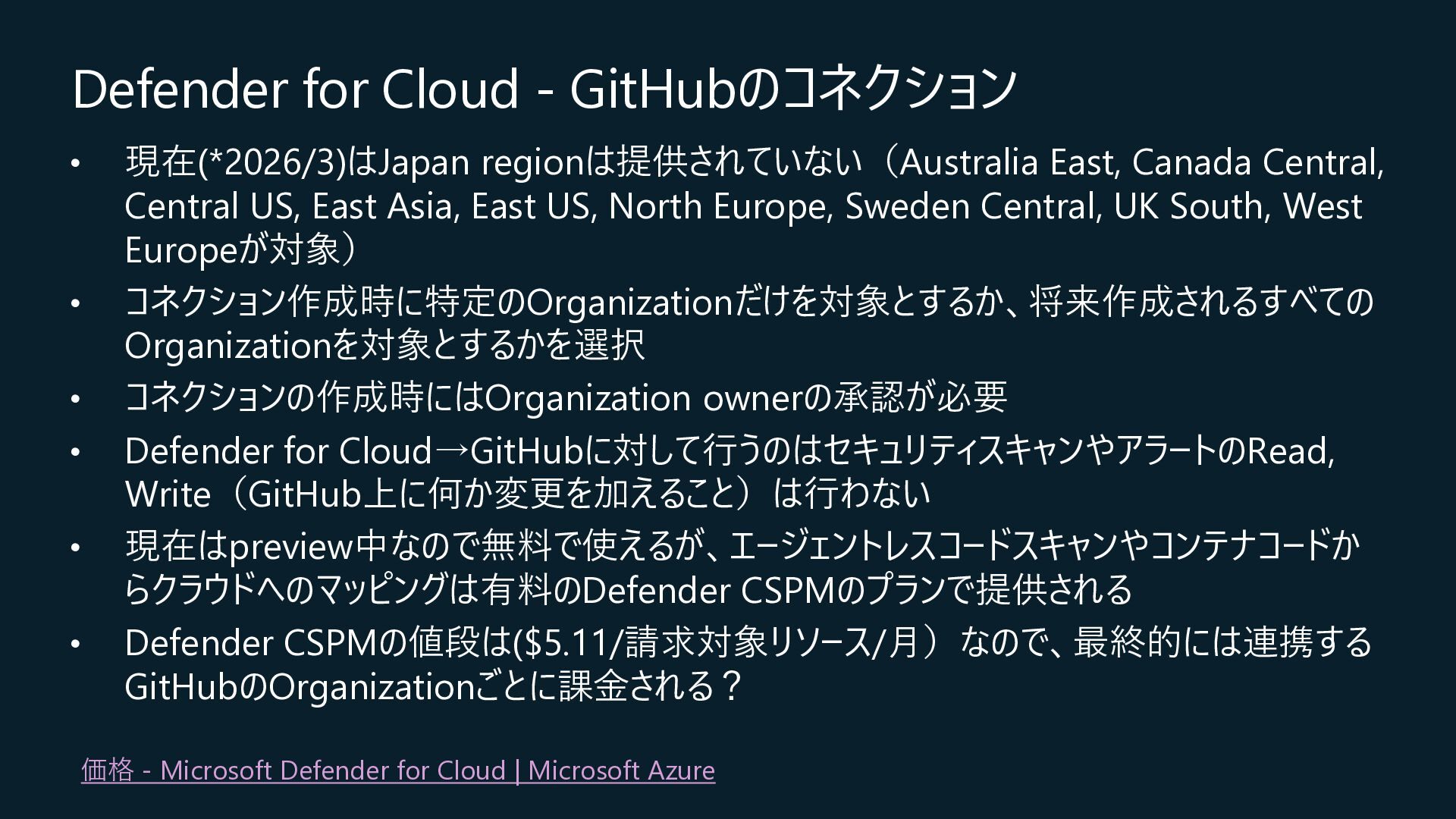 Central, Central US, East Asia, East US, North Europe, Sweden Central, UK South, West Europeが対象) • コネクション作成時に特定のOrganizationだけを対象とするか、将来作成されるすべての Organizationを対象とするかを選択 • コネクションの作成時にはOrganization ownerの承認が必要 • Defender for Cloud→GitHubに対して行うのはセキュリティスキャンやアラートのRead, Write(GitHub上に何か変更を加えること)は行わない • 現在はpreview中なので無料で使えるが、エージェントレスコードスキャンやコンテナコードか らクラウドへのマッピングは有料のDefender CSPMのプランで提供される • Defender CSPMの値段は($5.11/請求対象リソース/月)なので、最終的には連携する GitHubのOrganizationごとに課金される? 価格 - Microsoft Defender for Cloud | Microsoft Azure
