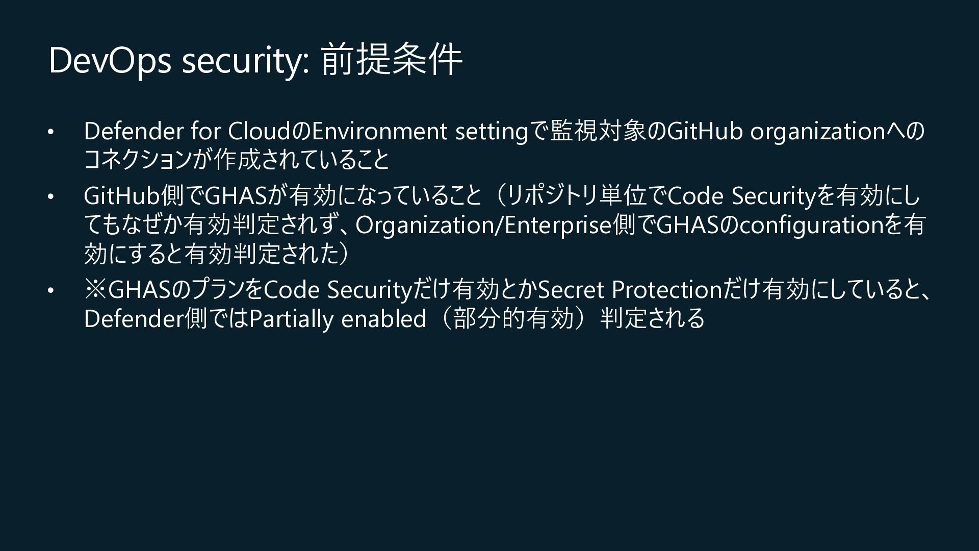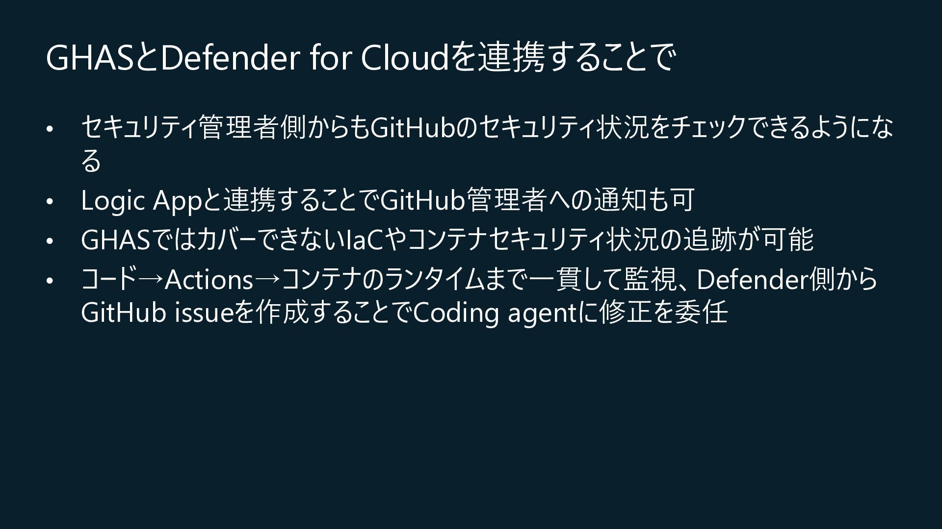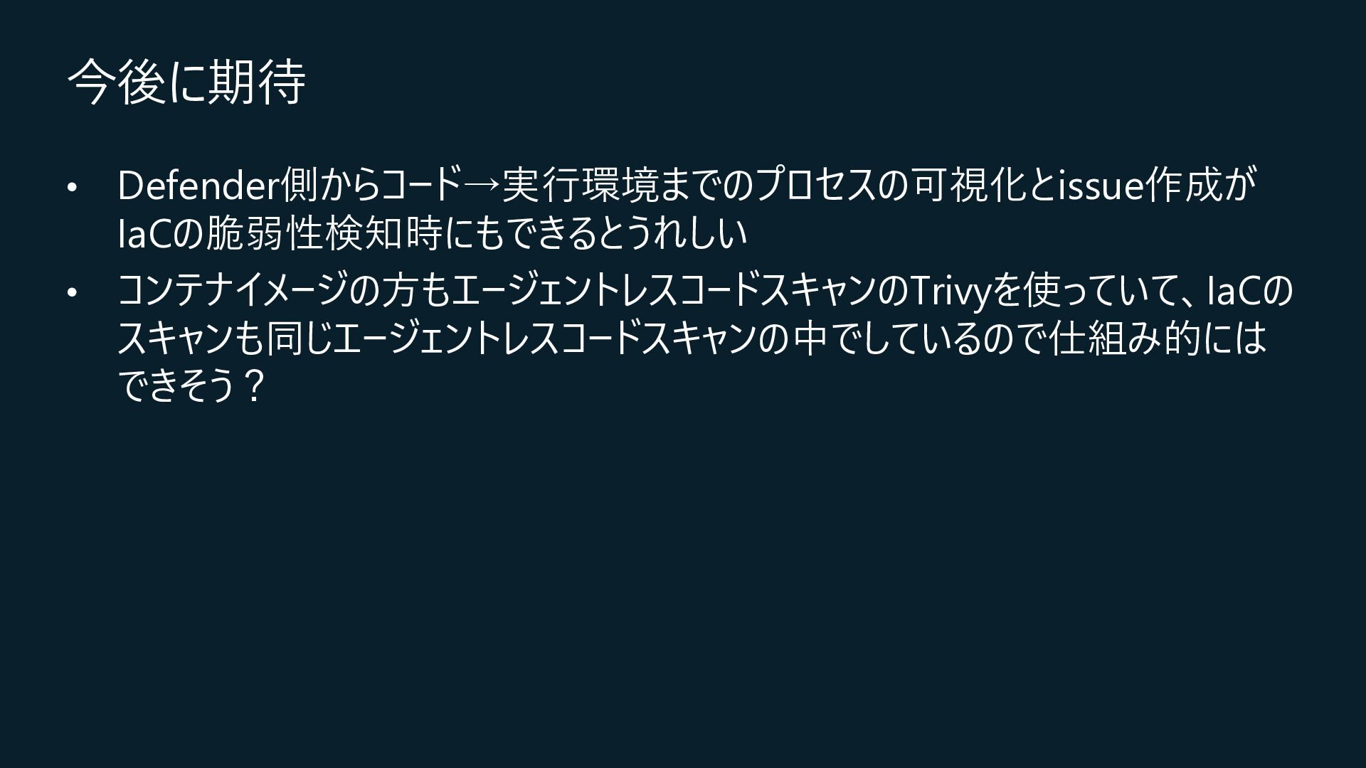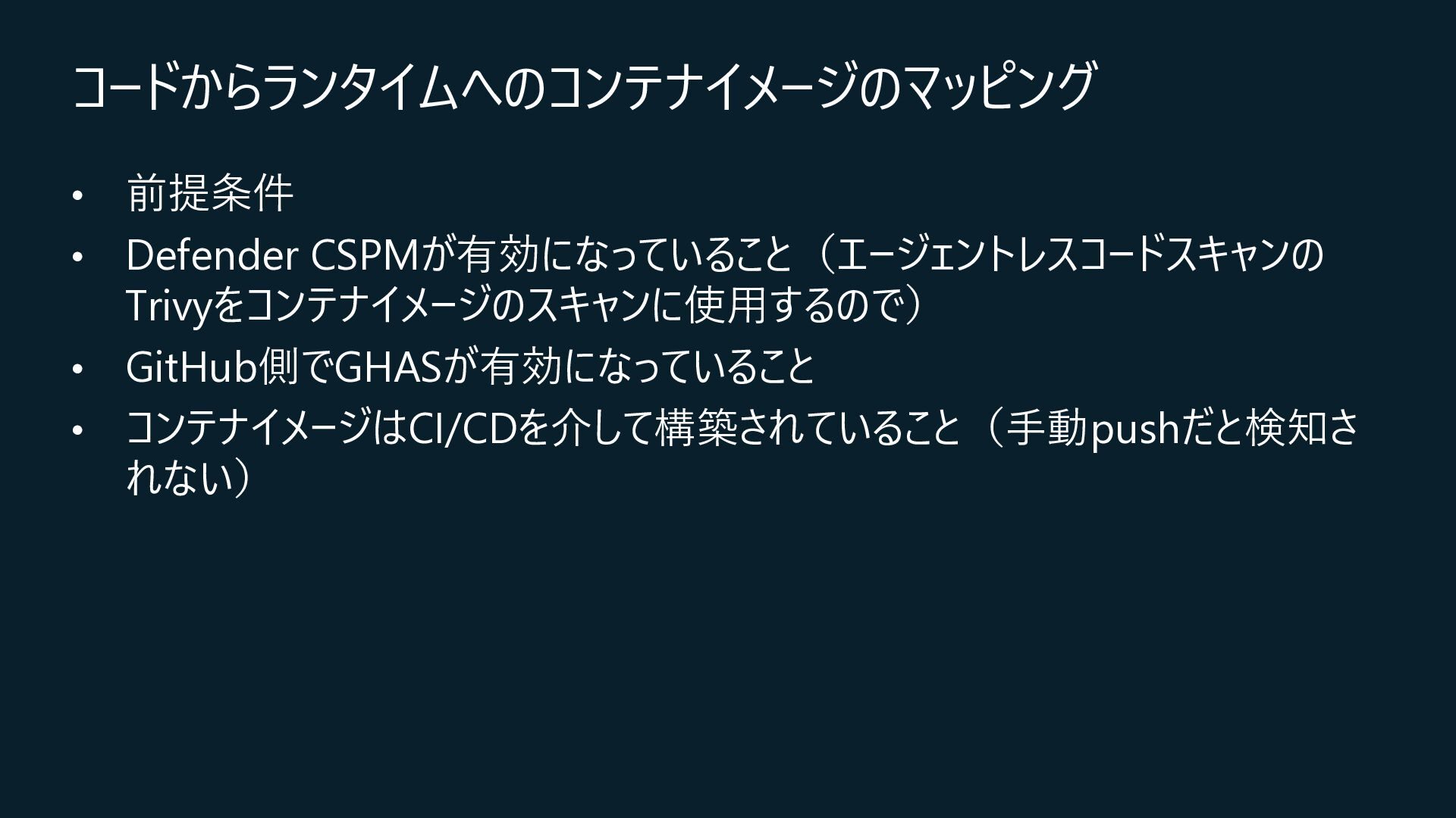 Central, Central US, East Asia, East US, North Europe, Sweden Central, UK South, West Europeが対象) • コネクション作成時に特定のOrganizationだけを対象とするか、将来作成されるすべての Organizationを対象とするかを選択 • コネクションの作成時にはOrganization ownerの承認が必要 • Defender for Cloud→GitHubに対して行うのはセキュリティスキャンやアラートのRead, Write(GitHub上に何か変更を加えること)は行わない • 現在はpreview中なので無料で使えるが、エージェントレスコードスキャンやコンテナコードか らクラウドへのマッピングは有料のDefender CSPMのプランで提供される • Defender CSPMの値段は($5.11/請求対象リソース/月)なので、最終的には連携する GitHubのOrganizationごとに課金される? 価格 - Microsoft Defender for Cloud | Microsoft Azure