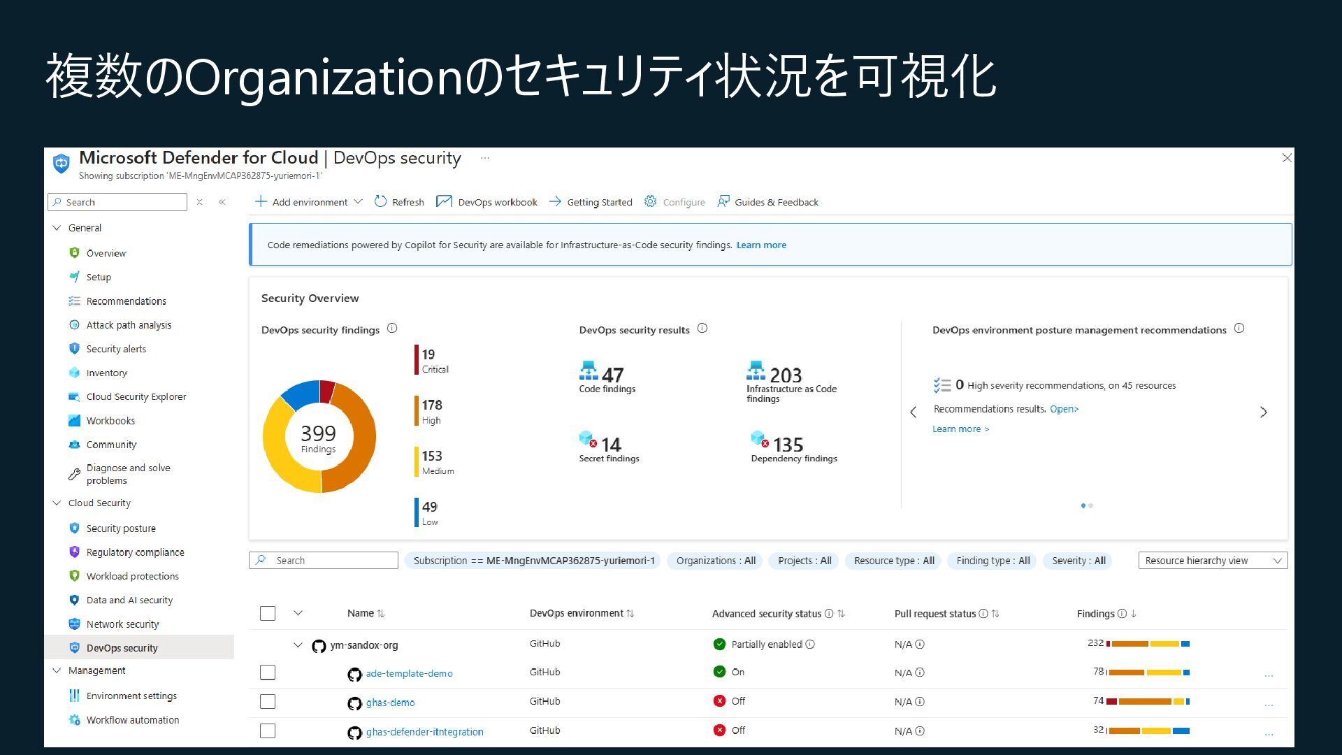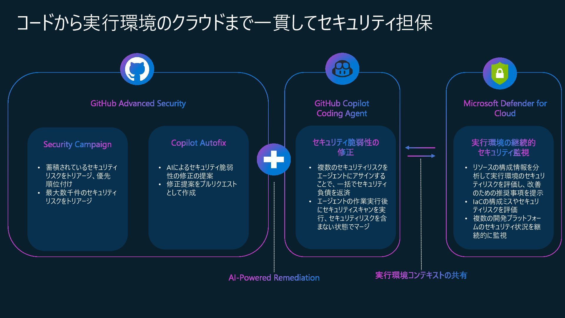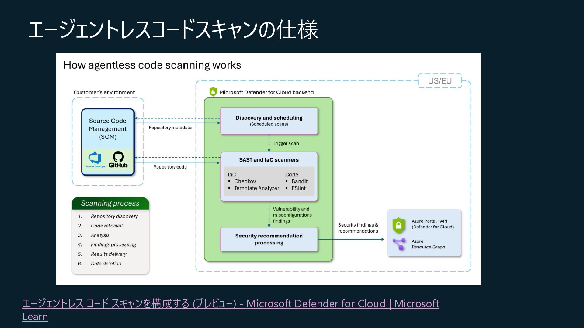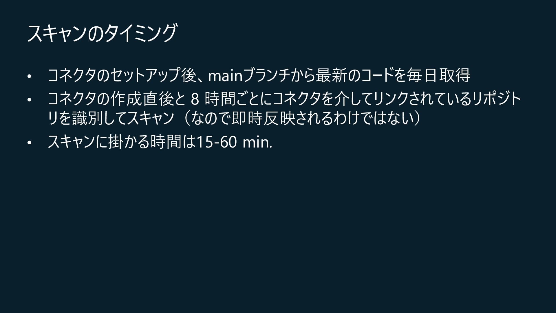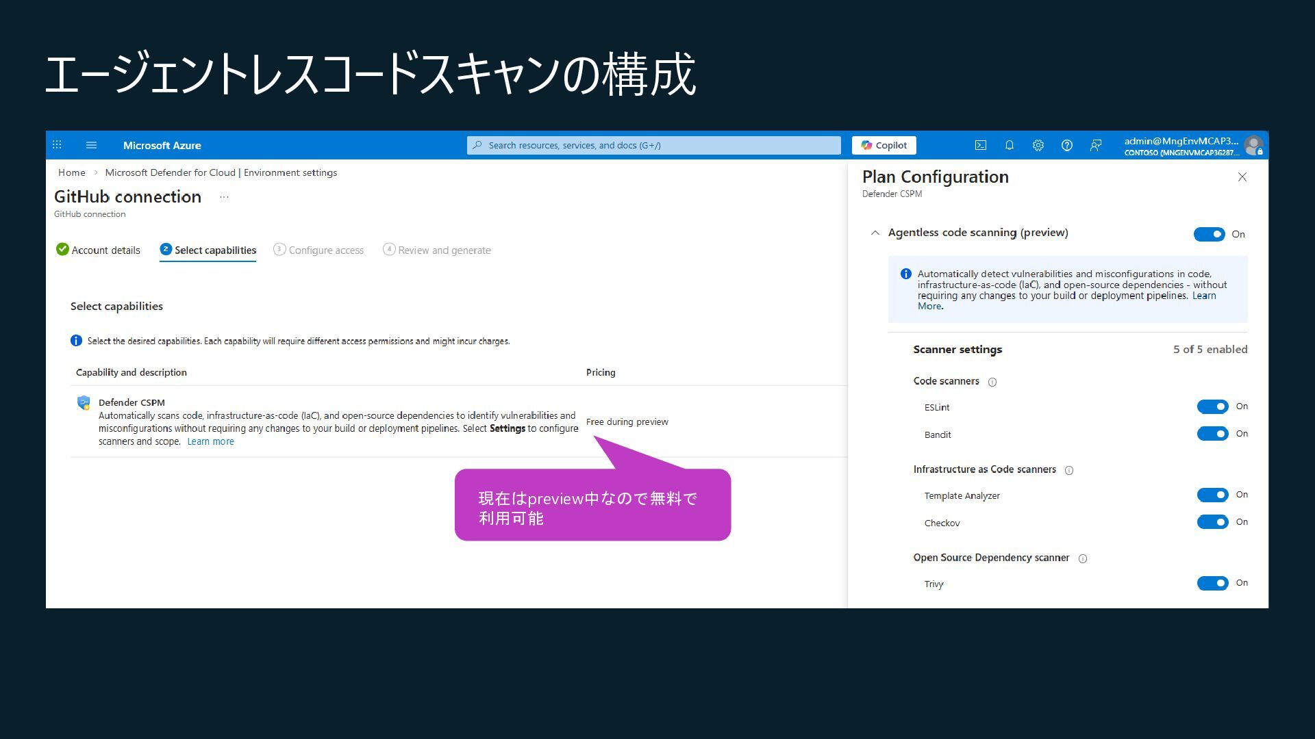 Central, Central US, East Asia, East US, North Europe, Sweden Central, UK South, West Europeが対象) • コネクション作成時に特定のOrganizationだけを対象とするか、将来作成されるすべての Organizationを対象とするかを選択 • コネクションの作成時にはOrganization ownerの承認が必要 • Defender for Cloud→GitHubに対して行うのはセキュリティスキャンやアラートのRead, Write(GitHub上に何か変更を加えること)は行わない • 現在はpreview中なので無料で使えるが、エージェントレスコードスキャンやコンテナコードか らクラウドへのマッピングは有料のDefender CSPMのプランで提供される • Defender CSPMの値段は($5.11/請求対象リソース/月)なので、最終的には連携する GitHubのOrganizationごとに課金される? 価格 - Microsoft Defender for Cloud | Microsoft Azure