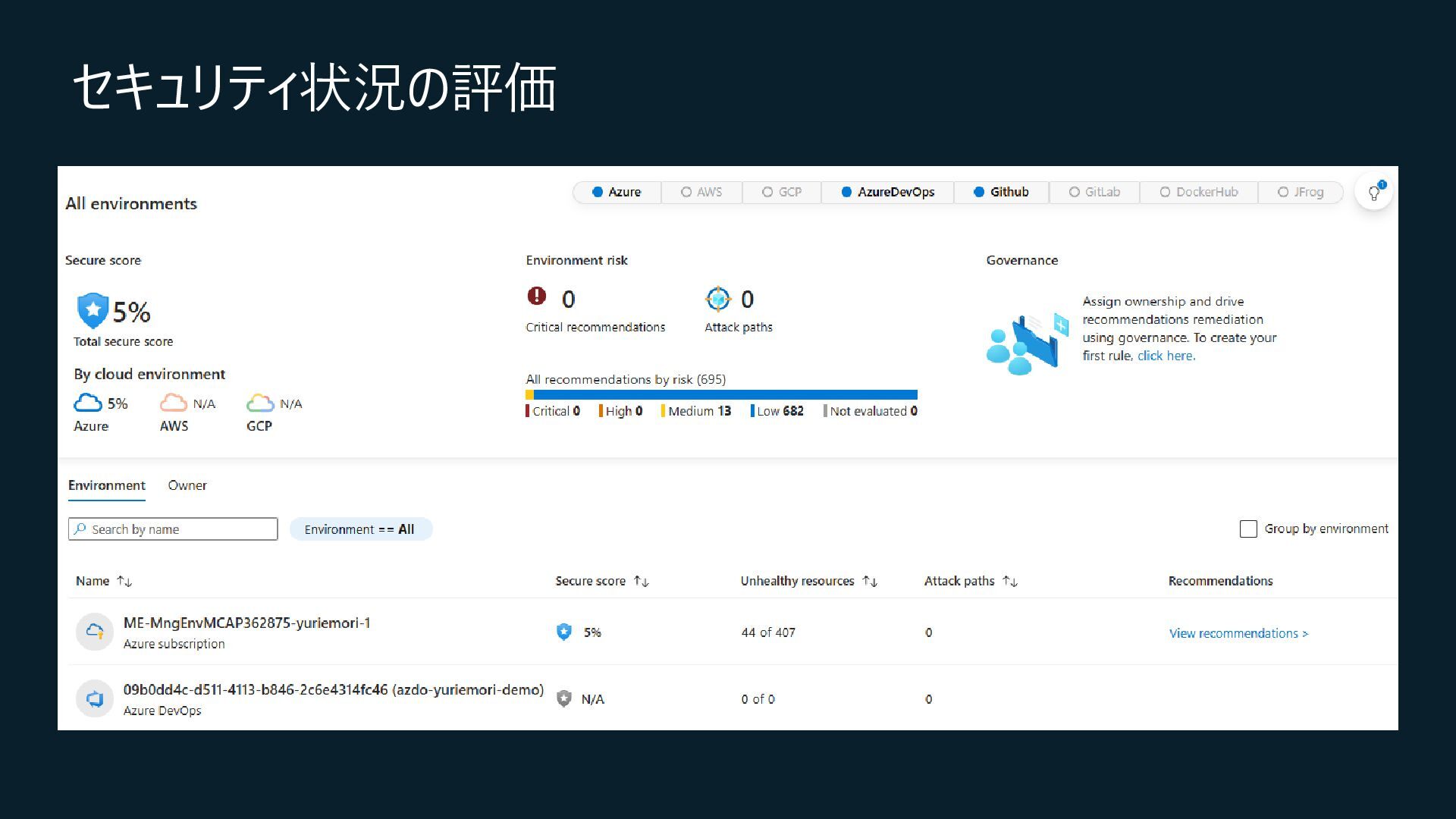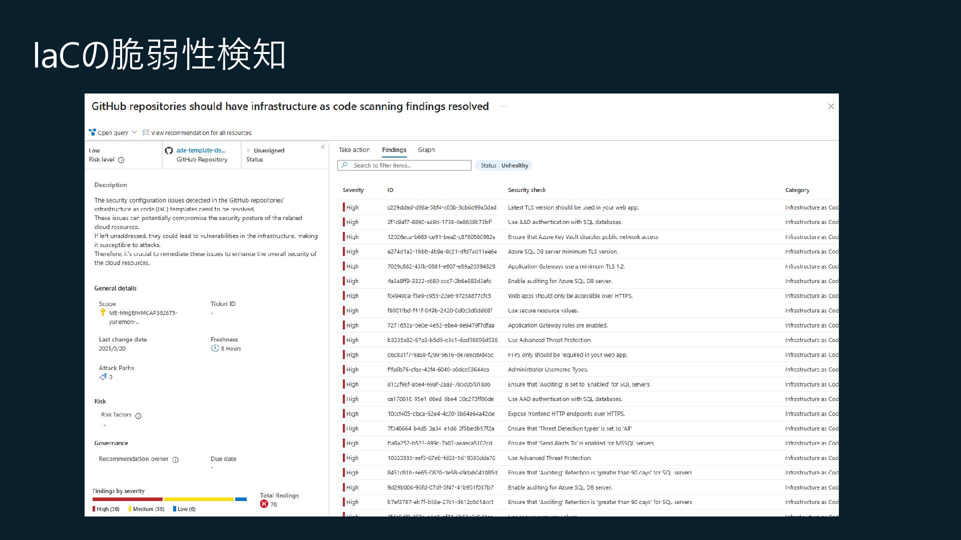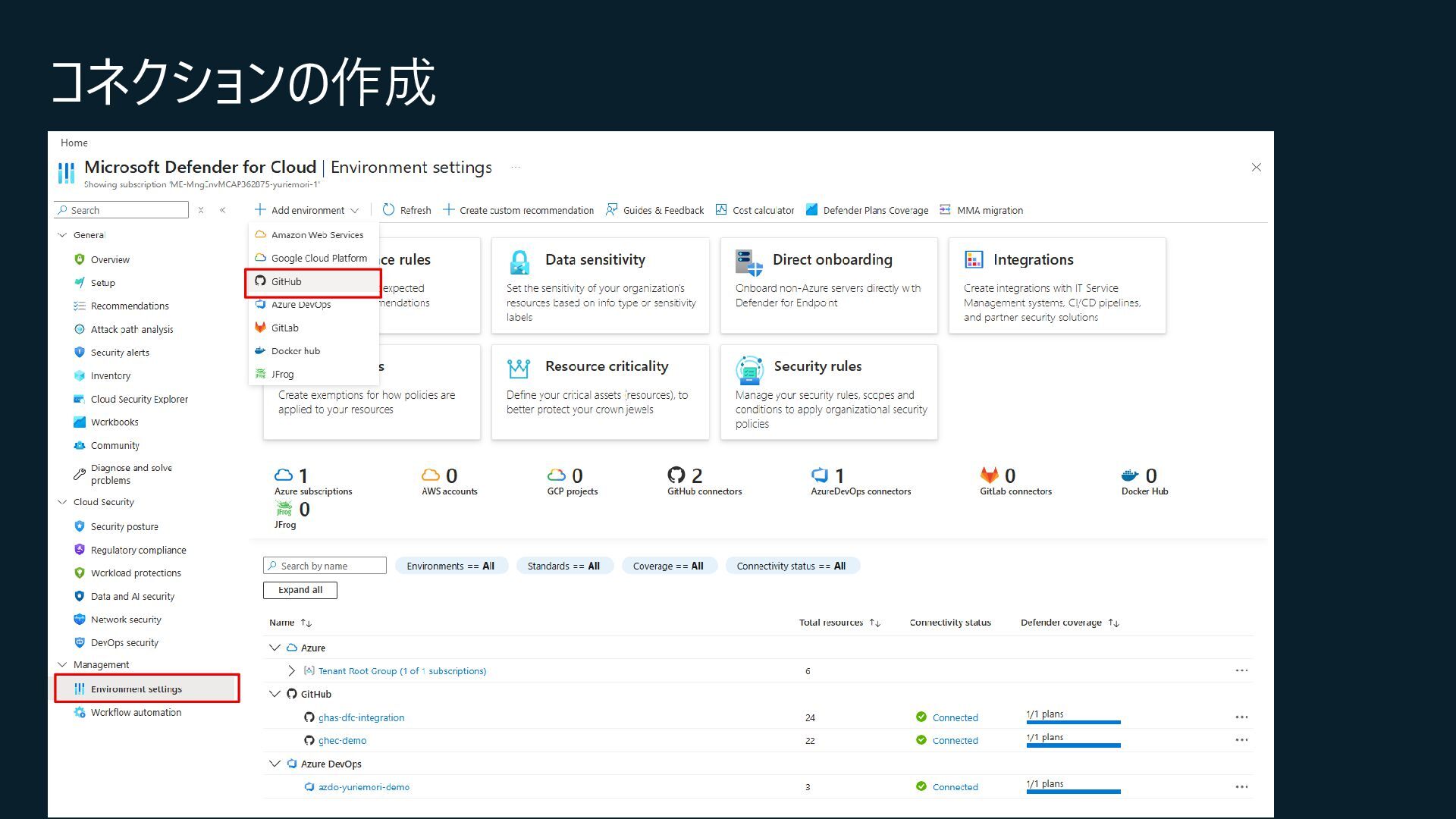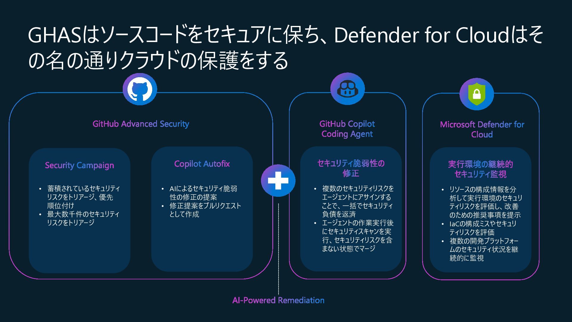 Central, Central US, East Asia, East US, North Europe, Sweden Central, UK South, West Europeが対象) • コネクション作成時に特定のOrganizationだけを対象とするか、将来作成されるすべての Organizationを対象とするかを選択 • コネクションの作成時にはOrganization ownerの承認が必要 • Defender for Cloud→GitHubに対して行うのはセキュリティスキャンやアラートのRead, Write(GitHub上に何か変更を加えること)は行わない • 現在はpreview中なので無料で使えるが、エージェントレスコードスキャンやコンテナコードか らクラウドへのマッピングは有料のDefender CSPMのプランで提供される • Defender CSPMの値段は($5.11/請求対象リソース/月)なので、最終的には連携する GitHubのOrganizationごとに課金される? 価格 - Microsoft Defender for Cloud | Microsoft Azure