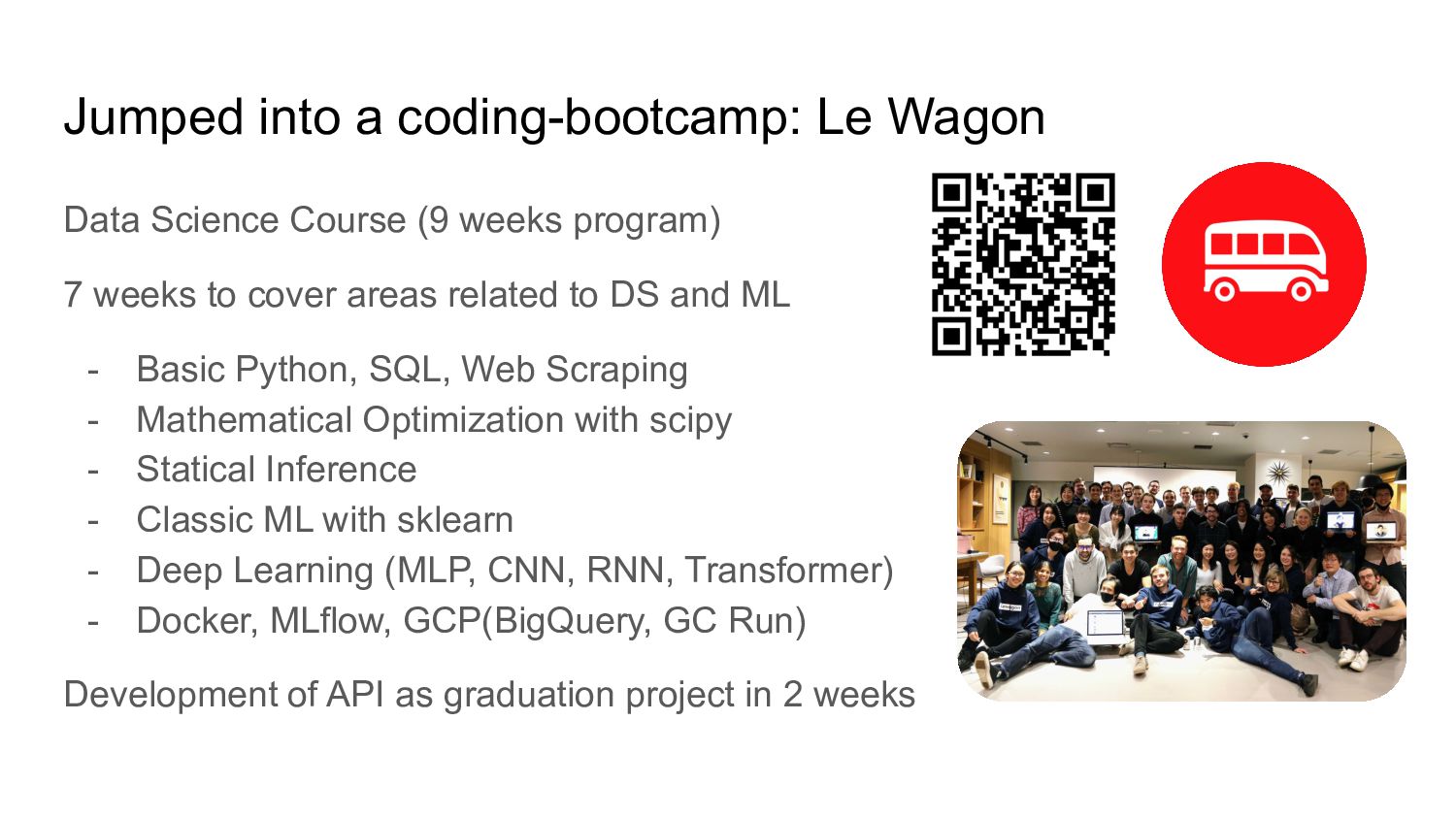 weeks program) 7 weeks to cover areas related to DS and ML - Basic Python, SQL, Web Scraping - Mathematical Optimization with scipy - Statical Inference - Classic ML with sklearn - Deep Learning (MLP, CNN, RNN, Transformer) - Docker, MLflow, GCP(BigQuery, GC Run) Development of API as graduation project in 2 weeks