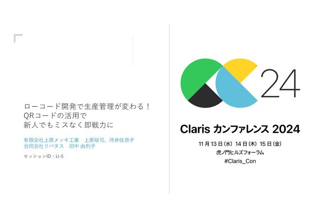 ローコード開発で⽣産管理が変わる! QRコードの活⽤で 新⼈でもミスなく即戦⼒に セッションID:U-5 有限会社上原メッキ⼯業 上原裕司、待井佳奈⼦ 合同会社リバタス ⽥中 由利⼦
