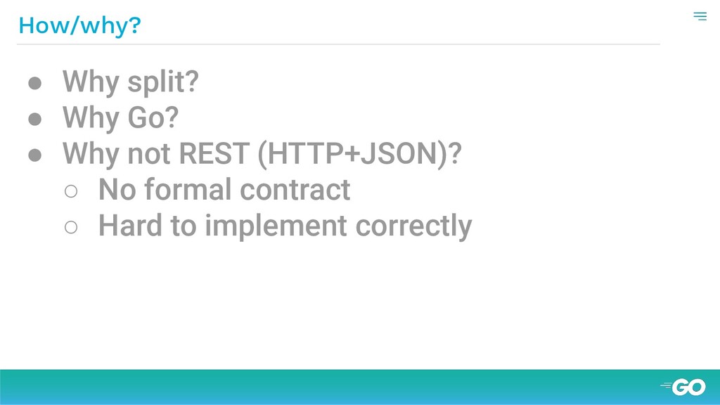 prone • API spec • gRPC ◦ HTTP2 + language support • Type safety • Plugins • Dev ramp up speed The bad • Code generation • Model conversions ◦ Nested messages • Hard/scary to get started ◦ Documentation • API versioning
