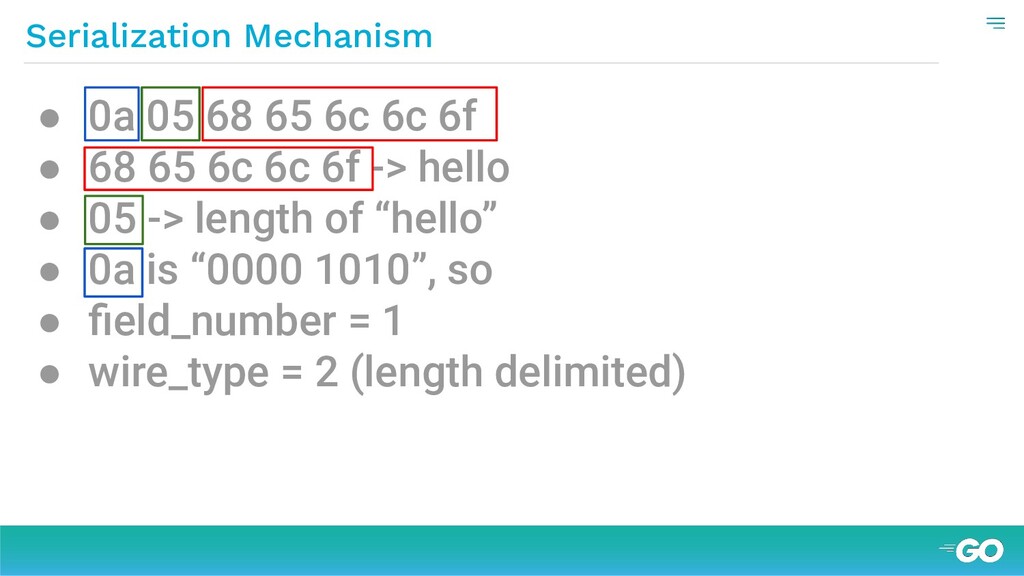 • 68 65 6c 6c 6f -> hello • 05 -> length of “hello” • 0a is “0000 1010”, so • field_number = 1 • wire_type = 2 (length delimited)