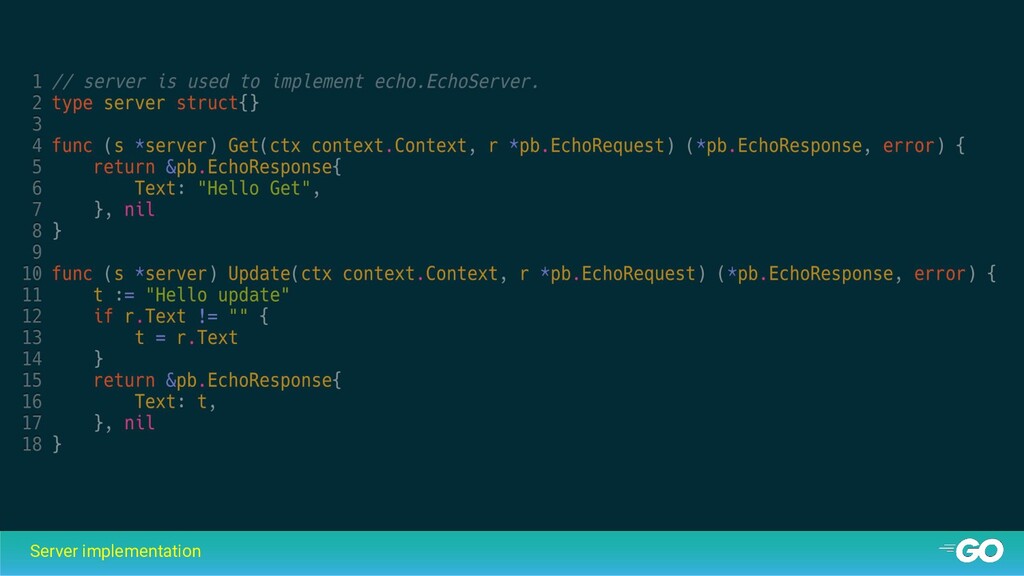 Let’s generate • protoc --go_out=:. ./echo.proto ◦ Default protobuf generation
