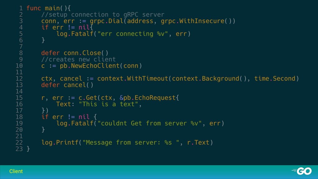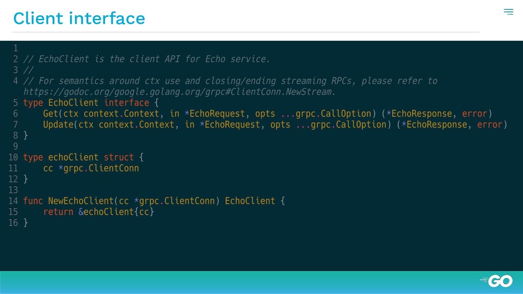 • protoc --go_out=plugins=grpc:. ./echo.proto ◦ Client and Server interface ◦ gRPC