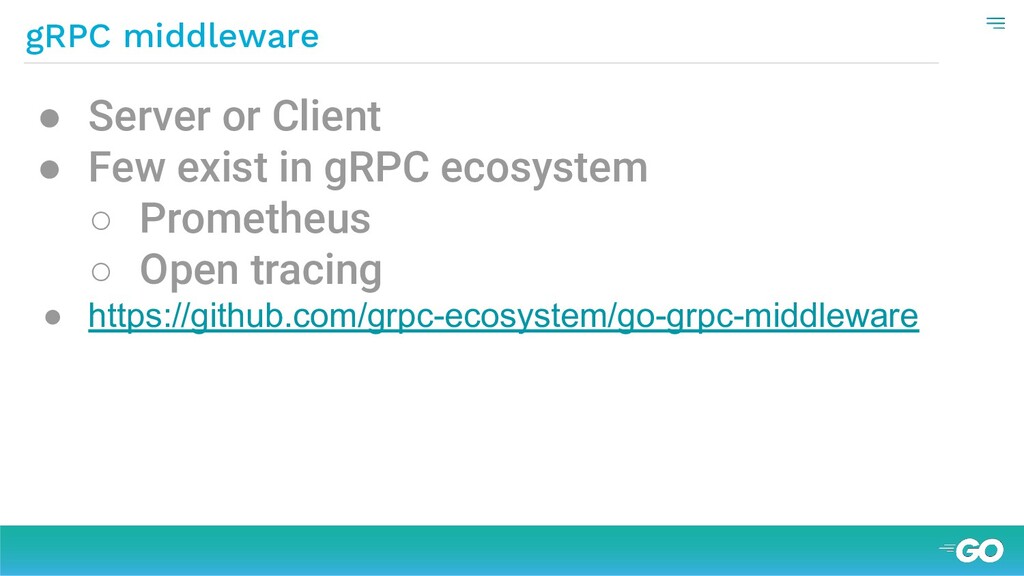 gRPC ecosystem ◦ Prometheus ◦ Open tracing • https://github.com/grpc-ecosystem/go-grpc-middleware