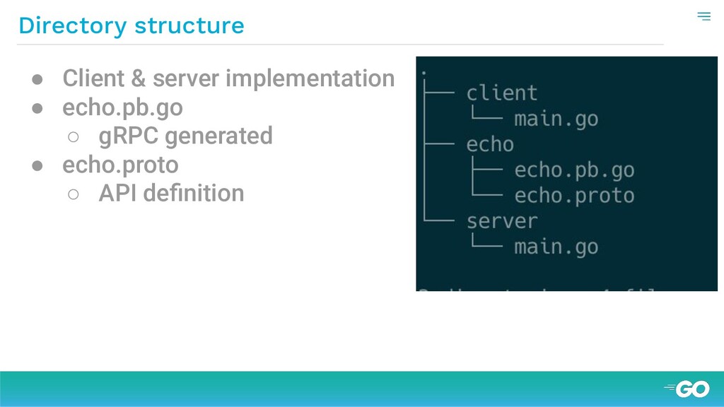 Directory structure • Client & server implementation • echo.pb.go ◦