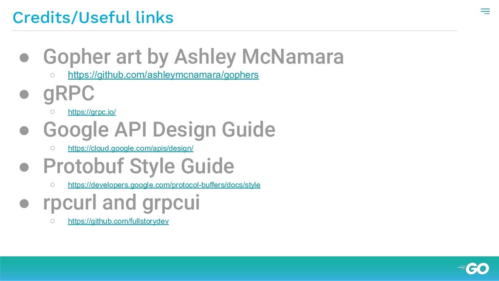 • gRPC ◦ https://grpc.io/ • Google API Design Guide ◦ https://cloud.google.com/apis/design/ • Protobuf Style Guide ◦ https://developers.google.com/protocol-buffers/docs/style • rpcurl and grpcui ◦ https://github.com/fullstorydev