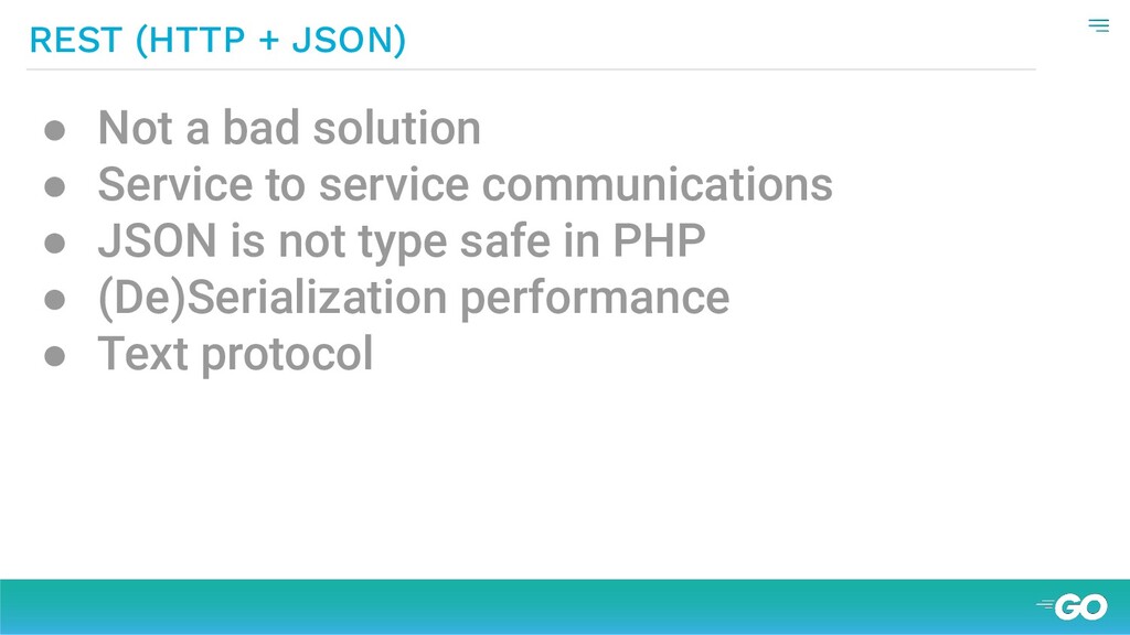 Service to service communications • JSON is not type safe in PHP • (De)Serialization performance • Text protocol