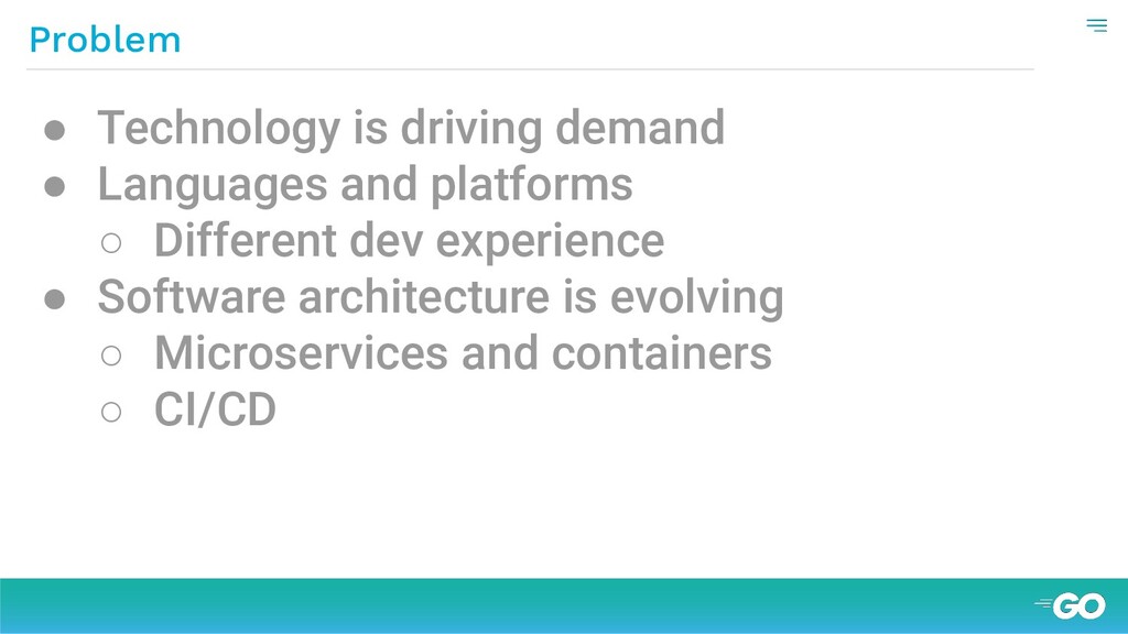 ◦ Different dev experience • Software architecture is evolving ◦ Microservices and containers ◦ CI/CD