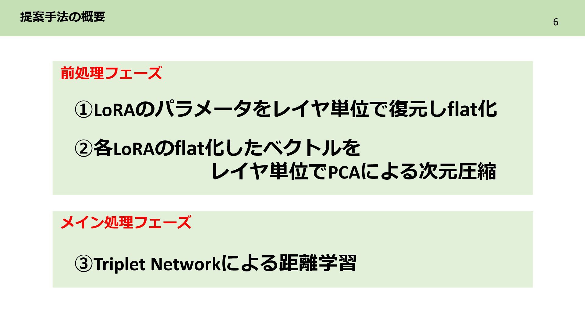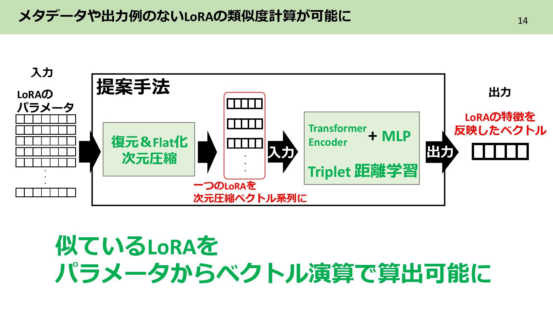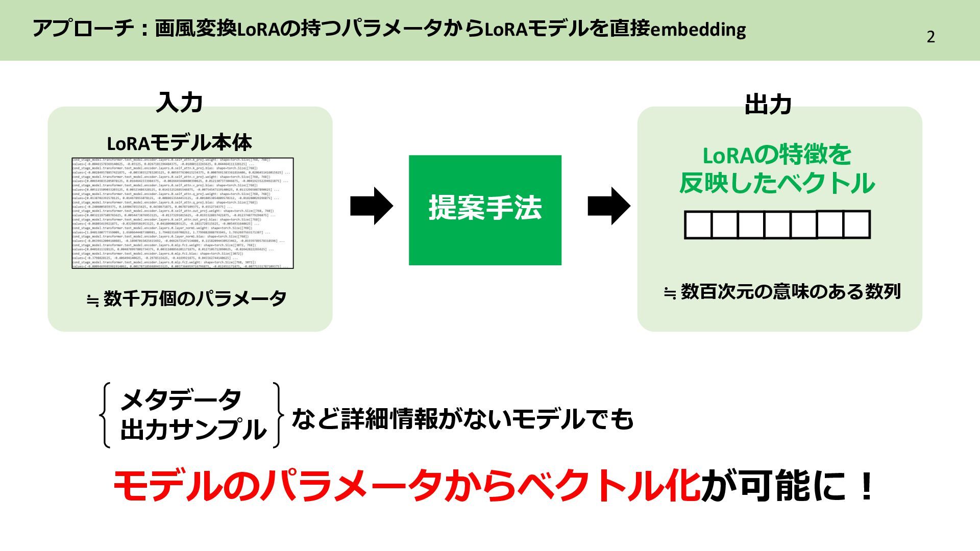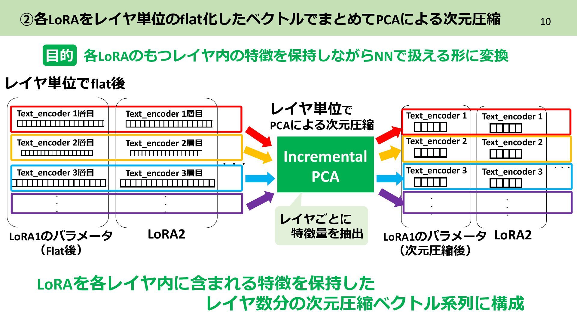2層目 Text_encoder 3層目 ➁各LoRAをレイヤ単位のflat化したベクトルでまとめてPCAによる次元圧縮 レイヤ単位で PCAによる次元圧縮 LoRAを各レイヤ内に含まれる特徴を保持した レイヤ数分の次元圧縮ベクトル系列に構成 ・ ・ ・ Text_encoder 1層目 Text_encoder 2層目 Text_encoder 3層目 LoRA2 ・・・ Incremental PCA ・ ・ ・ Text_encoder 1 Text_encoder 2 Text_encoder 3 LoRA1のパラメータ (次元圧縮後) ・ ・ ・ Text_encoder 1 Text_encoder 2 Text_encoder 3 ・・・ LoRA2 レイヤごとに 特徴量を抽出 目的 各LoRAのもつレイヤ内の特徴を保持しながらNNで扱える形に変換