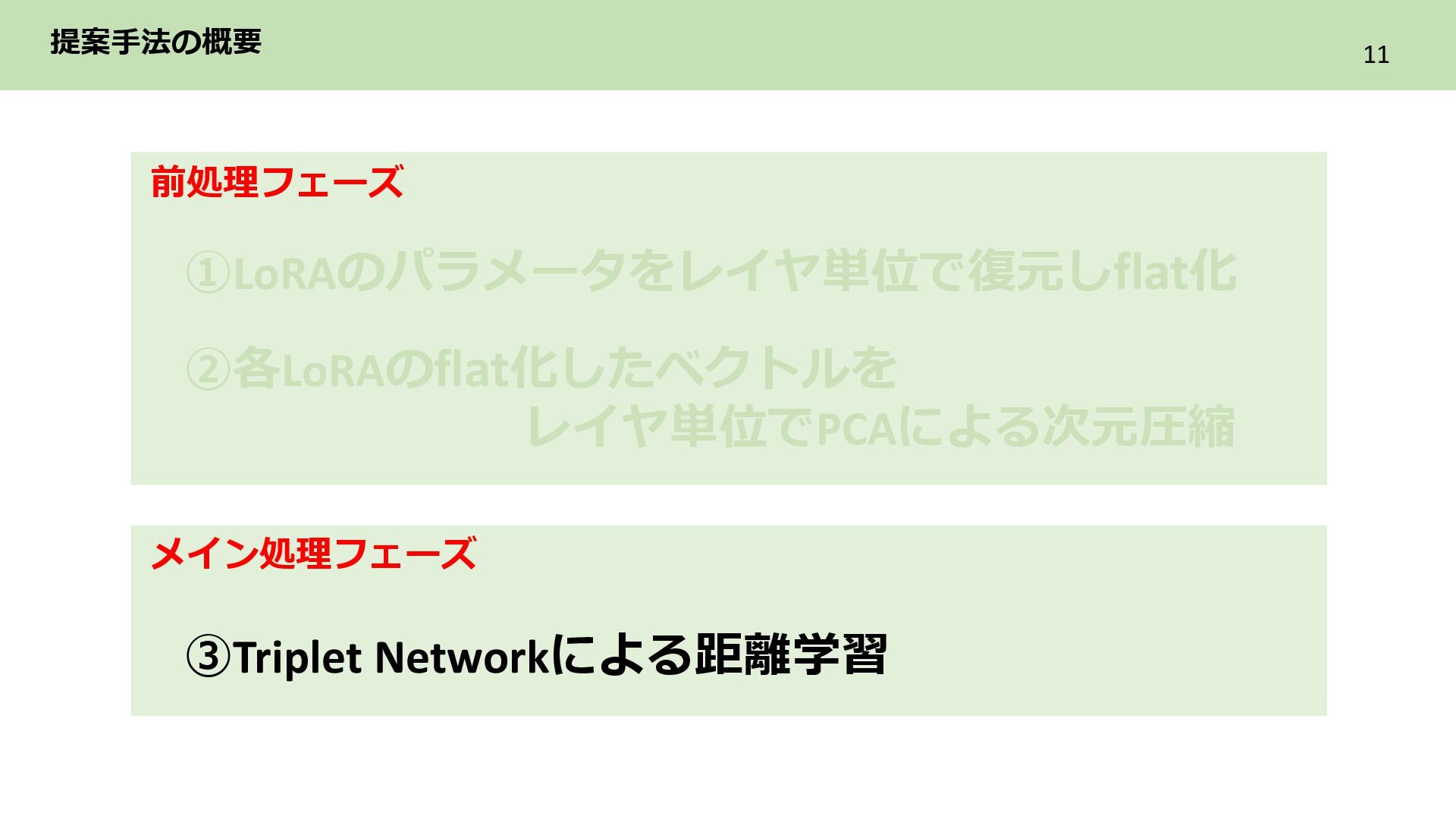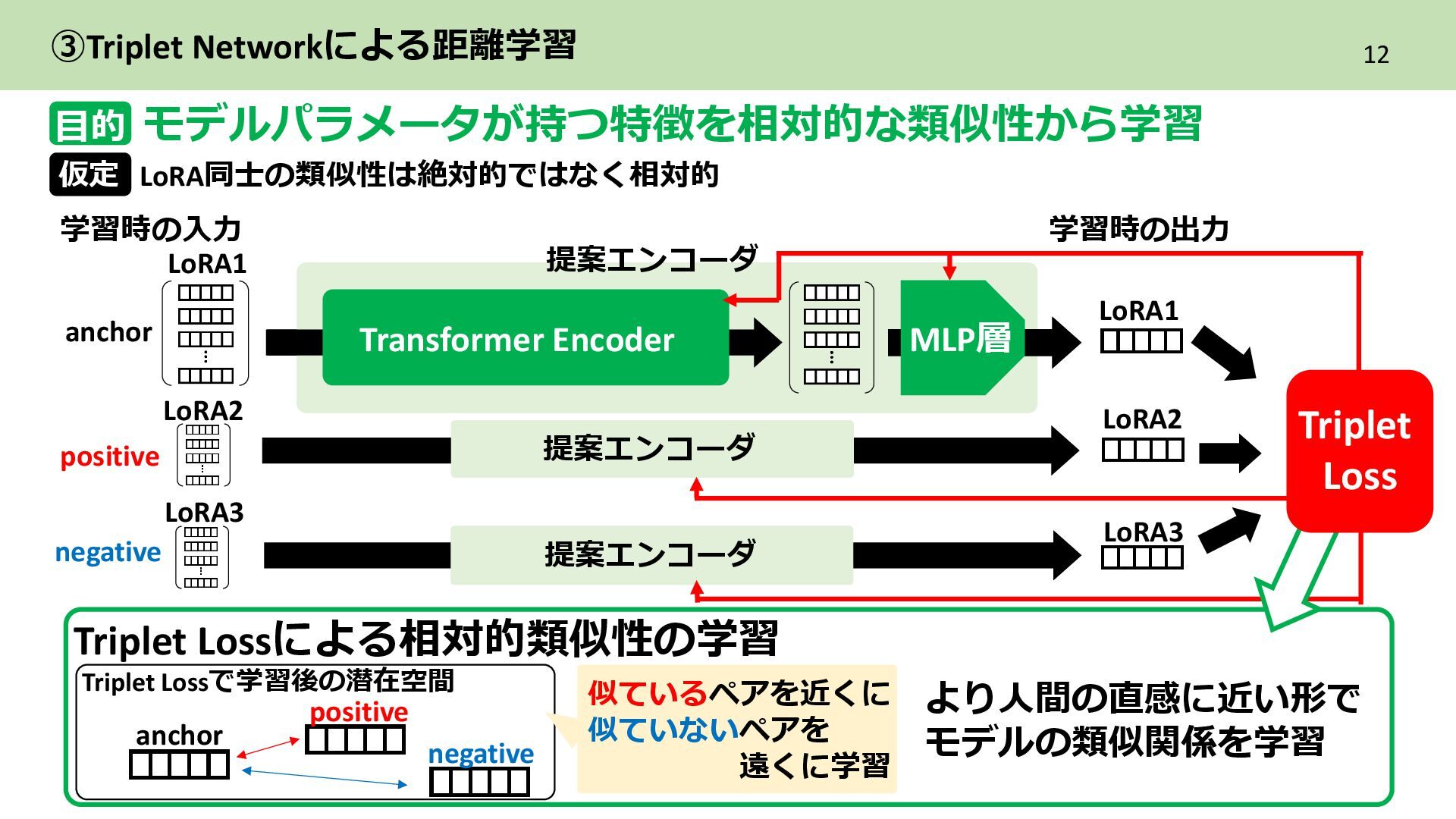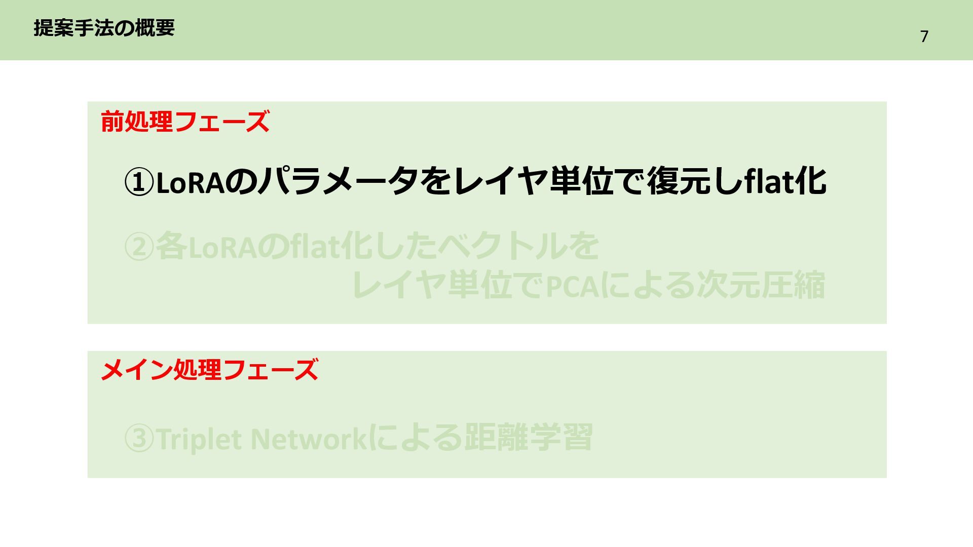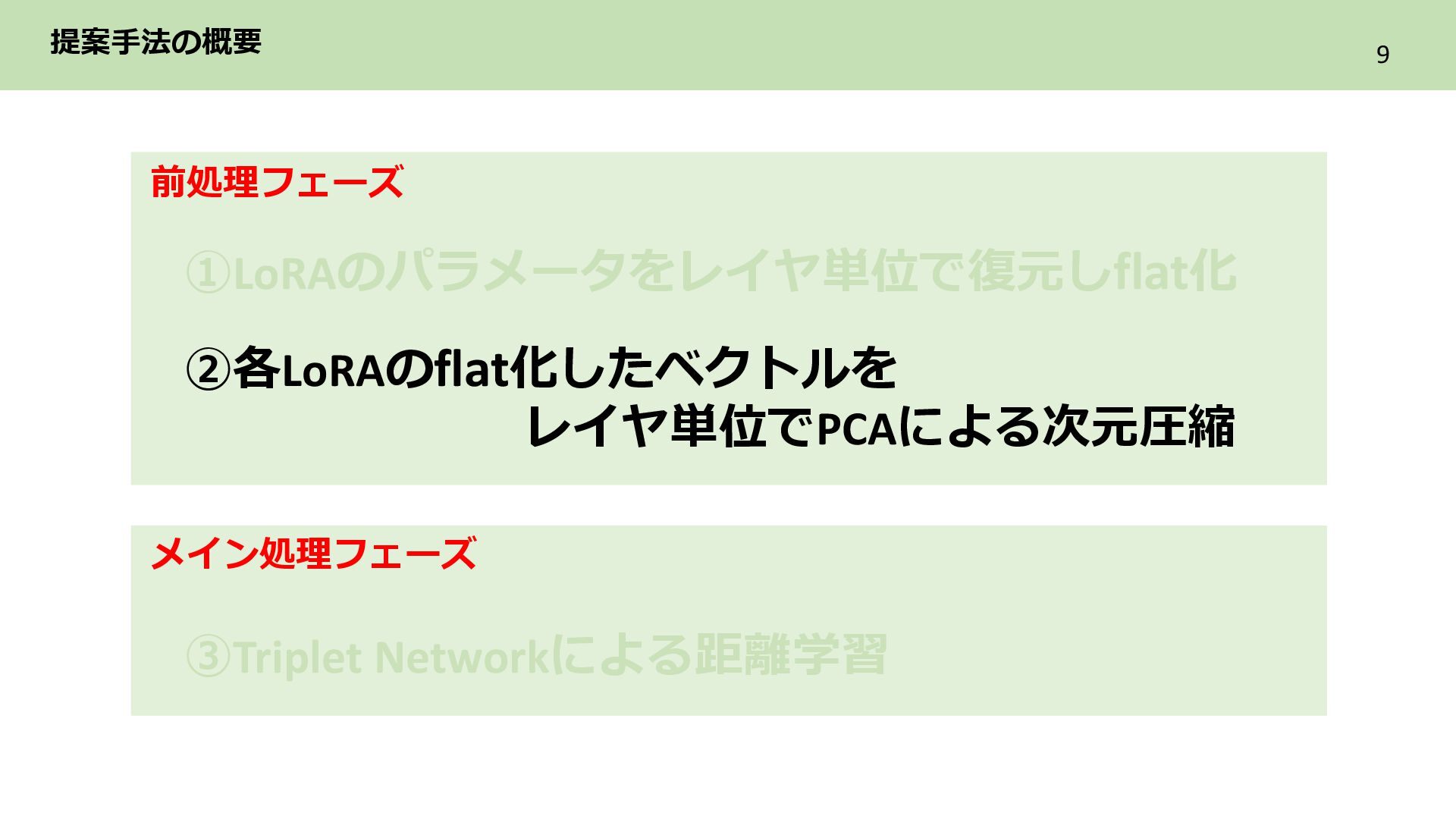 2層目 Text_encoder 3層目 ➁各LoRAをレイヤ単位のflat化したベクトルでまとめてPCAによる次元圧縮 レイヤ単位で PCAによる次元圧縮 LoRAを各レイヤ内に含まれる特徴を保持した レイヤ数分の次元圧縮ベクトル系列に構成 ・ ・ ・ Text_encoder 1層目 Text_encoder 2層目 Text_encoder 3層目 LoRA2 ・・・ Incremental PCA ・ ・ ・ Text_encoder 1 Text_encoder 2 Text_encoder 3 LoRA1のパラメータ (次元圧縮後) ・ ・ ・ Text_encoder 1 Text_encoder 2 Text_encoder 3 ・・・ LoRA2 レイヤごとに 特徴量を抽出 目的 各LoRAのもつレイヤ内の特徴を保持しながらNNで扱える形に変換