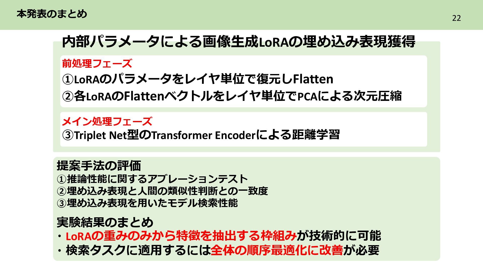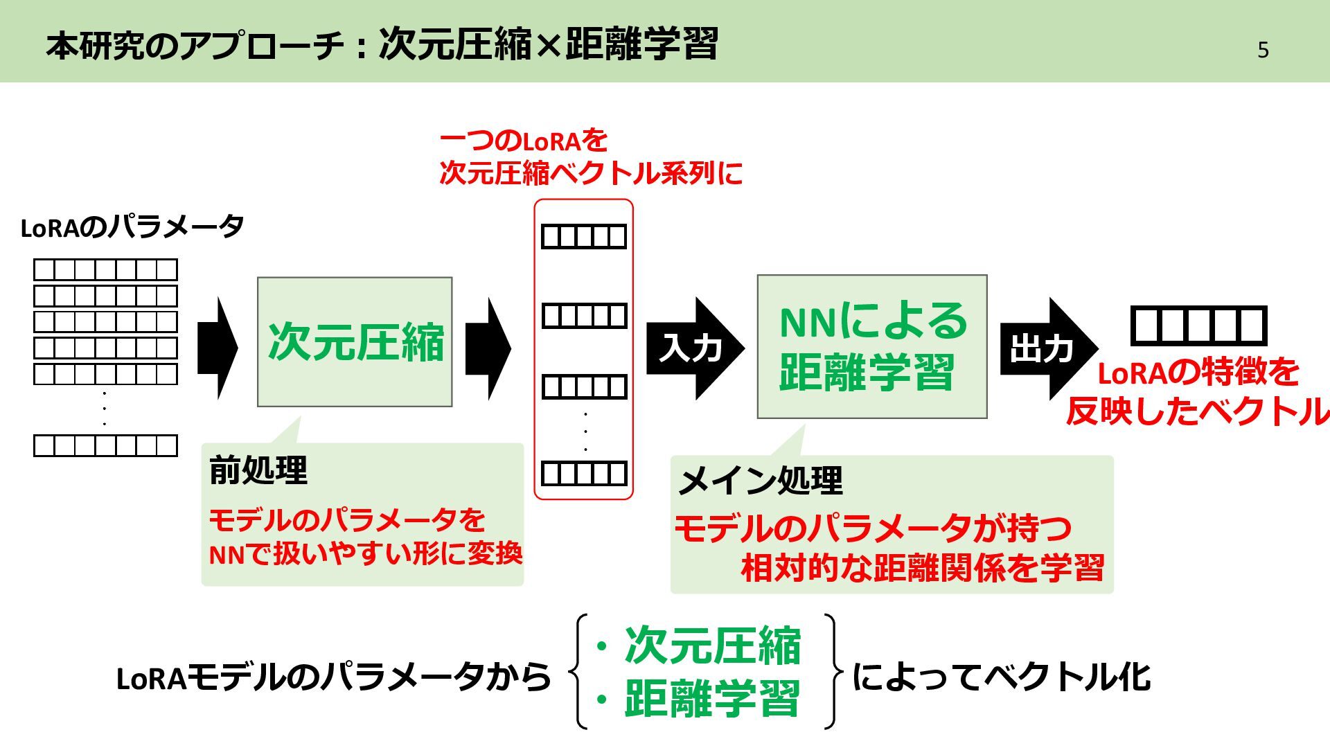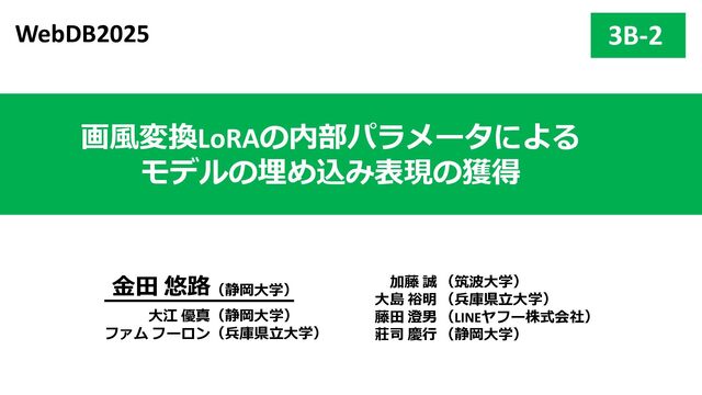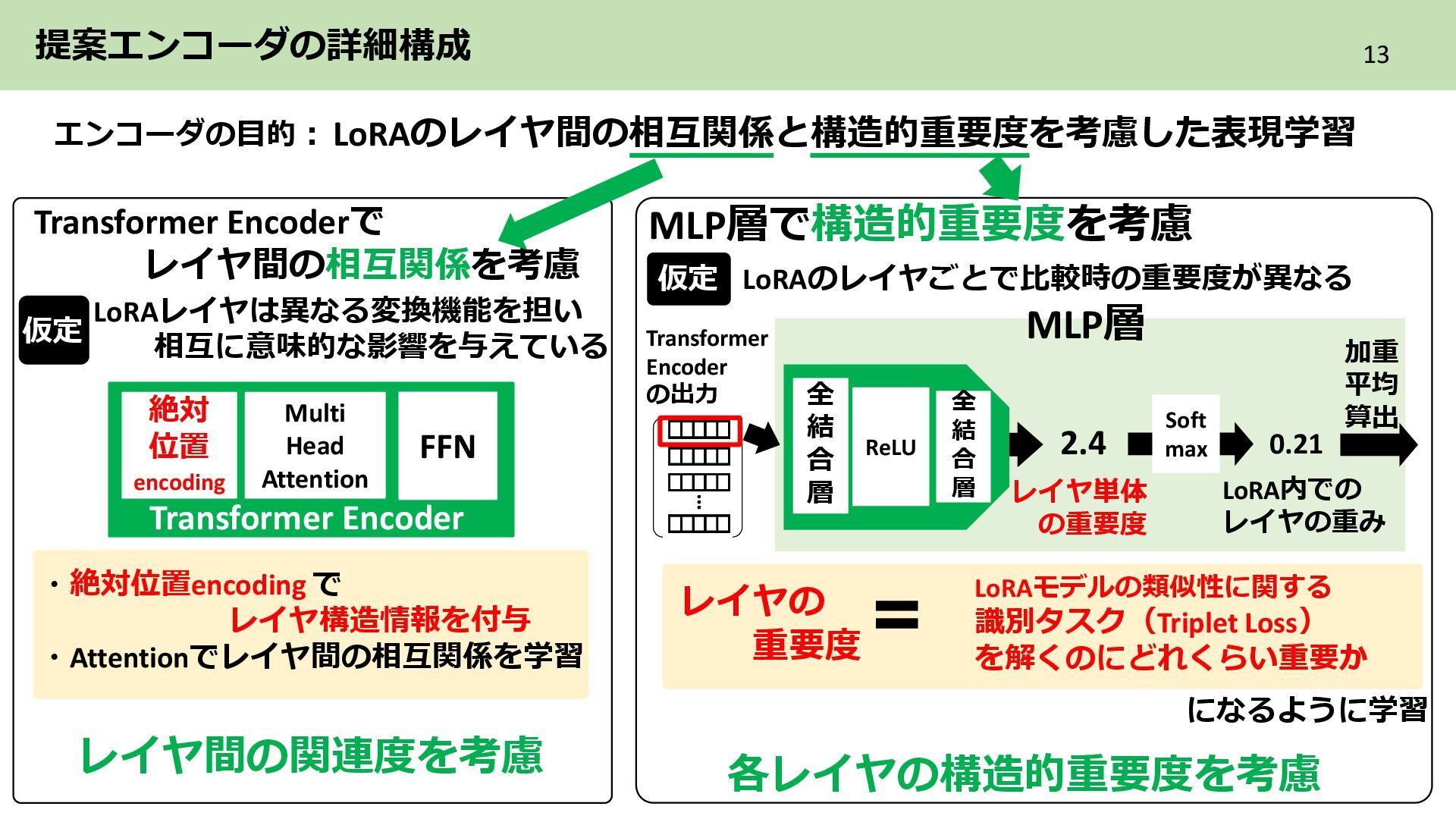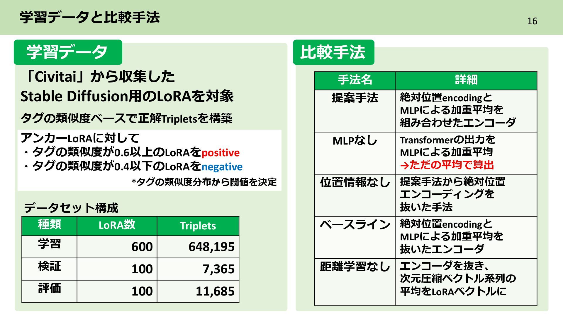 2層目 Text_encoder 3層目 ➁各LoRAをレイヤ単位のflat化したベクトルでまとめてPCAによる次元圧縮 レイヤ単位で PCAによる次元圧縮 LoRAを各レイヤ内に含まれる特徴を保持した レイヤ数分の次元圧縮ベクトル系列に構成 ・ ・ ・ Text_encoder 1層目 Text_encoder 2層目 Text_encoder 3層目 LoRA2 ・・・ Incremental PCA ・ ・ ・ Text_encoder 1 Text_encoder 2 Text_encoder 3 LoRA1のパラメータ (次元圧縮後) ・ ・ ・ Text_encoder 1 Text_encoder 2 Text_encoder 3 ・・・ LoRA2 レイヤごとに 特徴量を抽出 目的 各LoRAのもつレイヤ内の特徴を保持しながらNNで扱える形に変換