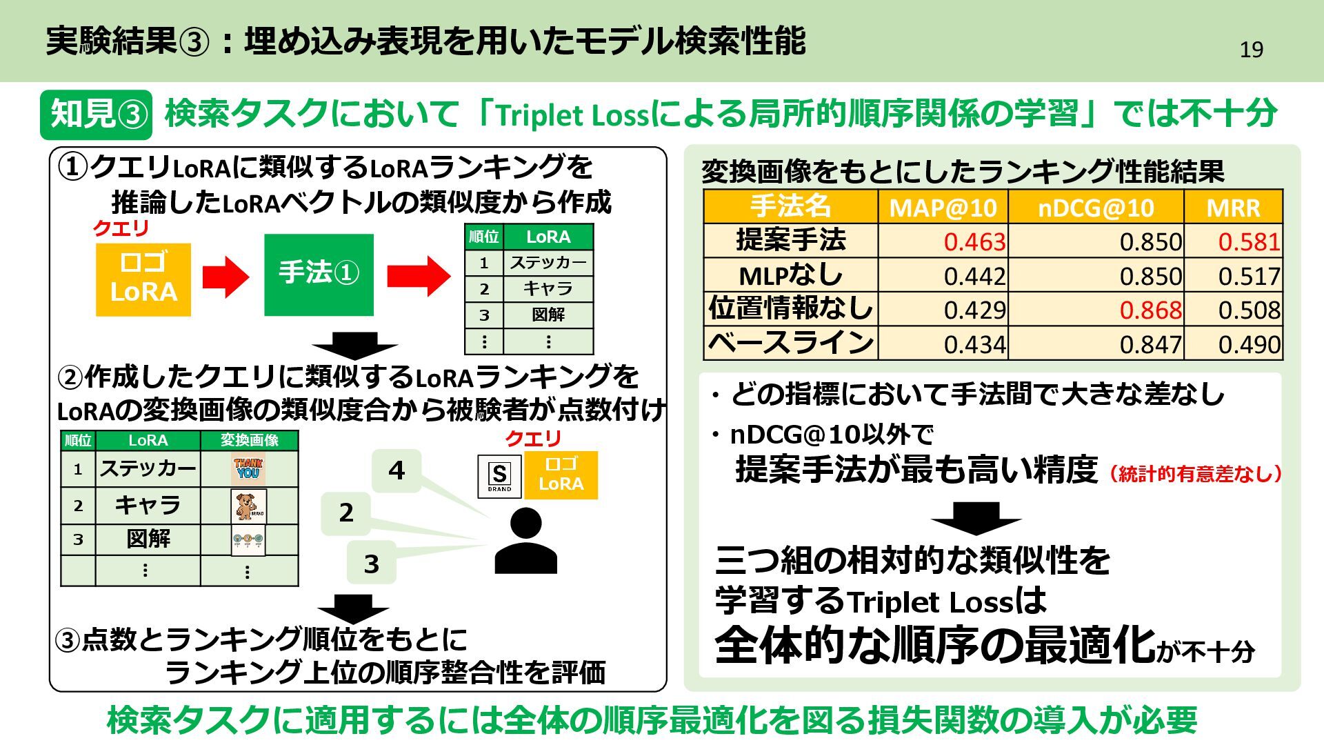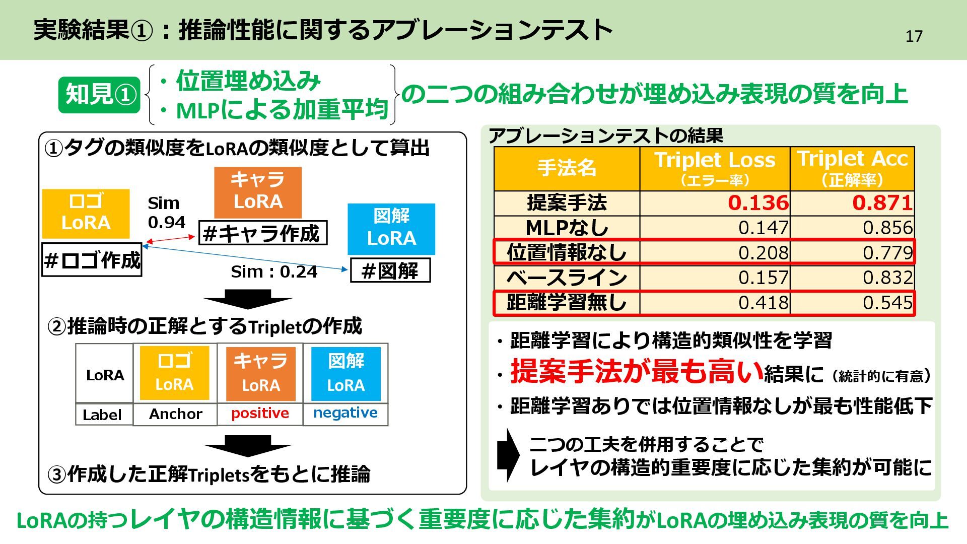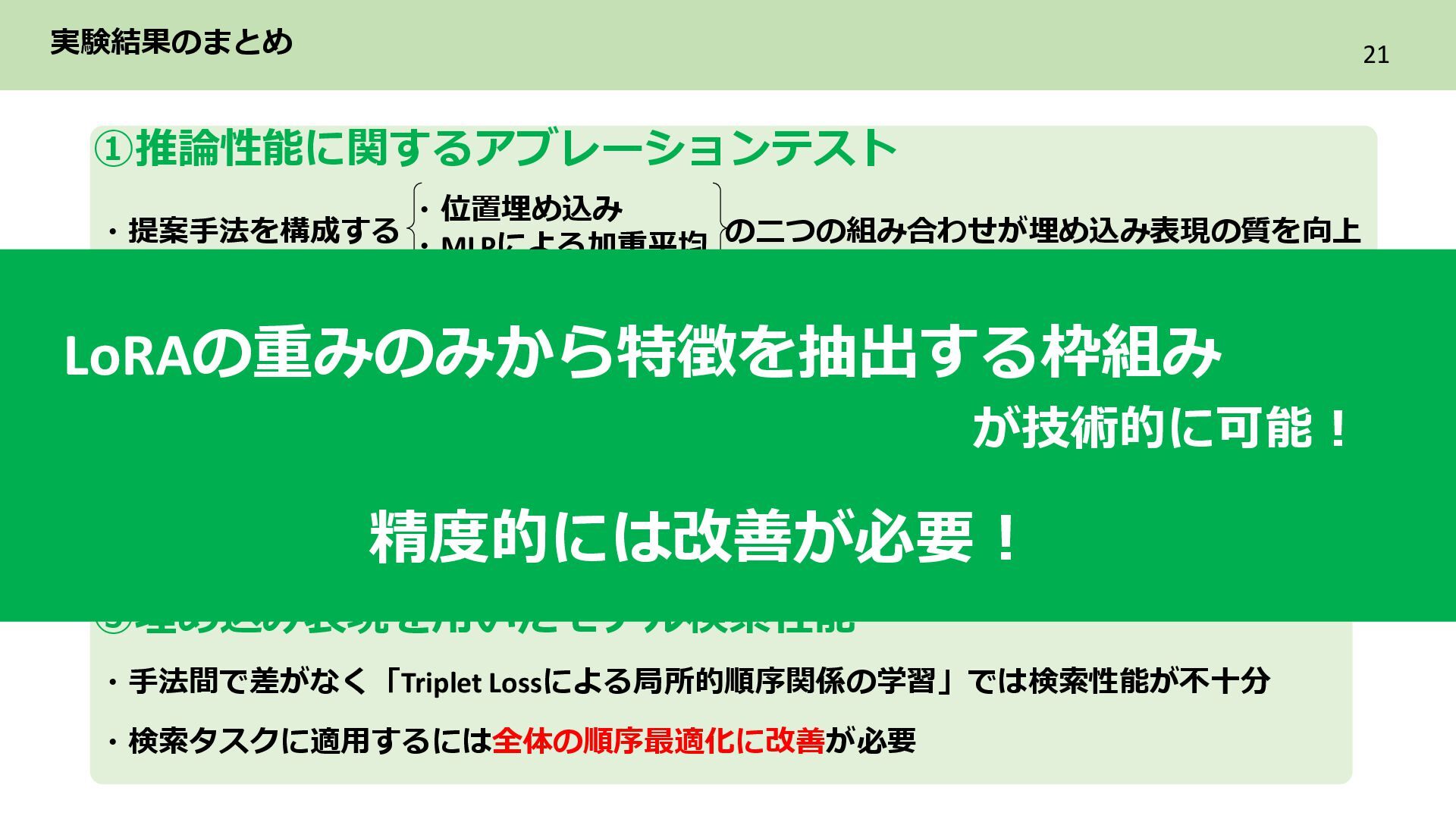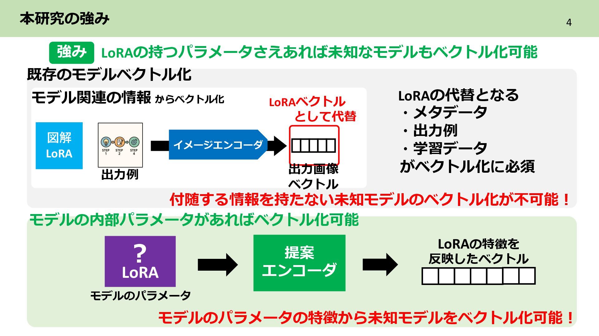 2層目 Text_encoder 3層目 ➁各LoRAをレイヤ単位のflat化したベクトルでまとめてPCAによる次元圧縮 レイヤ単位で PCAによる次元圧縮 LoRAを各レイヤ内に含まれる特徴を保持した レイヤ数分の次元圧縮ベクトル系列に構成 ・ ・ ・ Text_encoder 1層目 Text_encoder 2層目 Text_encoder 3層目 LoRA2 ・・・ Incremental PCA ・ ・ ・ Text_encoder 1 Text_encoder 2 Text_encoder 3 LoRA1のパラメータ (次元圧縮後) ・ ・ ・ Text_encoder 1 Text_encoder 2 Text_encoder 3 ・・・ LoRA2 レイヤごとに 特徴量を抽出 目的 各LoRAのもつレイヤ内の特徴を保持しながらNNで扱える形に変換