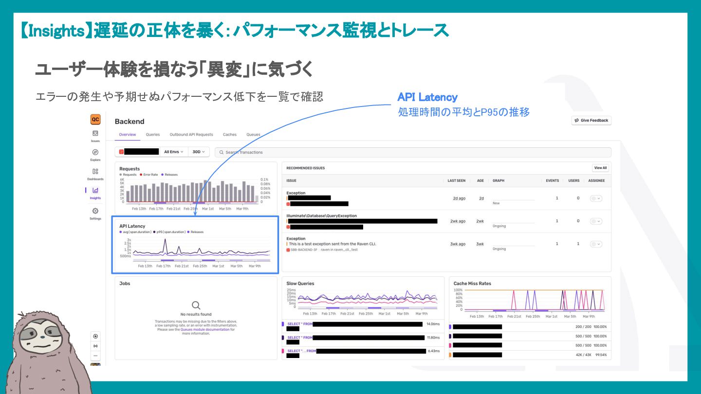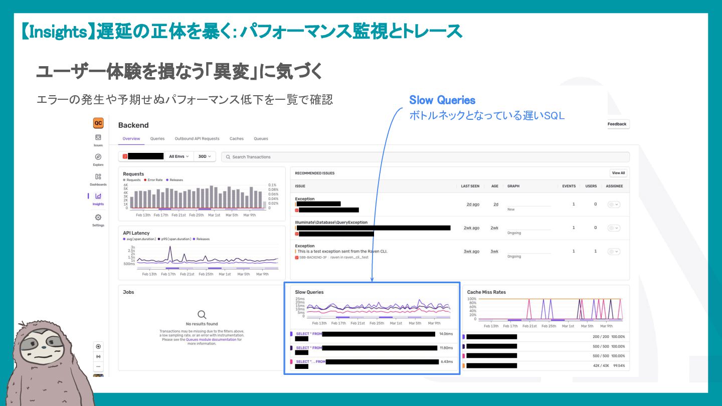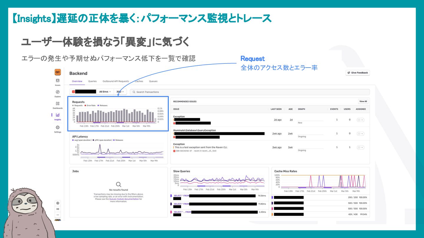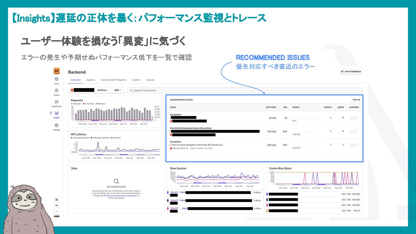 LaravelアプリケーションでSentryを活用し、エラー検知から通知最適化、パフォーマンス監視、AIによる調査効率化までを解説。開発現場のボトルネックを可視化し改善する方法を紹介。