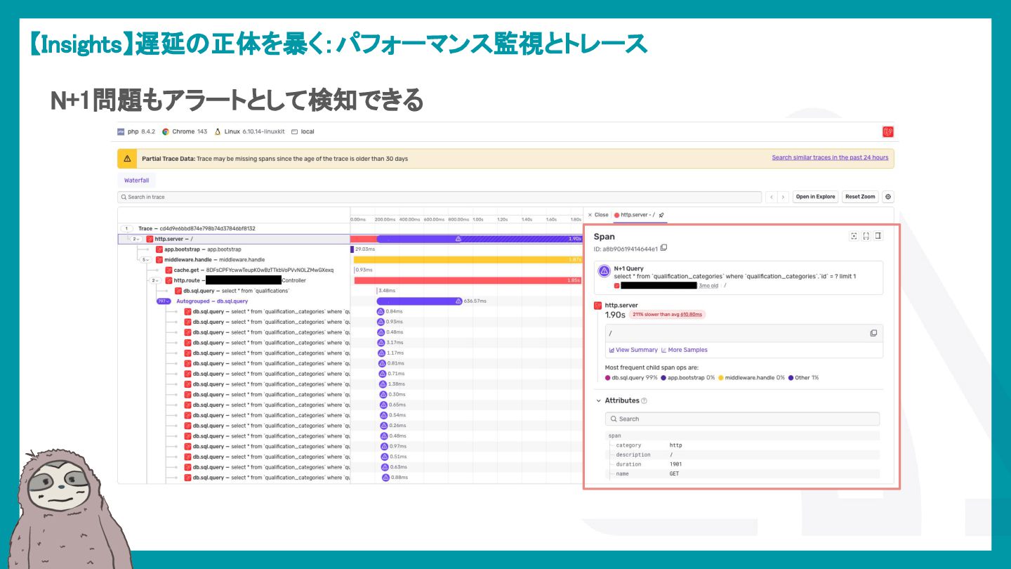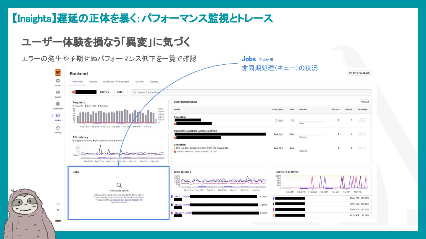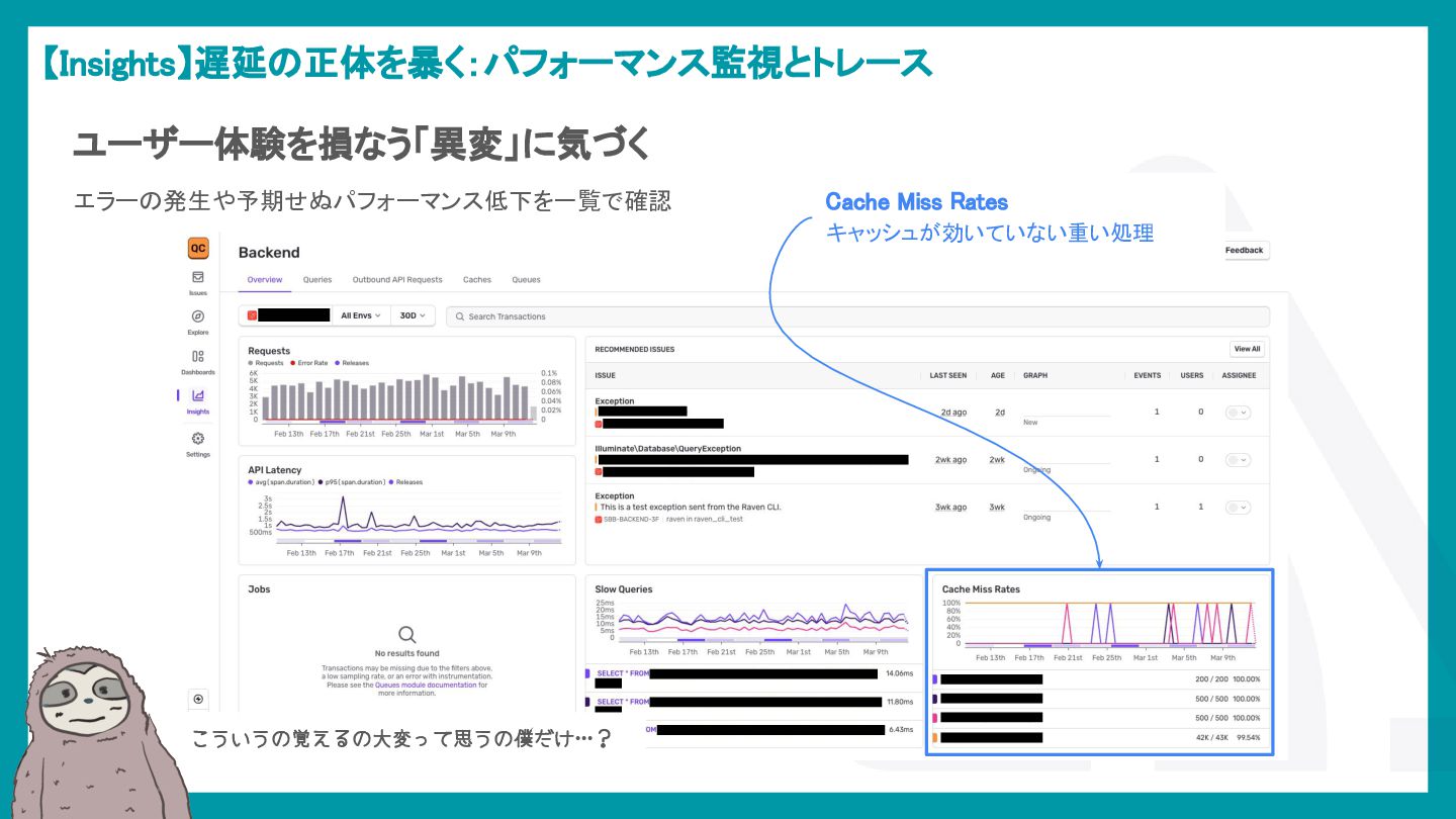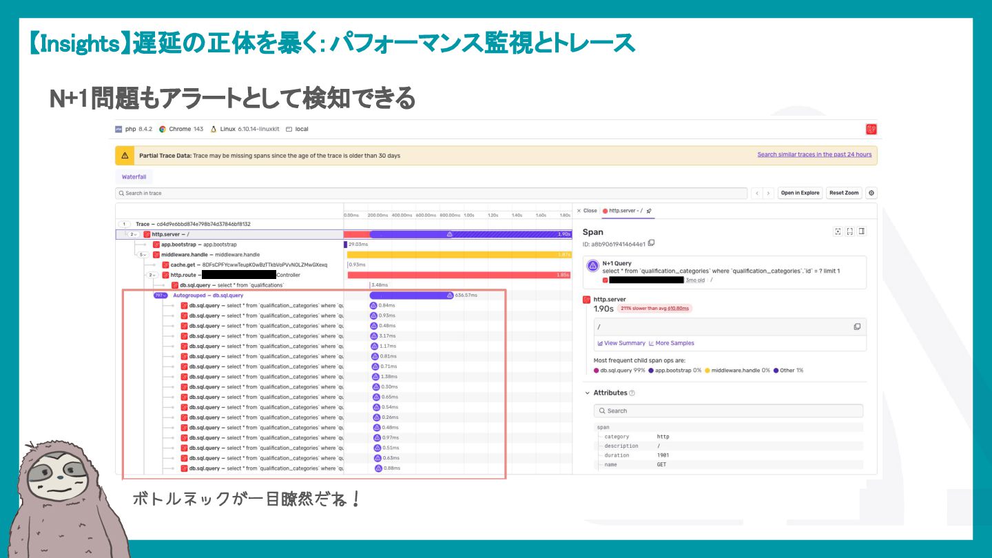 LaravelアプリケーションでSentryを活用し、エラー検知から通知最適化、パフォーマンス監視、AIによる調査効率化までを解説。開発現場のボトルネックを可視化し改善する方法を紹介。