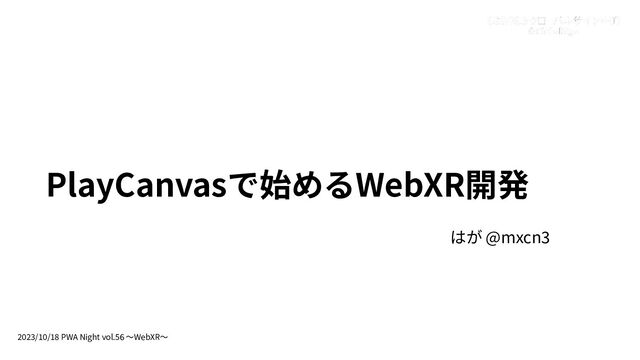 id=“application”></canvas> // 2. JavaScriptでPlayCanvas エンジン読み込み <script src=“https://code.playcanvas.com/playcanvas-stable.min.js”></script> // 3. PlayCanvas Engineの初期化 const canvas = document.getElementById(“application”) // canvasをIDからDOMから取得 const app = new pc.Application(canvas, {}); //PlayCanvasのエンジンを初期化 app.start() // メインループの開始 // 4. シーン上にキューブを100個配置 (コードの変更点) const camera = new pc.Entity(“camera”); // カメラ エンティティ(オブジェクト)を作成 camera.addComponent(“camera”, {clearColor: new pc.Color(0.5, 0.5, 0.5)}); // 「camera」コンポーネントを追加 const light = new pc.Entity(“light”); // ライト エンティティ(オブジェクト)を作成 light.addComponent(“light”); // 「light」コンポーネントを追加 app.root.addChild(camera); // シーンにカメラエンティティを追加 app.root.addChild(light); // シーンにライトエンティティを追加 const cube = new pc.Entity(“cube”); // キューブ エンティティ(オブジェクト)を作成 cube.addComponent(“render”, {type: “box”}}); // 「render」コンポーネントを追加 app.root.addChild(cube); // シーンにキューブのエンティティを追加 PlayCanvas EngineでHello, World ! (デモ 2 )表⽰されるキューブの数を増やす このコードではキューブが1つシーンに表⽰される const SIZE = 10; for (const index = 0; index < SIZE * SIZE ; index++) { // 10 x 10のキューブを⽣成するためのループ処理 const x = 2 * (index % SIZE) - SIZE; // xの位置を計算 const z = 2 * Math.floor( index / SIZE) - SIZE; // yの位置を計算 const cube= new pc.Entity(); // 新しいキューブエンティティを作成 cube .addComponent(“render”, { type: “box” }); // ボックス型のレンダリングコンポーネントを追加 cube .translate(x, -1.5, z); // キューブの位置を設定 app.root.addChild(cube ); // キューブをシーンに追加 }