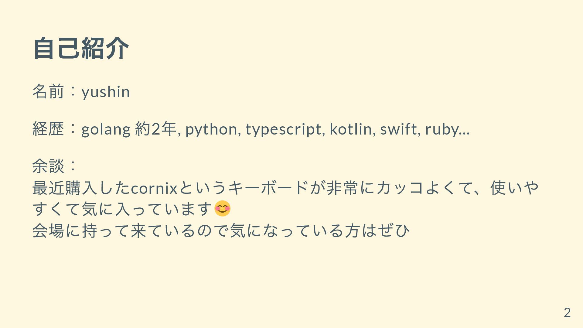 余談: 最近購入したcornix というキーボードが非常にカッコよくて、使いや すくて気に入っています 会場に持って来ているので気になっている方はぜひ 2