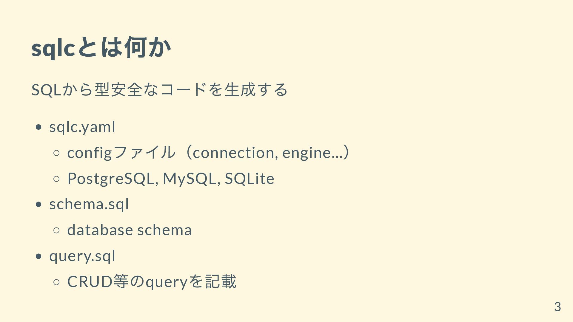 sqlc とは何か SQL から型安全なコードを生成する sqlc.yaml config ファイル(connection, engine... ) PostgreSQL,